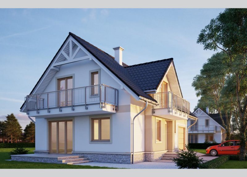 - Elewacje: wykończone tynkiem silikonowym, częściowo obłożone kamieniem naturalnym