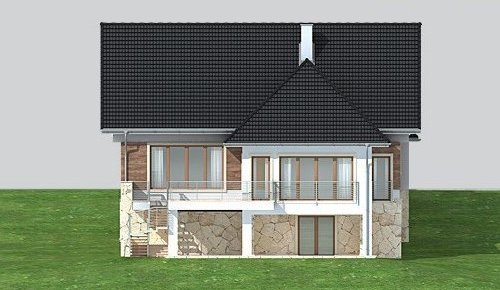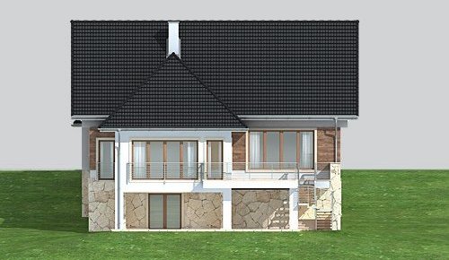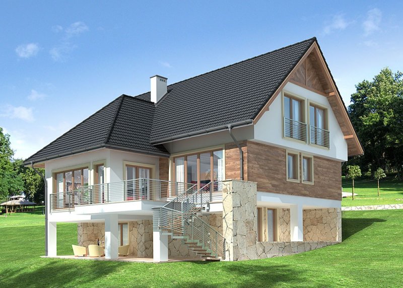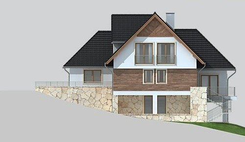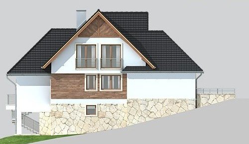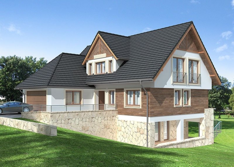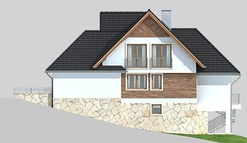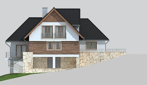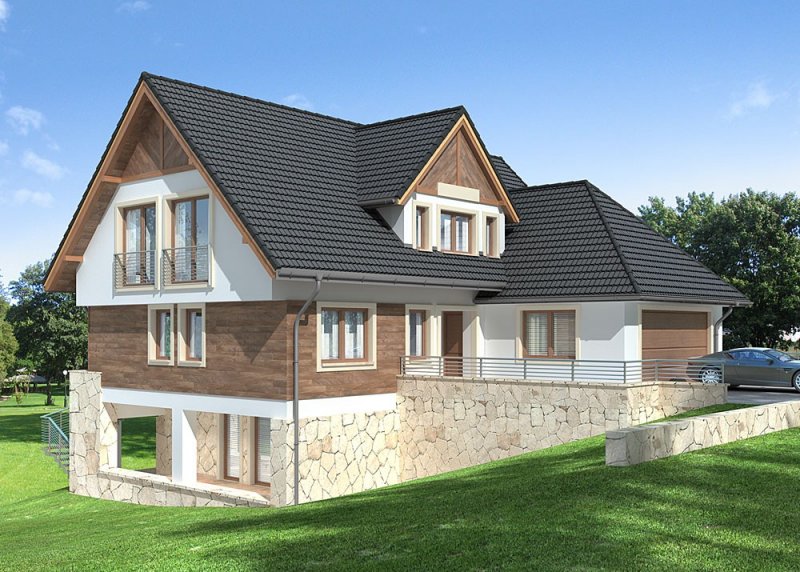 - Elewacje: wykończone tynkiem silikonowym, częściowo obłożone kamieniem naturalnym i i oblicówką drewnianą