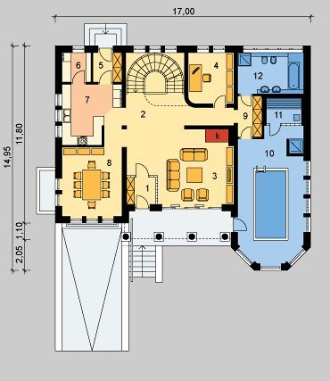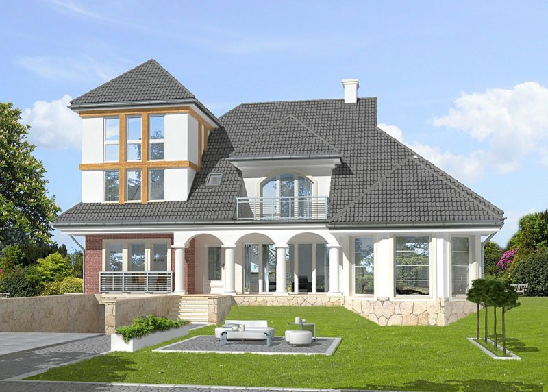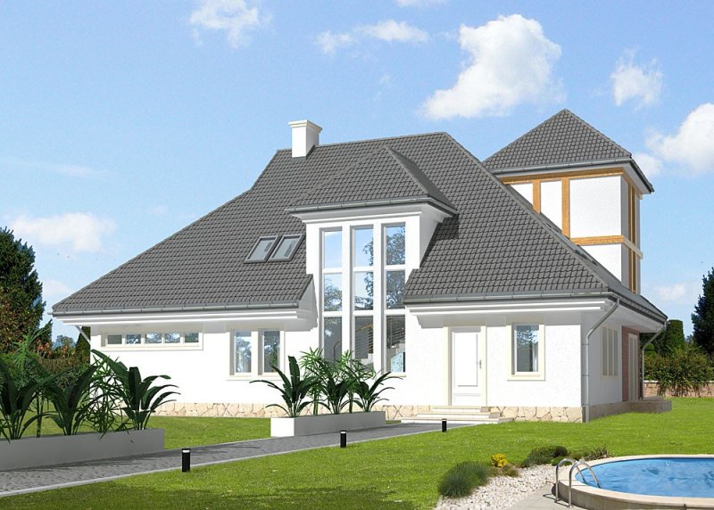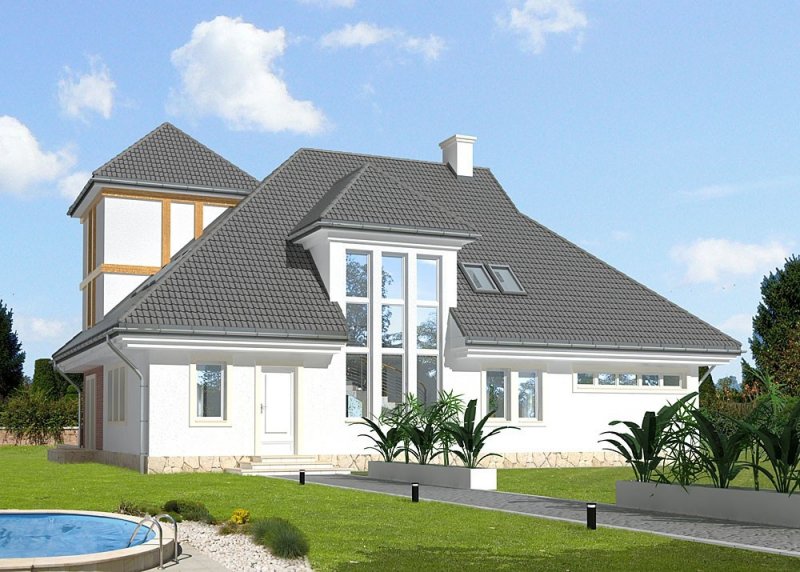 - Elewacje: wykończone tynkiem silikonowym, częściowo obłożone klinkierem i drewnem