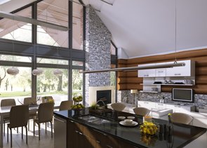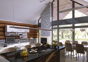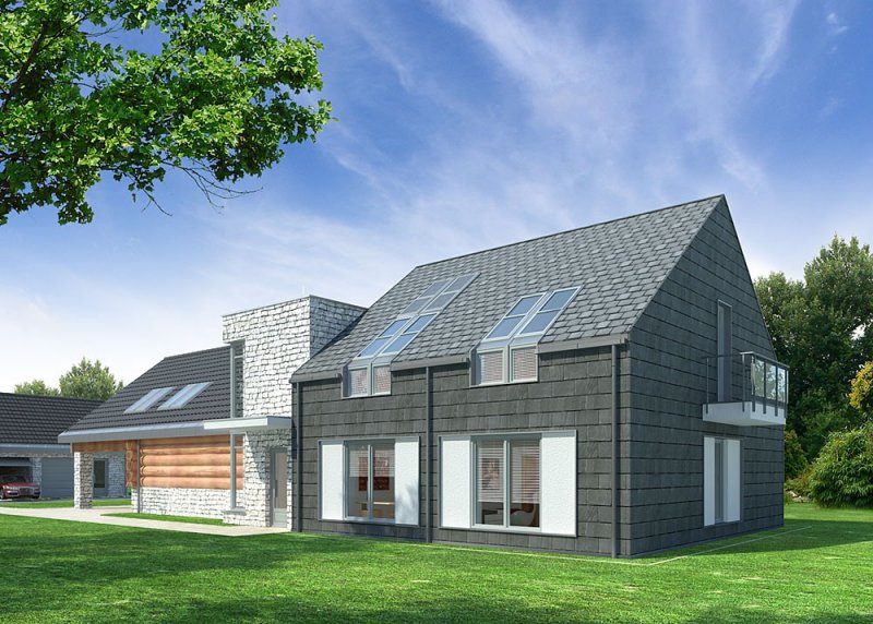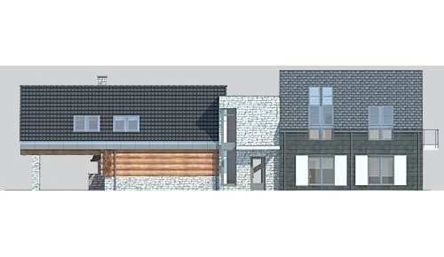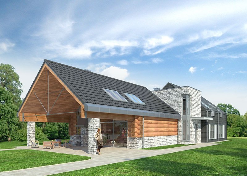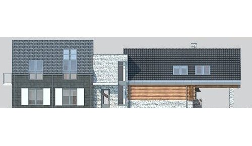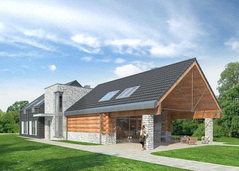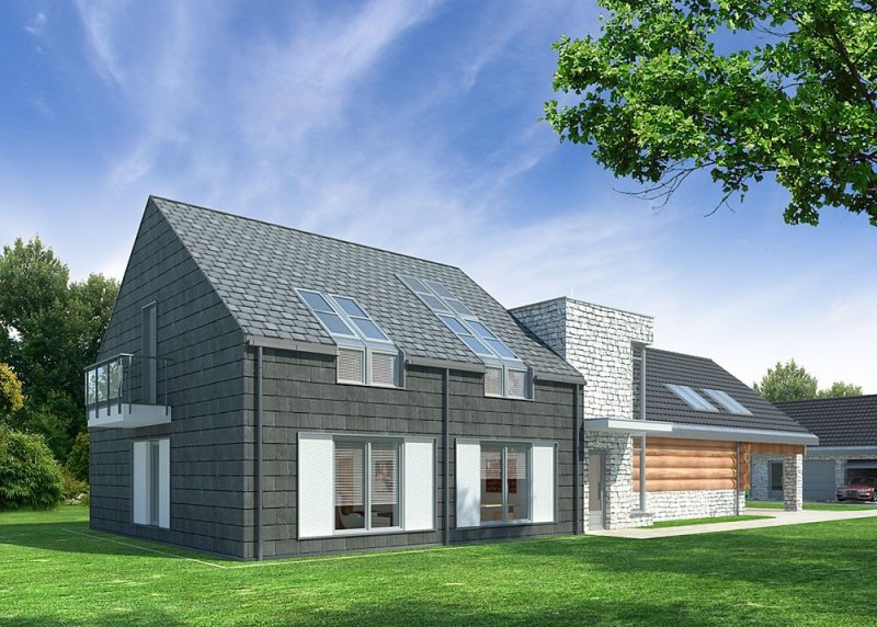 - Elewacje: wykończone kamieniem naturalnym oraz elewacyjnymi i dachowymi płytkami włókno-cementowymi