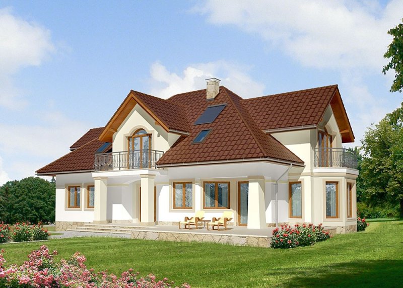 - Elewacje: wykończone tynkiem silikonowym, cokoły obłożone płytami kamiennymi