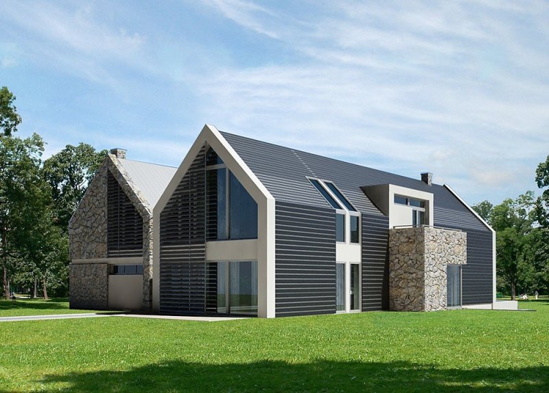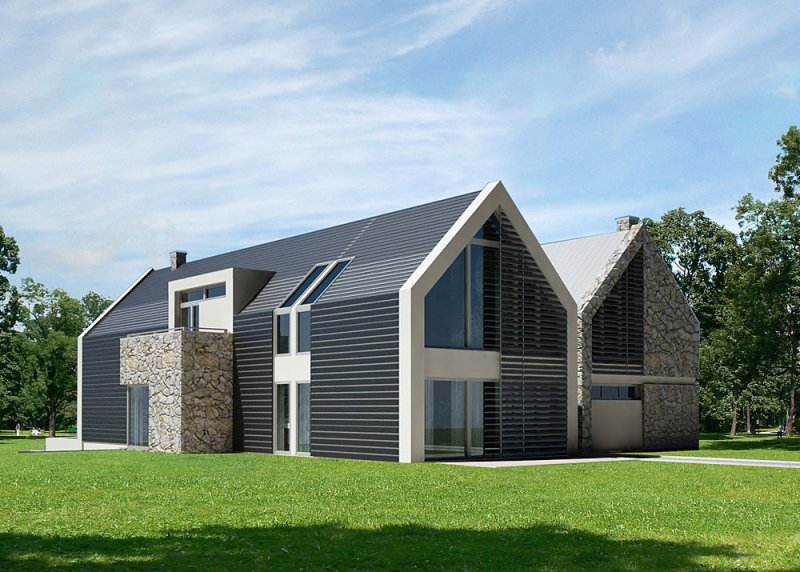 - Elewacje: budynek gospodarczy: wykończone naturalnym piaskowcem oraz białym tynkiem mineralnym, budynek główny: wykończone panelami i blachą aluminiową