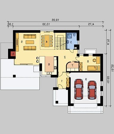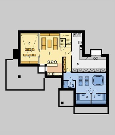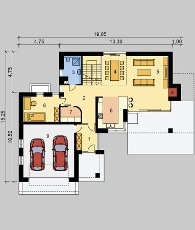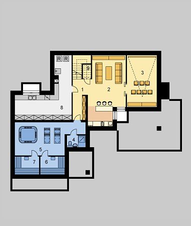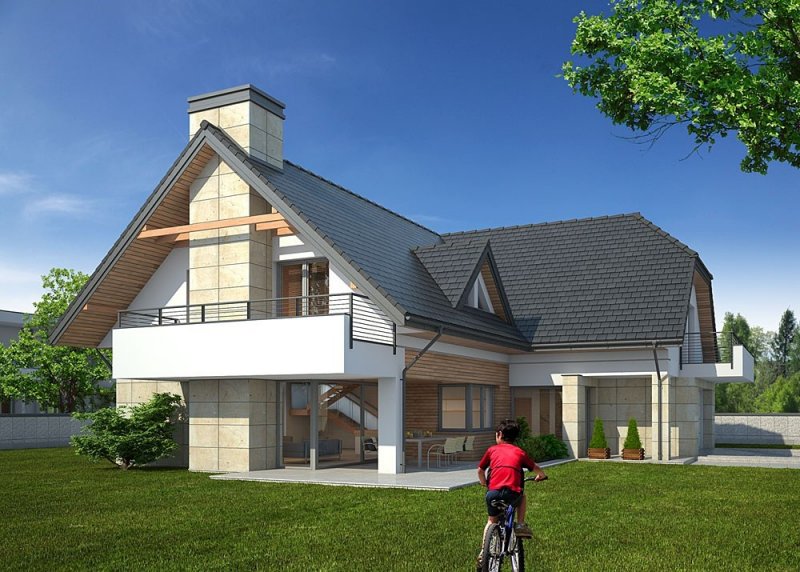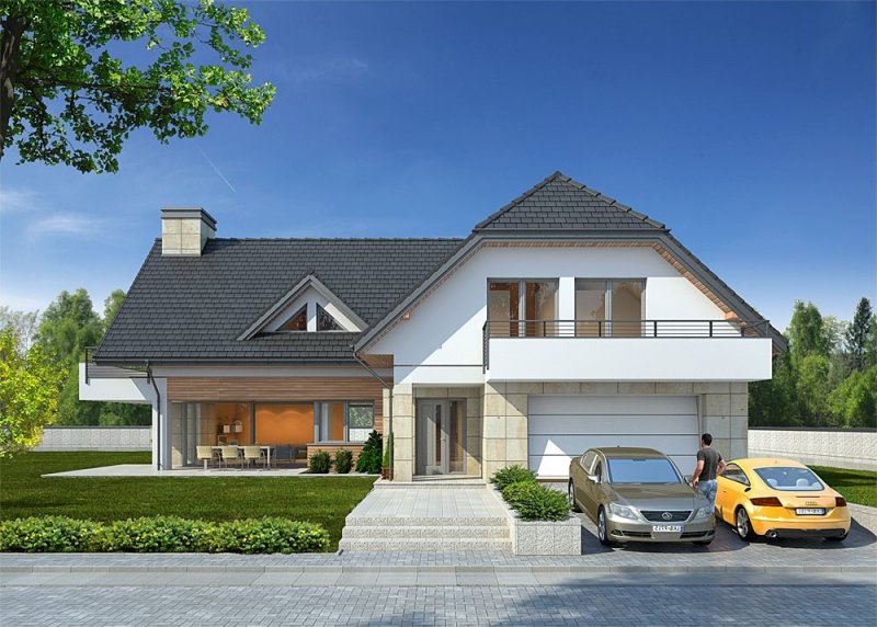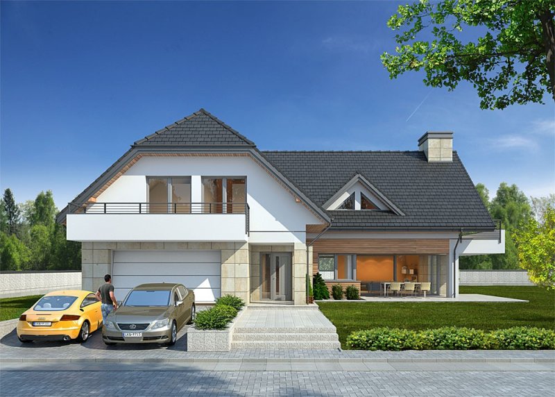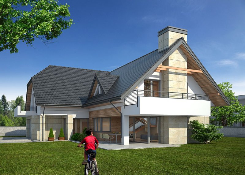 - Elewacje: wykończone tynkiem silikonowym, drewnem Moco oraz okładziną kamienną