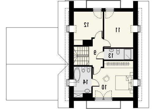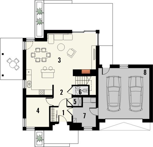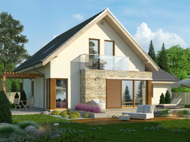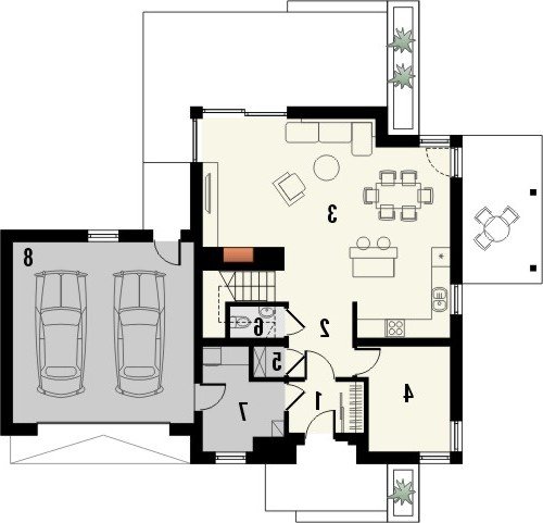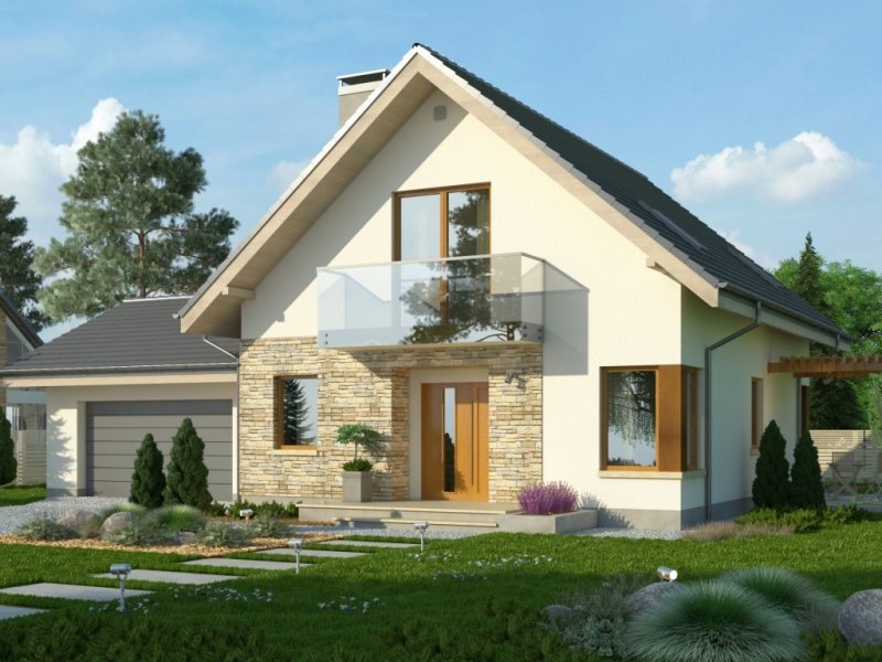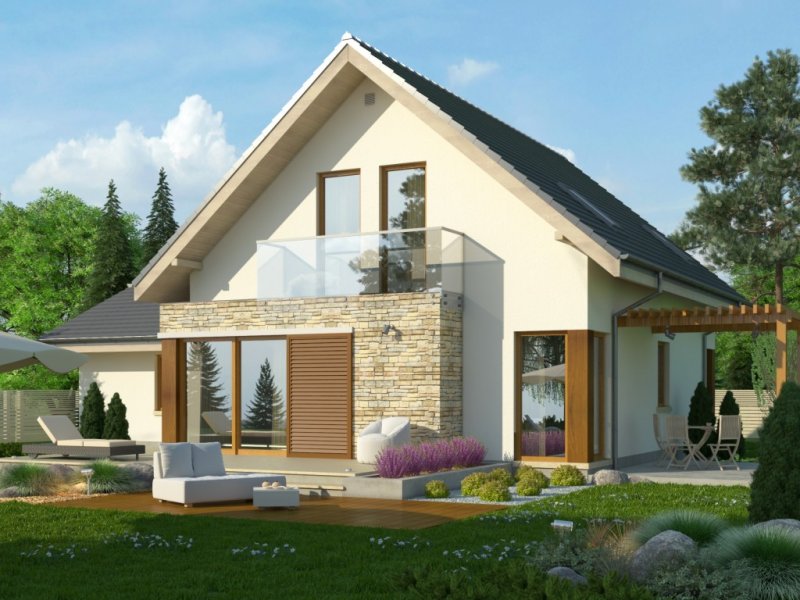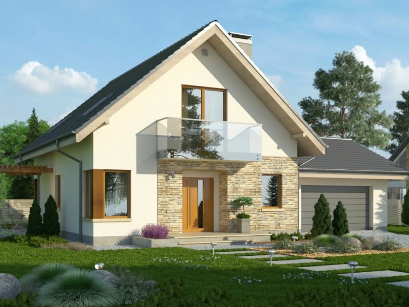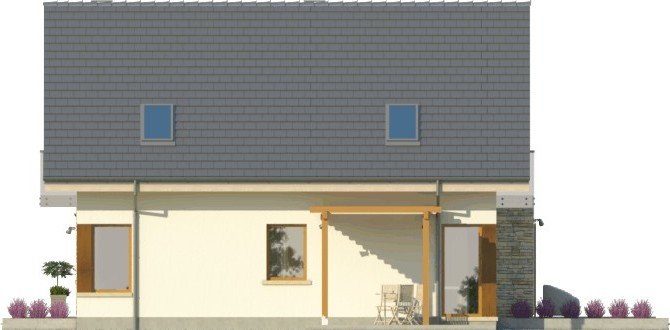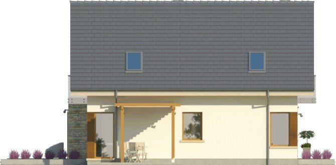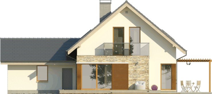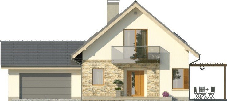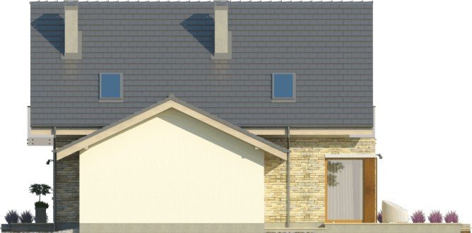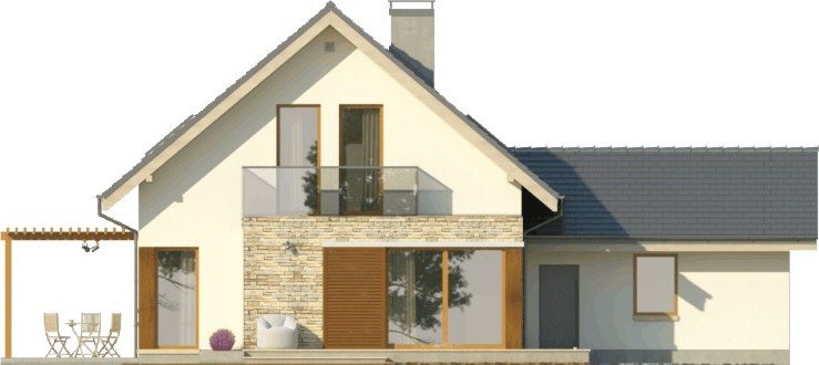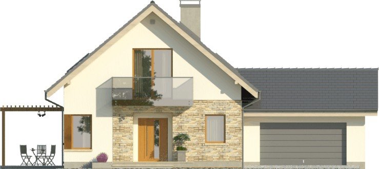 Dom z poddaszem, z podwójnym garażem. Na parterze zaprojektowano duży pokój dzienny z otwartą kuchnią, wc, spiżarnię, dodatkowy pokój oraz pomieszczenie gospodarcze. Poddasze zajmują trzy sypialnie, z czego jedna z nich ma osobną łazienkę oraz wspólna łazienka z wejściem z hallu. Projekt do nabycia również w odbiciu lustrzanym.Prosty dom przykryty ekonomicznym dwuspadowym dachem. Duże okna doskonale doświetlają wnętrze domu, a pergola z wejściem do strefy dziennej jest charakterystycznym elementem tego budynku.