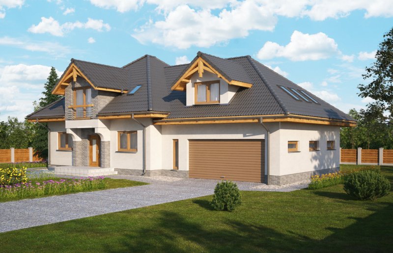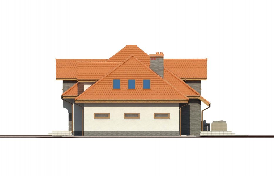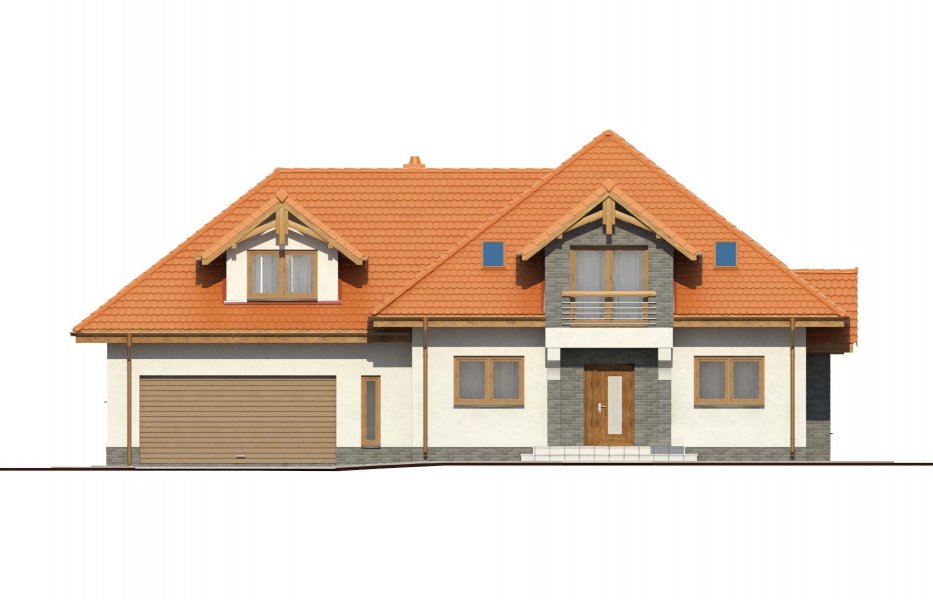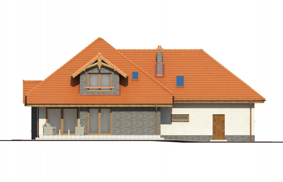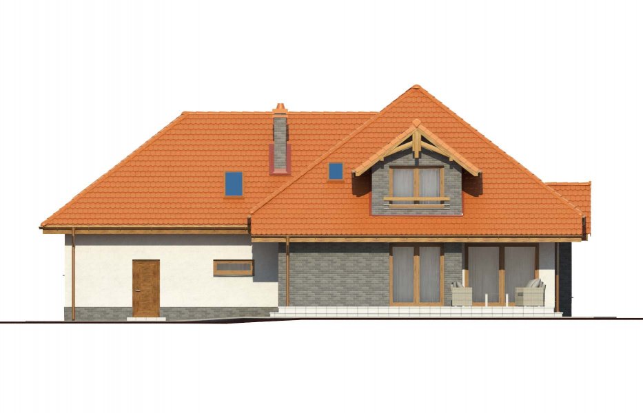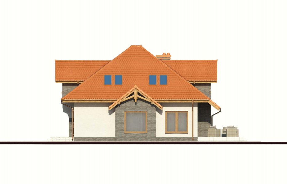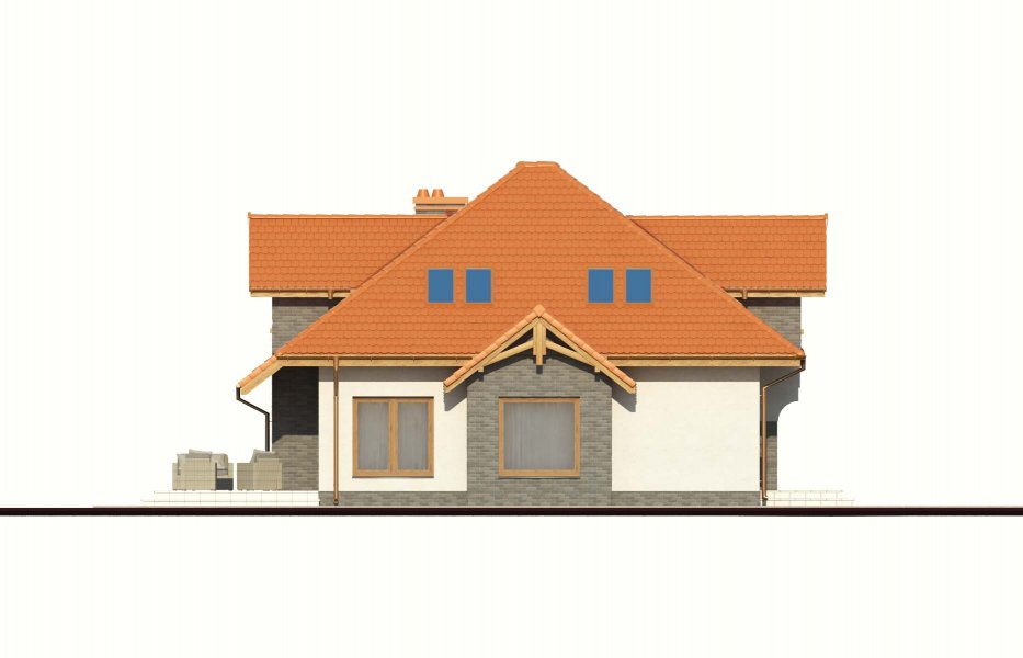 Magda 2G to przestronny, wygodny i elegancki dom parterowy z poddaszem użytkowym, przeznaczony dla 4-6 osobowej rodziny. Dach wielospadowy wraz z lukarnami nadaje budynkowi niepowtarzalny charakter. Parter stanowi serce całego domu, składa się z pokoju dziennego, który łączy ze sobą jadalnię, kącik kawowy i miejsce przy komiku. Kuchnia jest otwarta na salon, ale w zależności od potrzeb równie łatwo można ją od niego oddzielić. Zaprojektowany na parterze dodatkowy pokój może pełnić rolę pokoju gościnnego, gabinetu lub stanowić miejsce dla naszych dzieci. Będąc na parterze należy zwrócić uwagę na bardzo płynne połączenie opisanych wyżej pomieszczeń ze strefą gospodarczą domu, w tym z garażem. Poddasze to z kolei strefa należąca do gospodarzy domu. Znajdują się tu trzy komfortowe pokoje oraz przestronna sypialnia z własną łazienką oraz garderobą.