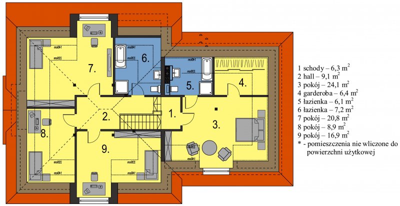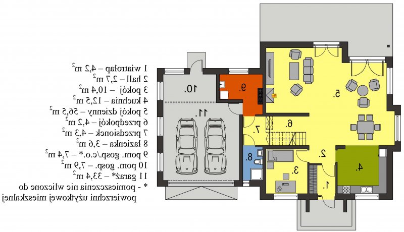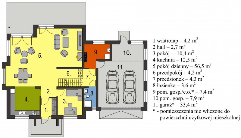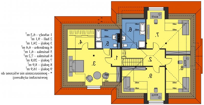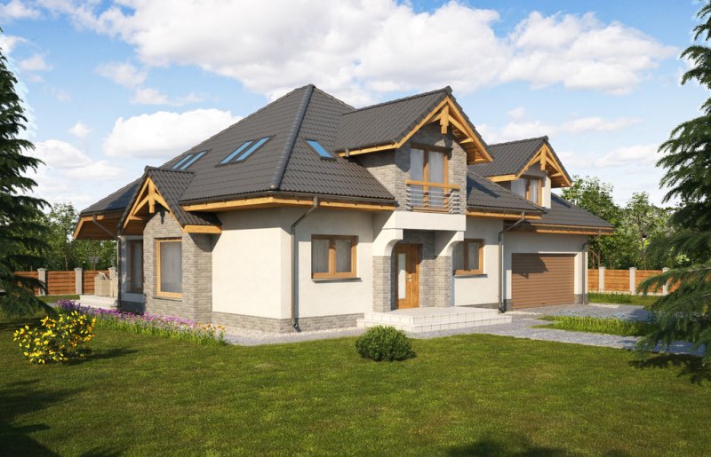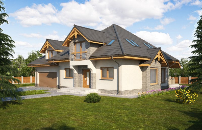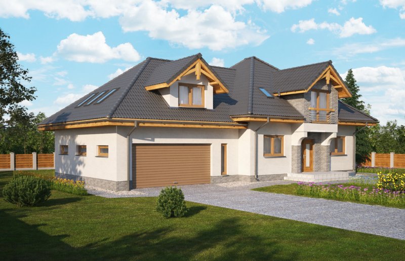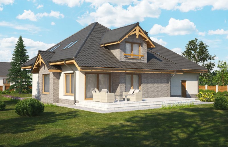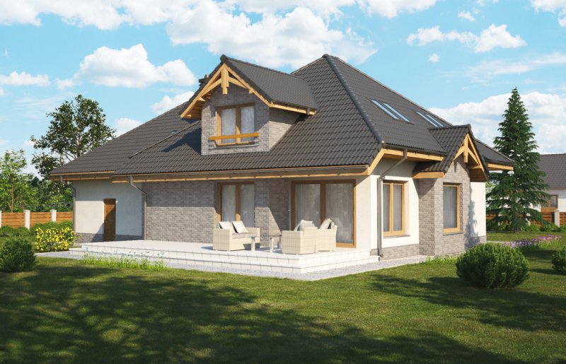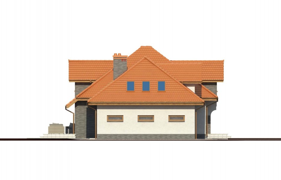 Magda 2G to przestronny, wygodny i elegancki dom parterowy z poddaszem użytkowym, przeznaczony dla 4-6 osobowej rodziny. Dach wielospadowy wraz z lukarnami nadaje budynkowi niepowtarzalny charakter. Parter stanowi serce całego domu, składa się z pokoju dziennego, który łączy ze sobą jadalnię, kącik kawowy i miejsce przy komiku. Kuchnia jest otwarta na salon, ale w zależności od potrzeb równie łatwo można ją od niego oddzielić. Zaprojektowany na parterze dodatkowy pokój może pełnić rolę pokoju gościnnego, gabinetu lub stanowić miejsce dla naszych dzieci. Będąc na parterze należy zwrócić uwagę na bardzo płynne połączenie opisanych wyżej pomieszczeń ze strefą gospodarczą domu, w tym z garażem. Poddasze to z kolei strefa należąca do gospodarzy domu. Znajdują się tu trzy komfortowe pokoje oraz przestronna sypialnia z własną łazienką oraz garderobą.
