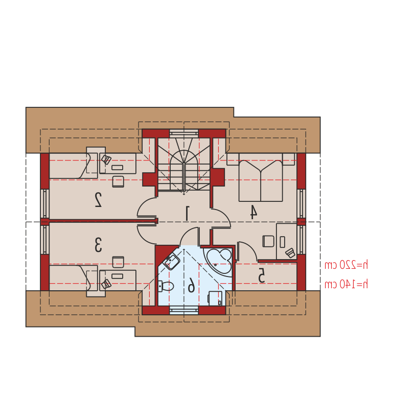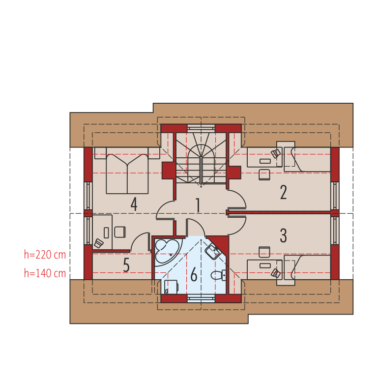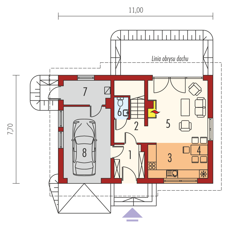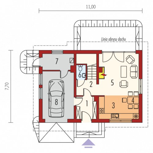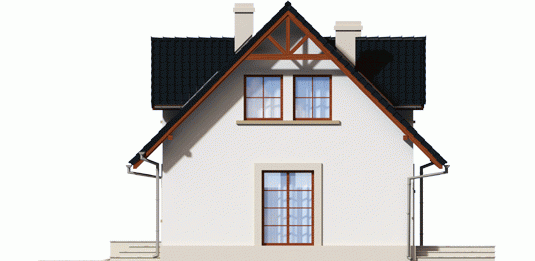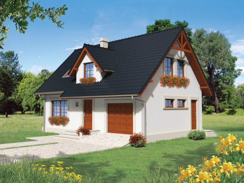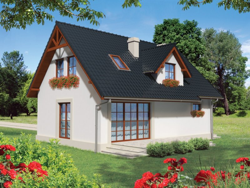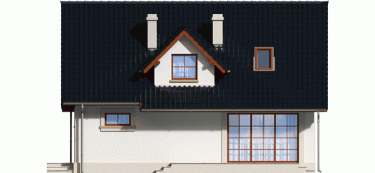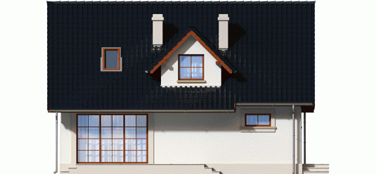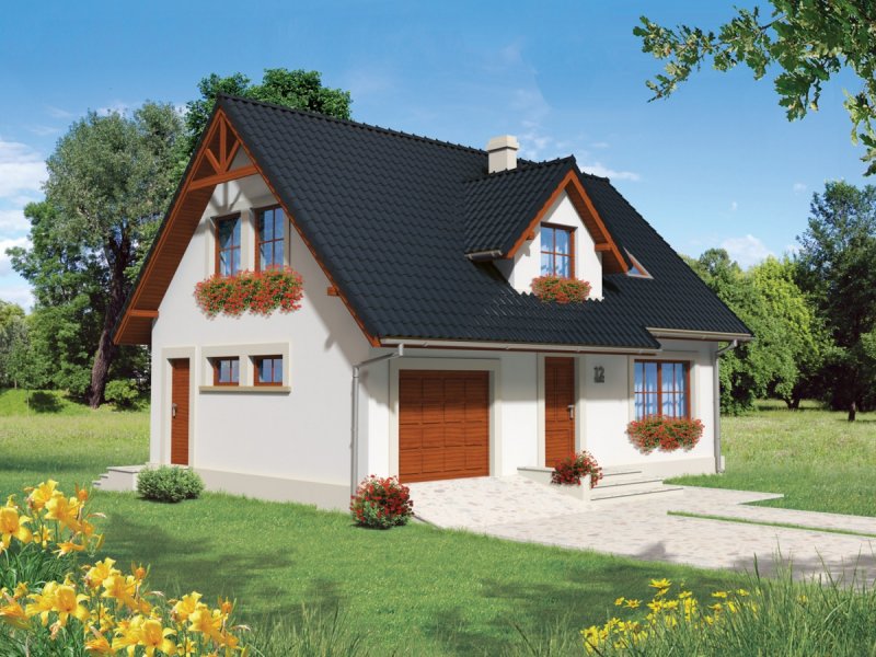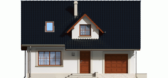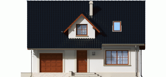 Dom parterowy z użytkowym poddaszem, z garażem, niepodpiwniczony, przeznaczony dla 4-osobowej rodziny. Na parterze znajduje się salon z kominkiem połączony z otwartą kuchnią i jadalnią. Z salonu można wyjść na taras, następnie do ogrodu. Na poddaszu mieszczą się trzy pokoje, garderoba i łazienka. Dom dostępny jest także w wersji z powierzchnią użytkową większą o około 20m2, z powiększoną strefą dzienną (salonem, kuchnią i jadalnią) oraz podniesioną ścianką kolankową na poddaszu.