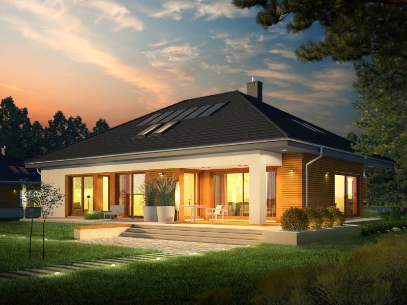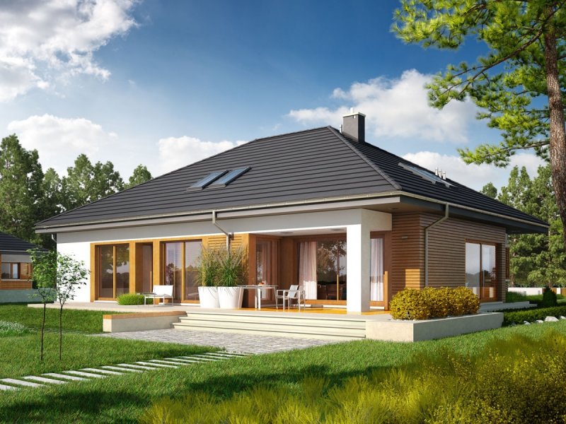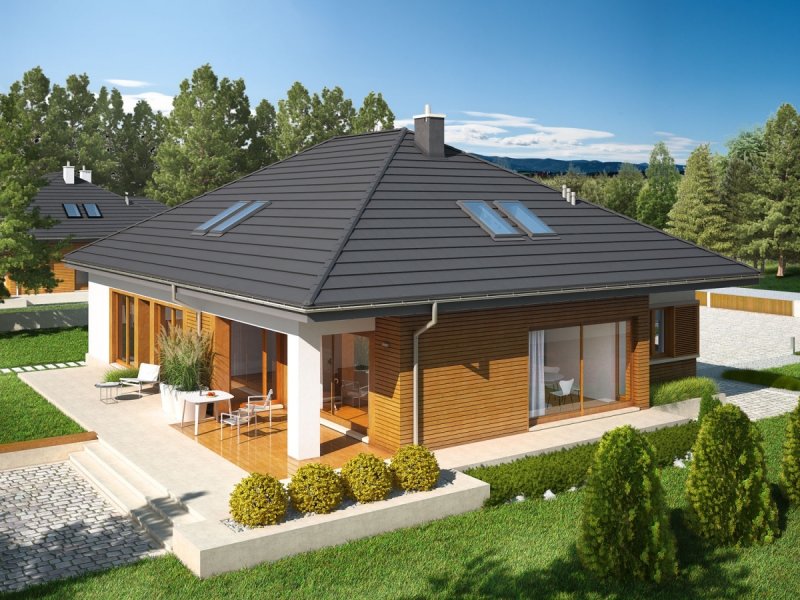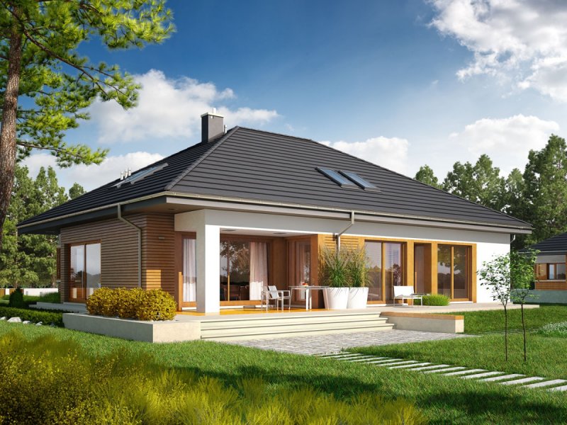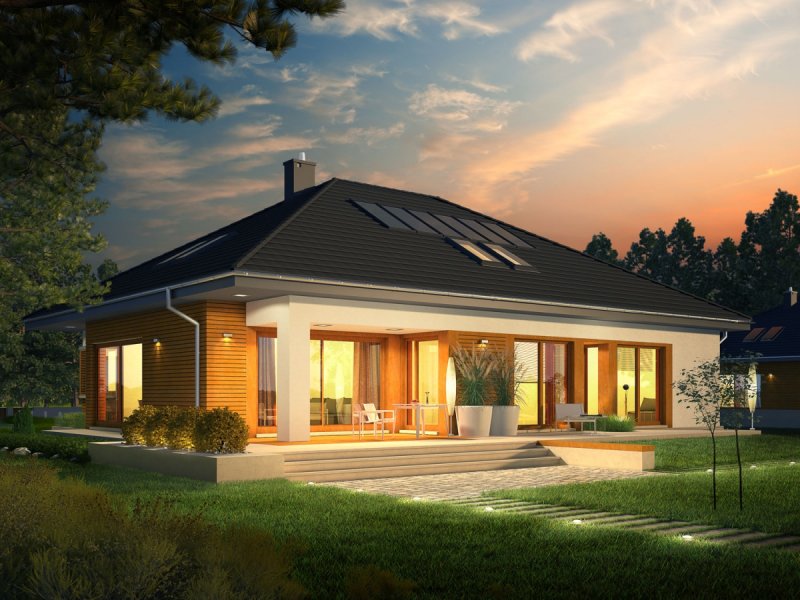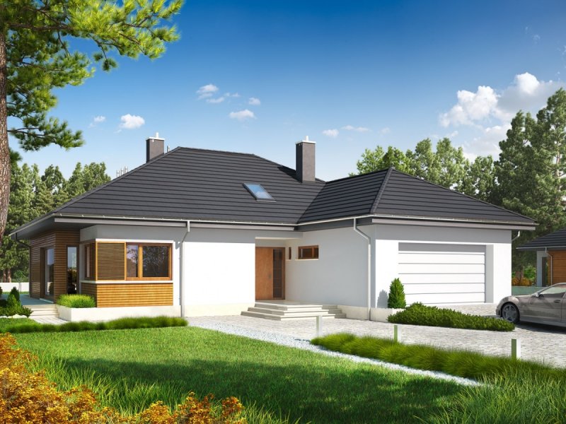 Marcel G2 MULTI-COMFORT to nowoczesna elegancja w czystej formie. Dzięki zastosowaniu dużej ilości okien domownicy mogą czerpać radość i energię z imponującej porcji naturalnego światła, które swobodnie przenika do wnętrz – warto zwrócić uwagę, m.in. na słoneczny charakter korytarza, który został maksymalnie rozświetlony dużym oknem z widokiem na ogród. Atutem domu jest przestronna strefa dzienna, której serce stanowi wygodny salon, połączony z jadalnią. Wygląd zewnętrzny budynku, koresponduje z najnowszymi trendami w architekturze – na elewacji króluje surowa biel tynku i naturalne drewno. Do dyspozycji mieszkańców jest również przestronny taras, będący subtelnym przedłużeniem strefy wypoczynkowej. W zgrabną bryłę budynku udało się wkomponować obszerny, dwustanowiskowy garaż.