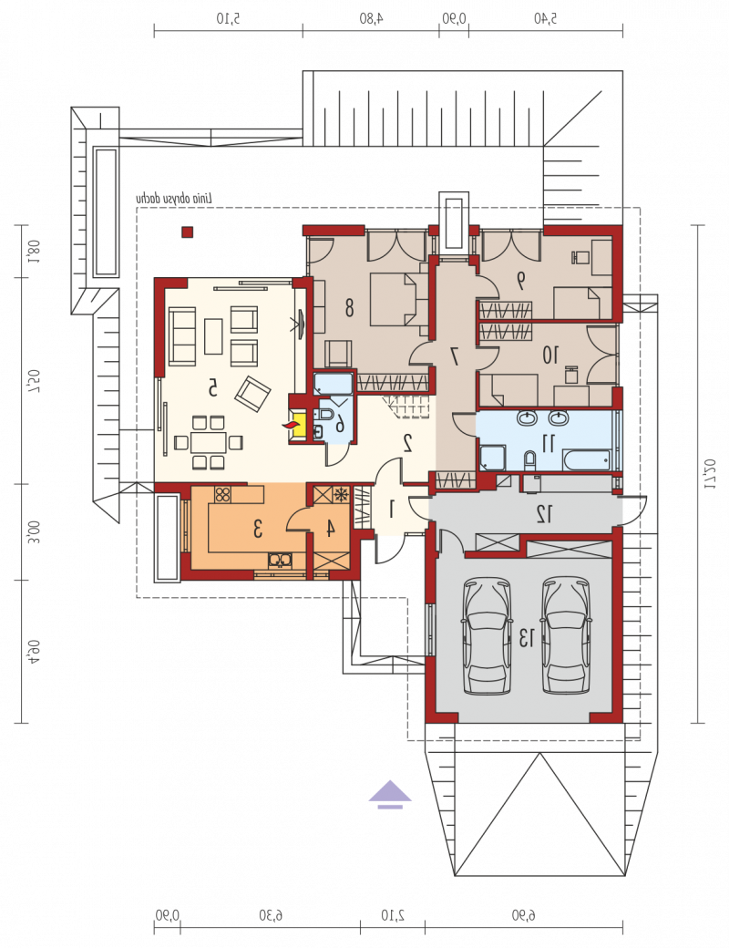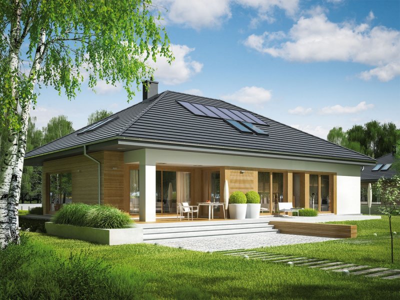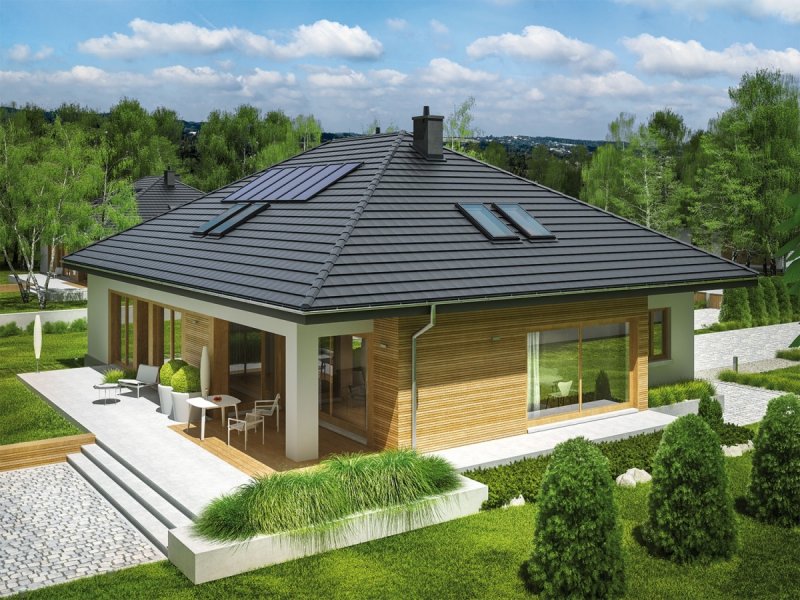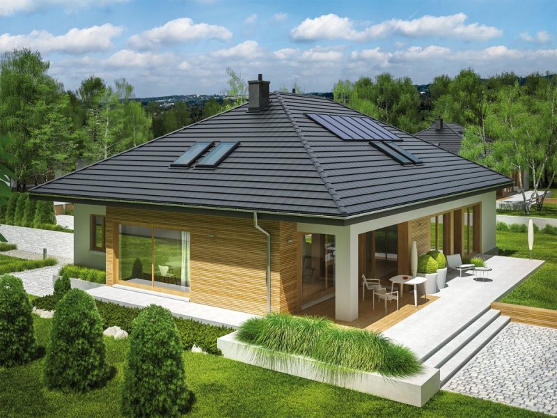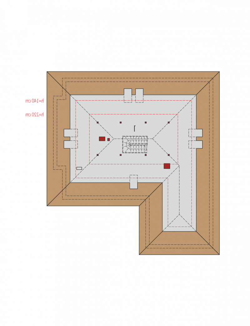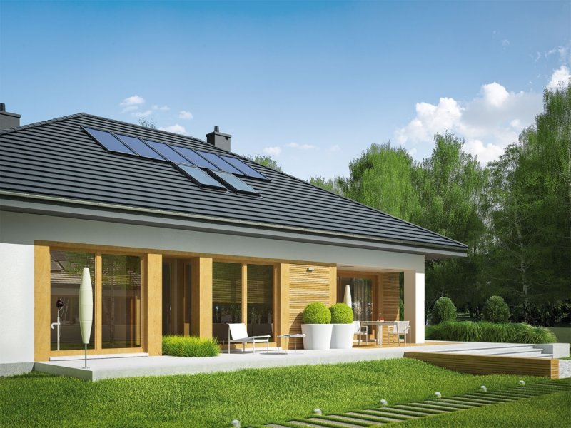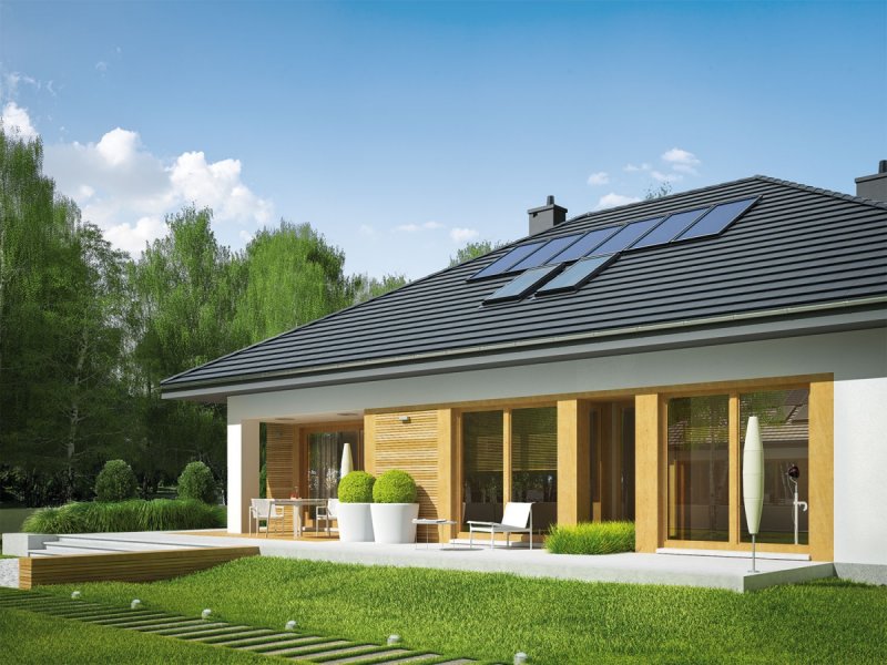Dach: konstrukcja drewniana, ocieplenie wełna mineralna 30 cm, dachówka płaska lub inna o podobnych parametrach