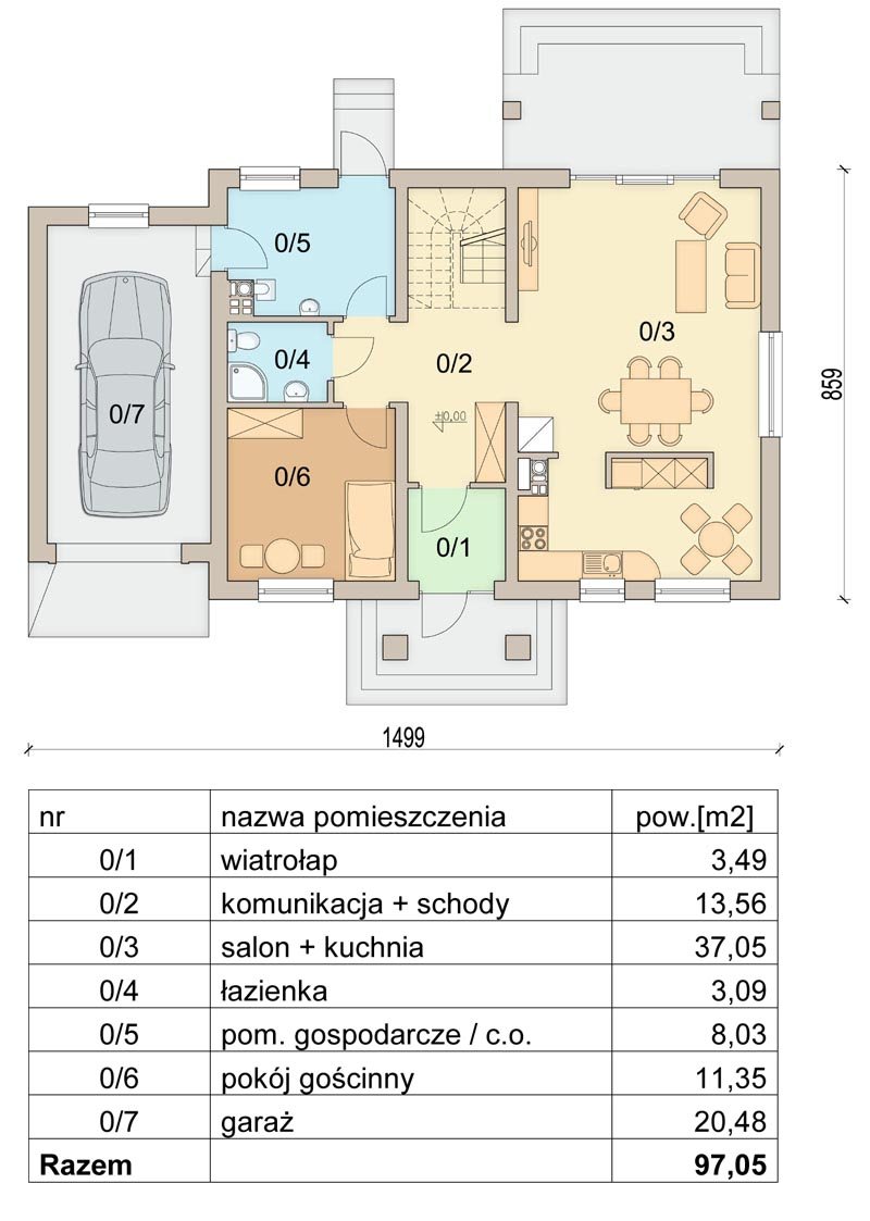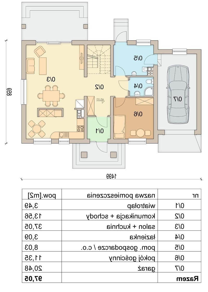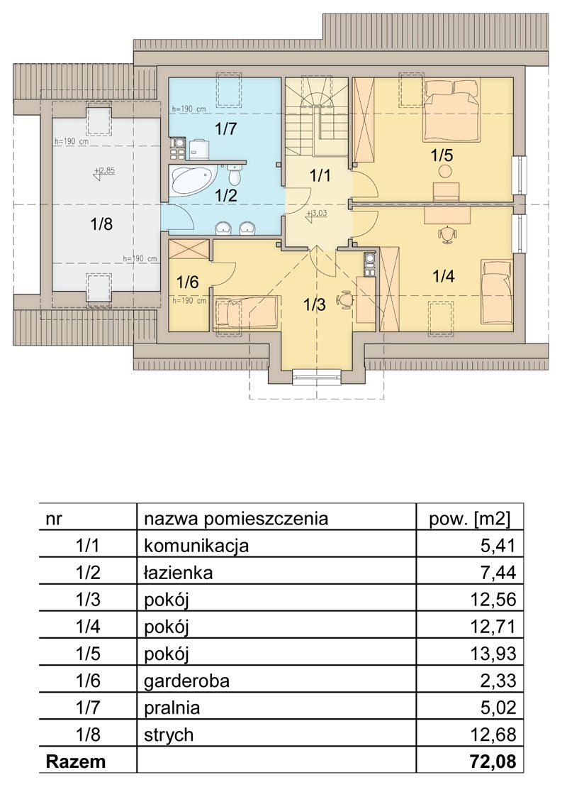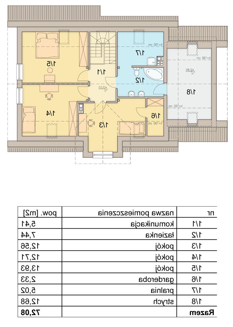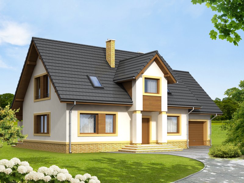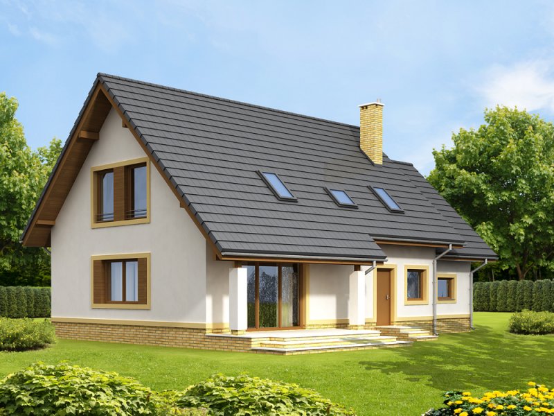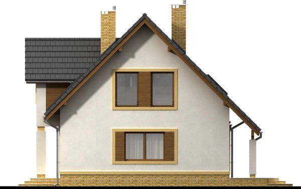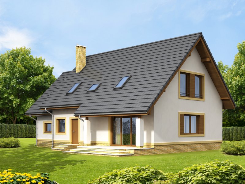 Marcello 2 to niewielki dom jednorodzinny o ciekawej architekturze. Dzięki funkcjonalnemu rozplanowaniu pomieszczeń, dom zapewni wygodę w użytkowaniu 4-5 osobowej rodzinie. Otwarty salon i jadalnia połączona z kuchnią, stworzą komfortową przestrzeń dla życia rodzinnego i towarzyskiego. Dodatkowo na parterze zlokalizowano pokój gościnny, oraz łazienkę. Dzięki temu poddasze pozostanie strefą wyłącznie dla mieszkańców domu. Niewątpliwym atutem projektu jest łazienka na poddaszu z której dostępna jest pralnia oraz duży strych mogący pełnić funkcję np. suszarni. Nie zapomniano również o pomieszczeniu gospodarczym z wyjściem na ogród, oraz garderobie. Prosta bryła i nieskomplikowana konstrukcja, sprawią że dom będzie tani i łatwy w budowie. W projekcie zastosowano wyłącznie typowe i sprawdzone rozwiązania technologiczne, co znacznie ułatwi realizację i zminimalizuje koszty eksploatacji.