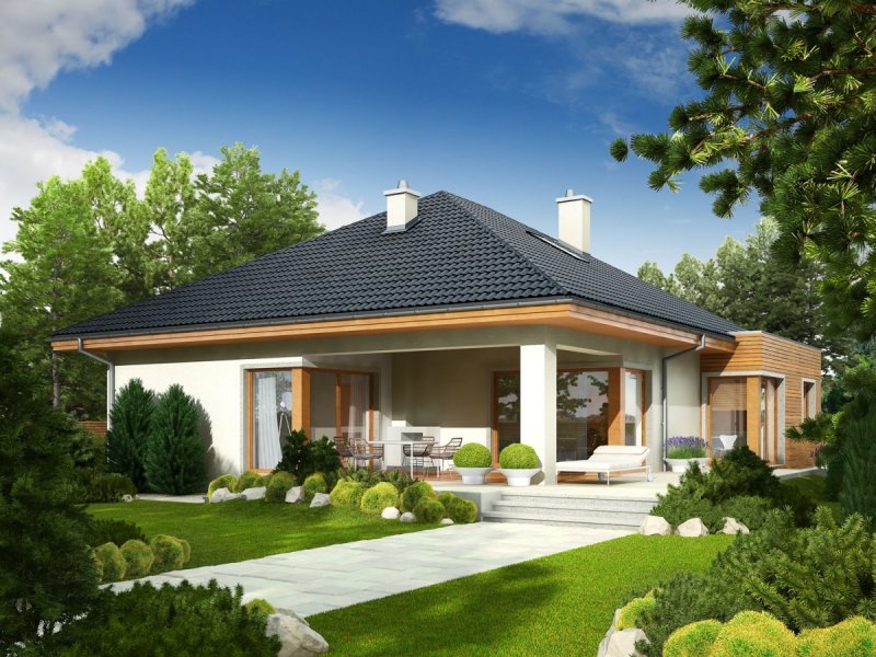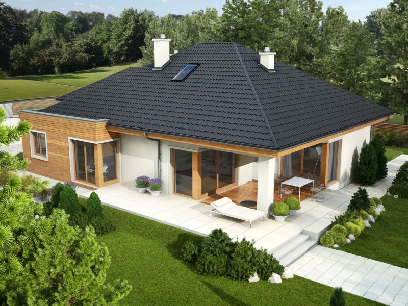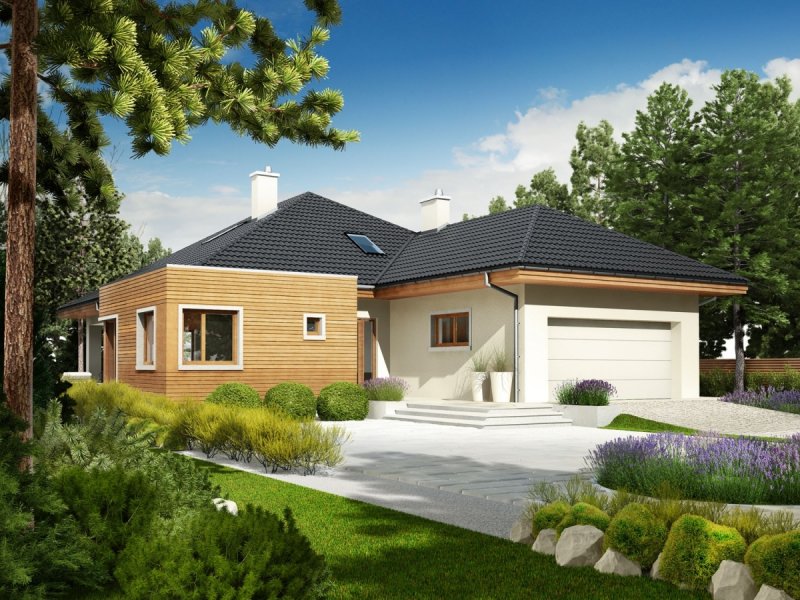 Elewacja: tynk cienkowarstwowy mineralny i okładzina drewniana