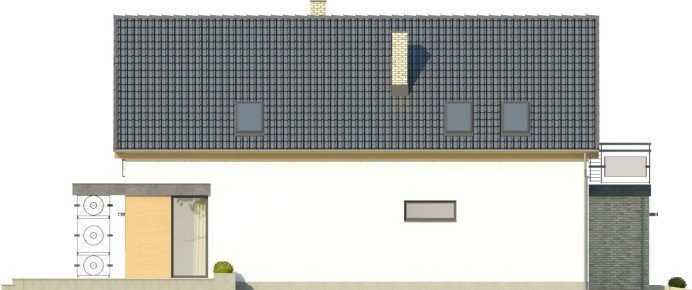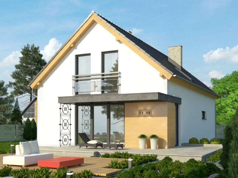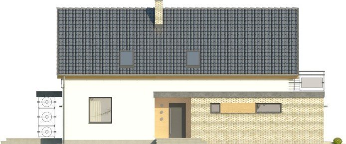 Ściany budynku zaprojektowano z betonu komórkowego zdociepleniem lub w innej technologii w ramach adaptacji. Stropgęstożebrowy, więźba drewniana, pokrycie dachówką ceramicznąlub cementową. Inne pokrycia w ramach adaptacji. Elewacjetynkowane, częściowo pokryte płytami z drewna oraz - podobnie jakkominy – płytkami klinkierowymi. Balustrady z metalu oraz zeszkła.