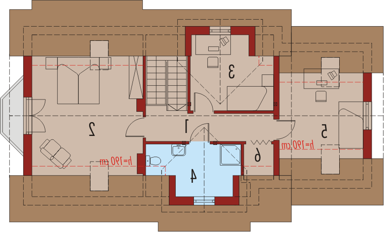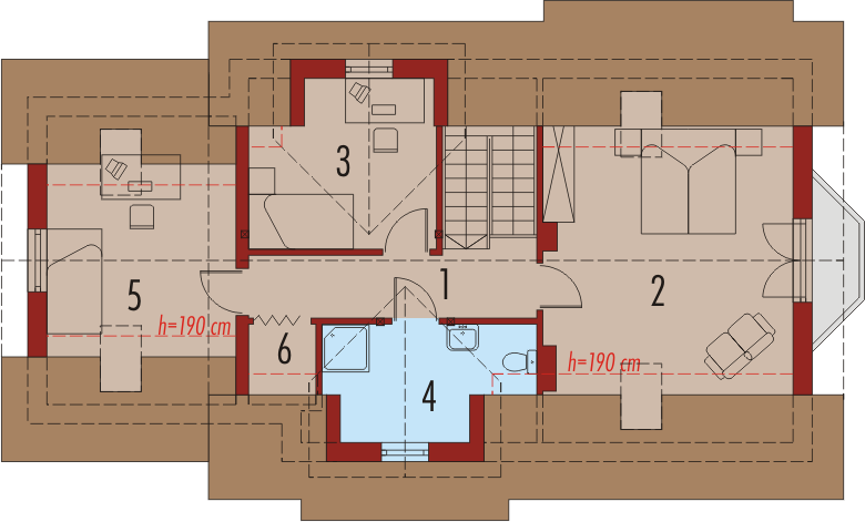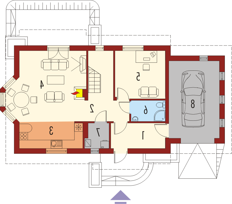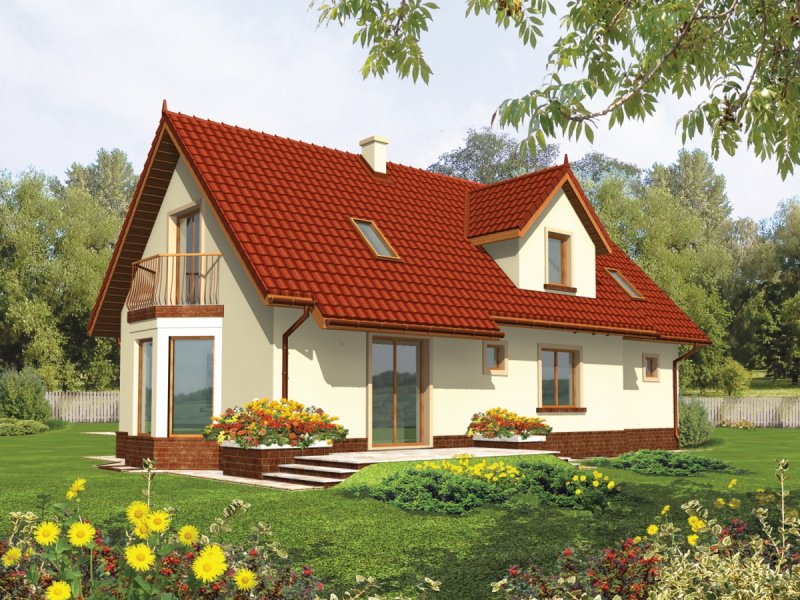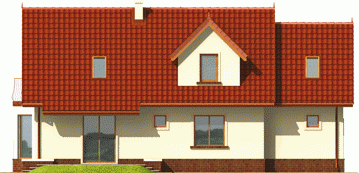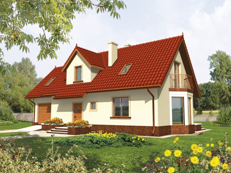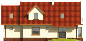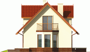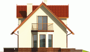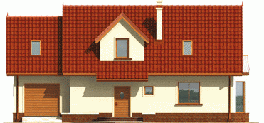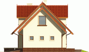 Dom z poddaszem użytkowym, niepodpiwniczony, z garażem, przeznaczony dla 3-5-osobowej rodziny. Strefa wejściowa to przestronny, wygodny wiatrołap łączący dom z garażem. Na parterze znajduje się salon z kominkiem, połączony z jadalnią i otwartą kuchnią. Dodatkowo na parterze znajduje się gabinet, który może pełnić funkcję pokoju gościnnego. Na poddaszu zaplanowano trzy sypialnie oraz łazienkę. Centralnie umieszczona klatka schodowa zapewnia wygodne użytkowanie całego domu. Dom został tak zaprojektowany, aby można było zrezygnować z garażu. Istnieje wersja projektu o mniejszej powierzchni użytkowej – „Megi”