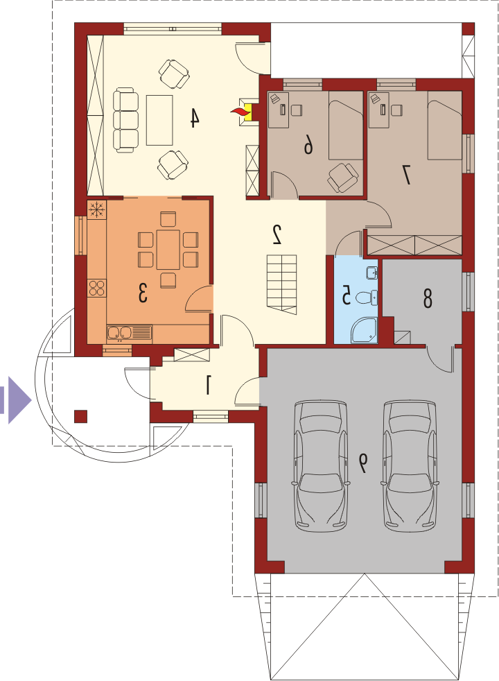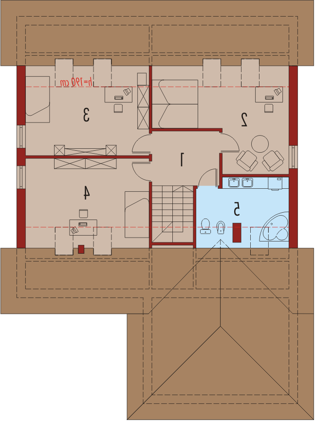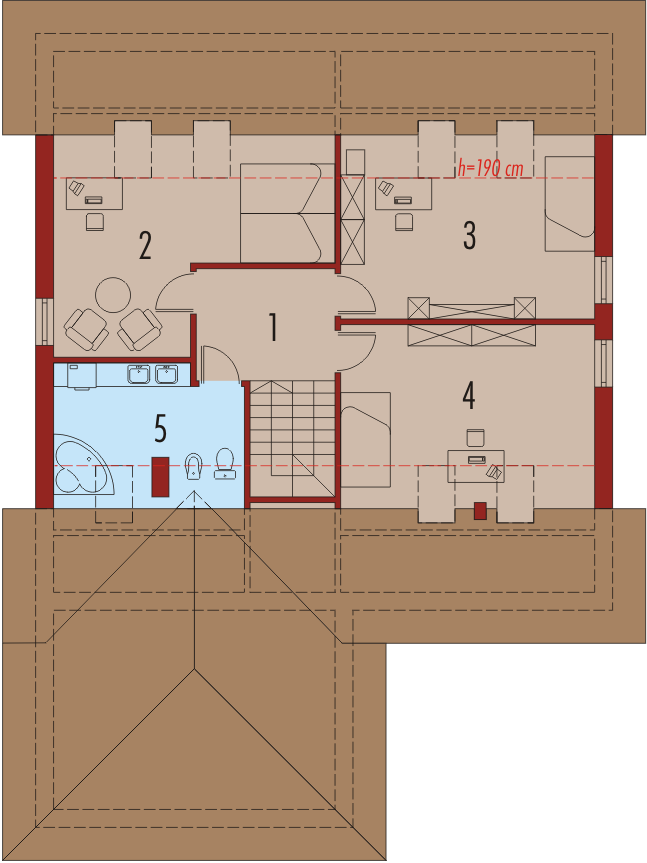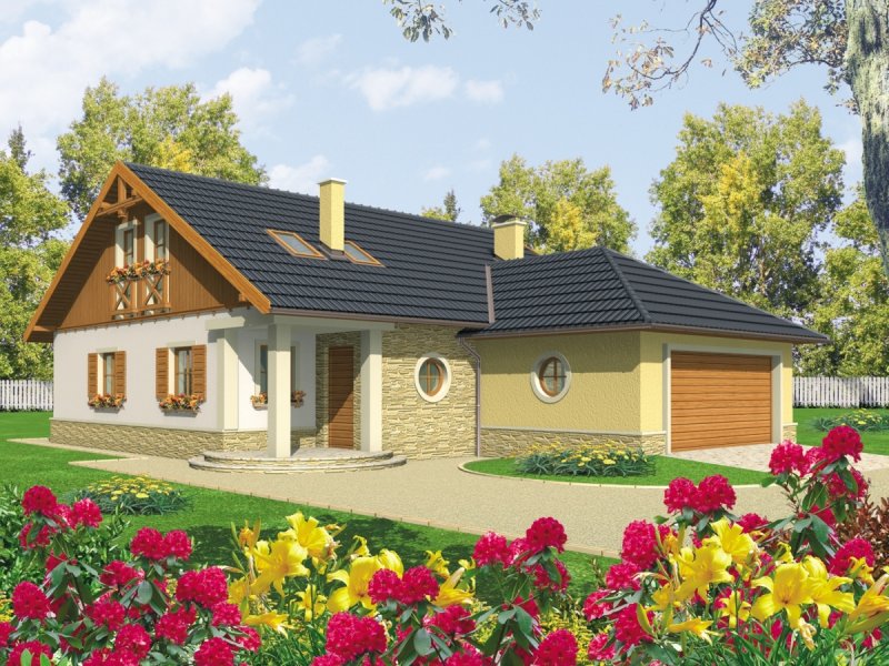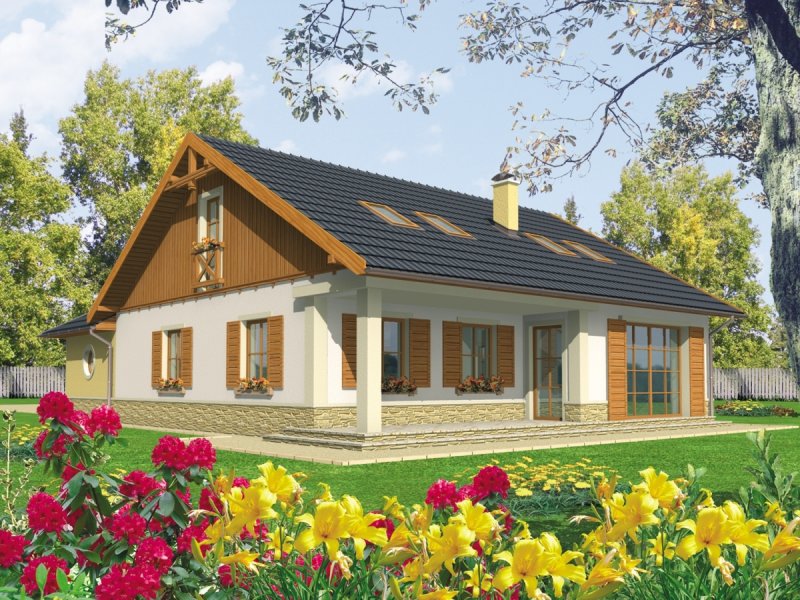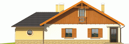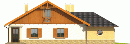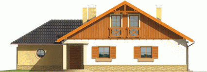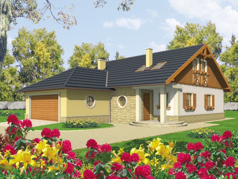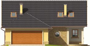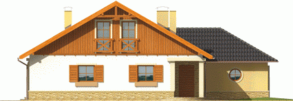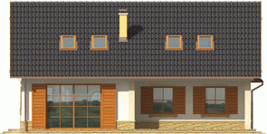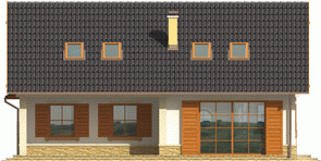 Dom parterowy z poddaszem użytkowym niepodpiwniczony z wbudowanym dwustanowiskowym garażem przeznaczony dla 4-5-osobowej rodziny. Bryła budynku prosta dach o tradycyjnym układzie. Na parterze zaprojektowano duży salon połączony z kuchnią dwa pokoje (gabinet + pokój gościnny) łazienkę z prysznicem oraz część gospodarczą. Z salonu prowadzi wyjście na zadaszony taras. Niewielka ilość ścian nośnych na parterze pozwala na elastyczne traktowanie powierzchni zaprojektowanych pomieszczeń. Na poddaszu mieszczą się trzy sypialnie i łazienka.