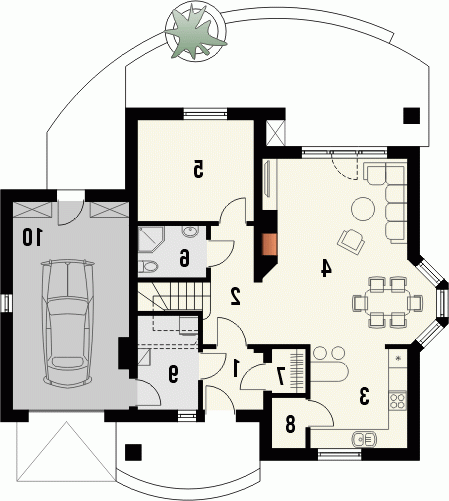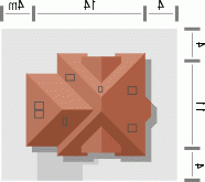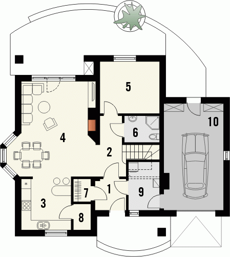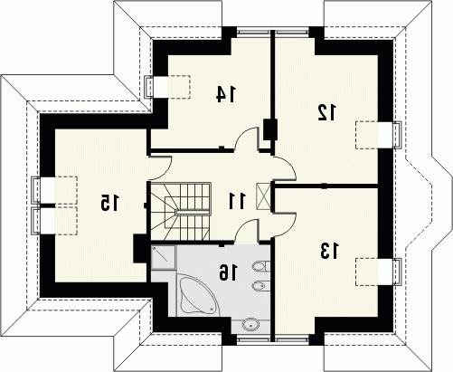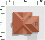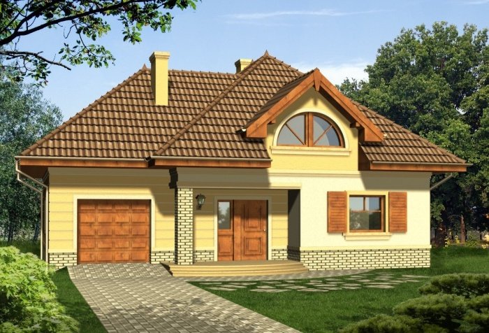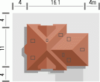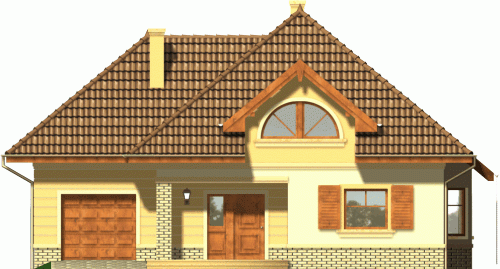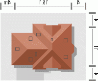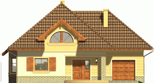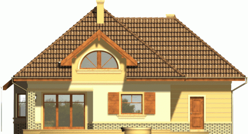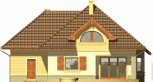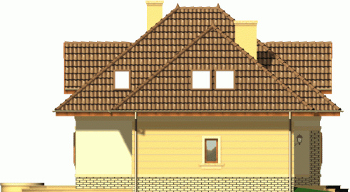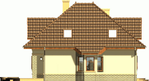 Budynek niepodpiwniczony piętrowy z garażem lub wariantowo z garażem dwustanowiskowym. Na parterze zaprojektowano pokój dzienny z jadalnią, kuchnię ze spiżarnią, dodatkowy pokój, łazienkę, garaż i pomieszczenie gospodarcze. Zaletą domu jest przestrzenny salon połączony z jadalnią w wykuszu i kuchnią. Na poddaszu znajdują się cztery pokoje i łazienka. Dokumentacja dostępna również w odbiciu lustrzanym.