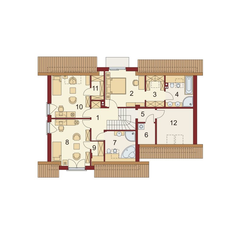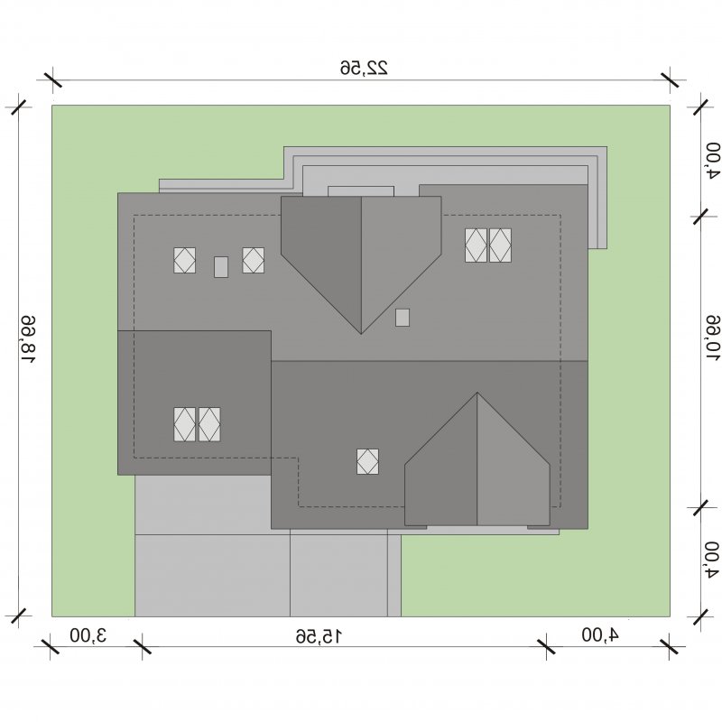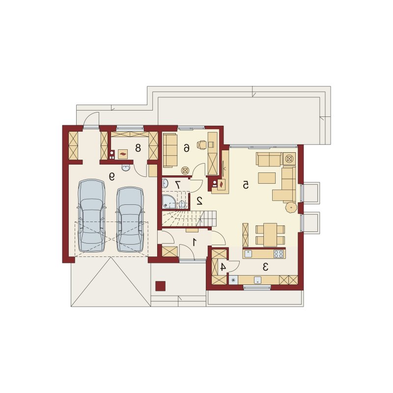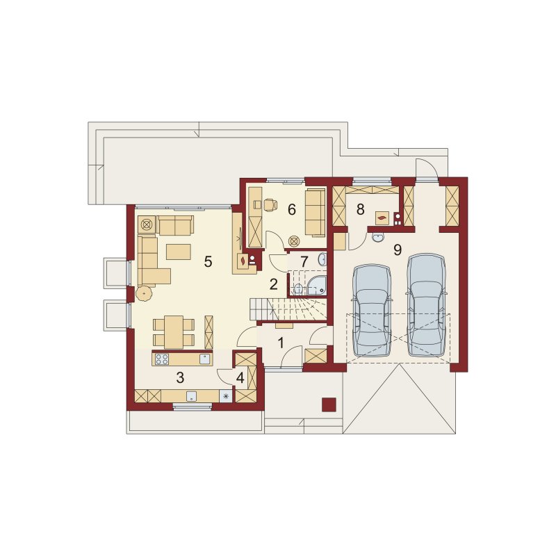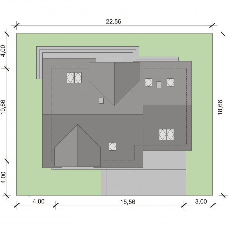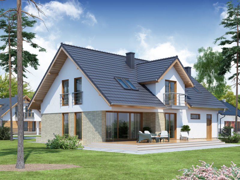 Dom z poddaszem użytkowym, przeznaczony dla 4-5-osobowej rodziny. Na parterze znajduje się przestronny pokój dzienny połączony z jadalnią, oddzielony ścianką od kuchni (z możliwością jej otwarcia). Wyjście na taras z podcieniem jest możliwe zarówno z salonu jak i z dodatkowego pokoju, który może pełnić funkcję gabinetu. Obszerny garaż dwustanowiskowy wyposażony jest w dodatkowy aneks gospodarczy. Na poddaszu znajdują się trzy sypialnie- każda z własną garderobą, dwie łazienki oraz pralnia. Nad garażem można zaadaptować strych nieużytkowy na dodatkowe pomieszczenie gospodarcze lub pokój.