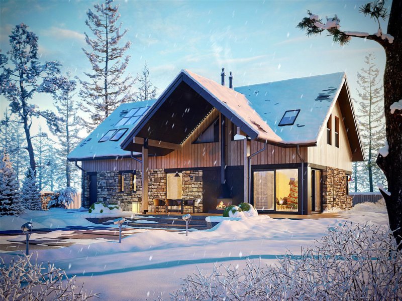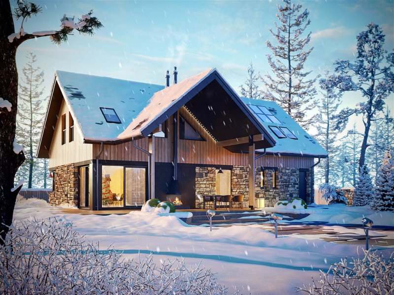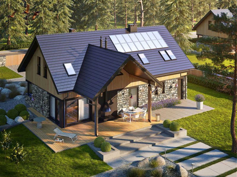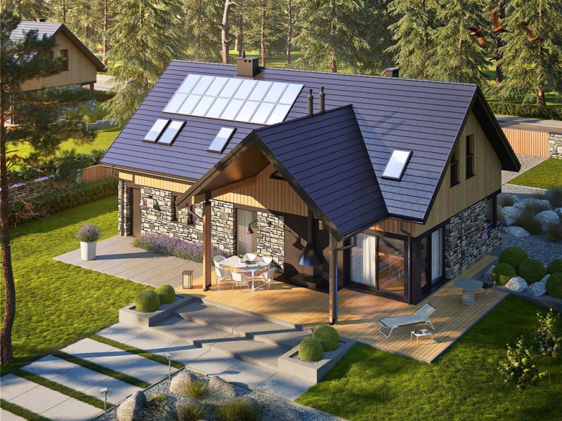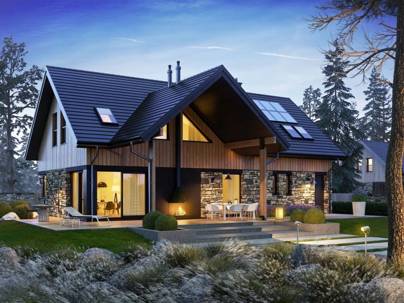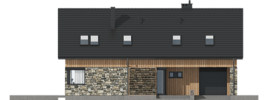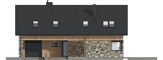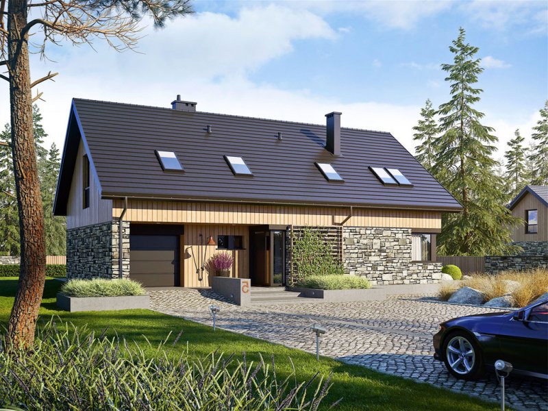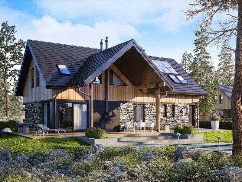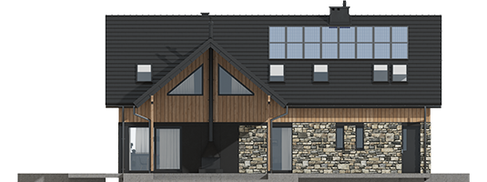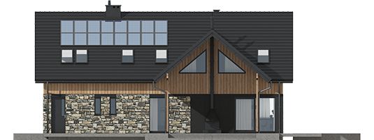 Elewacje: płyty ROCKPANEL, okładzina drewniana i kamienna