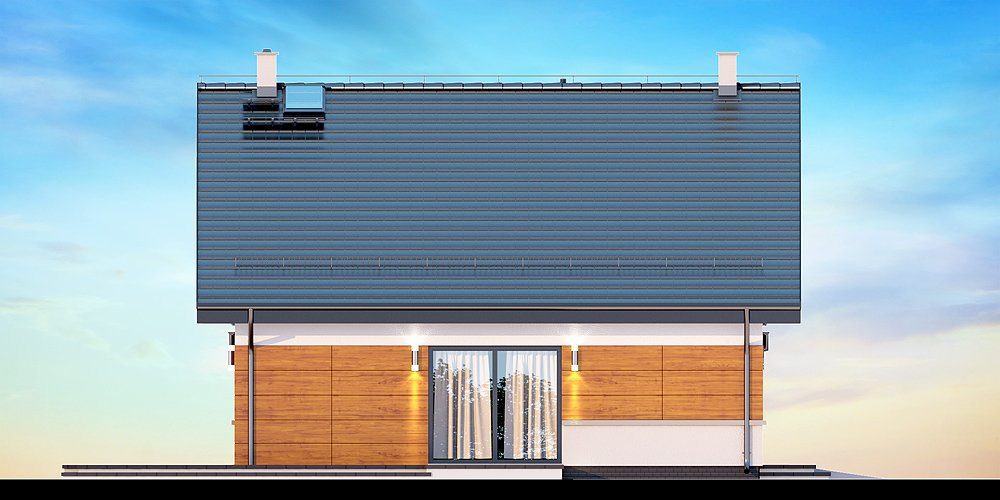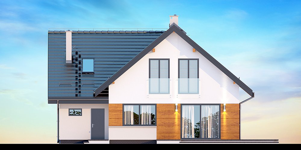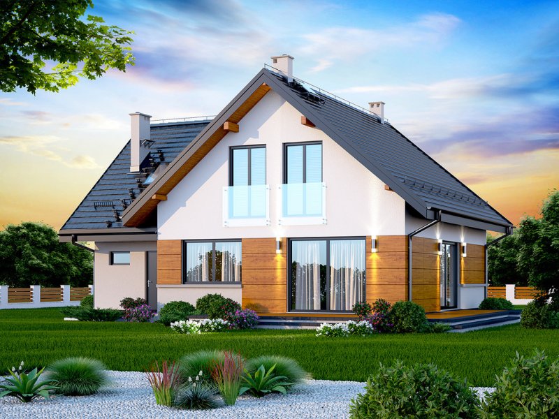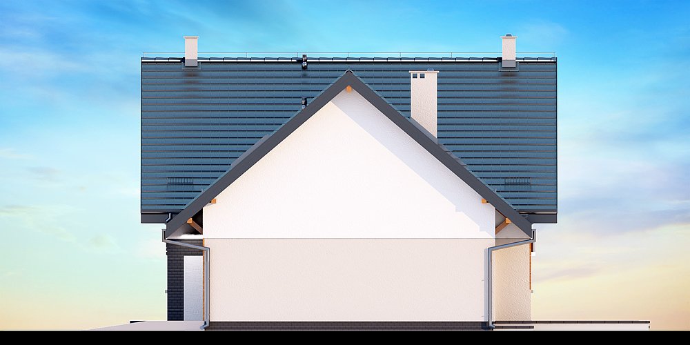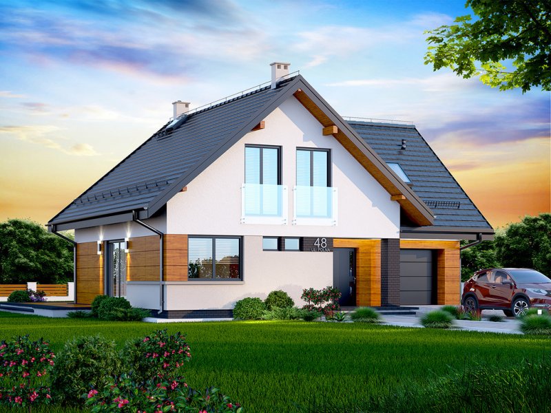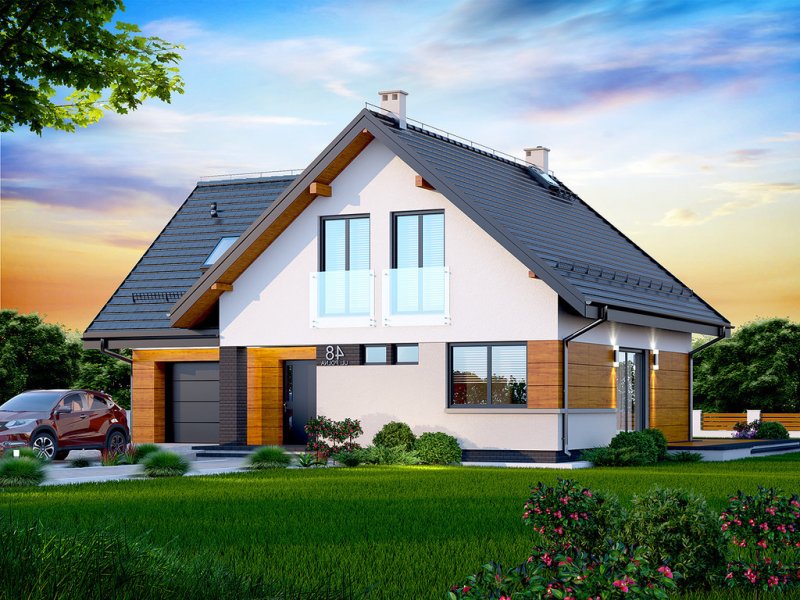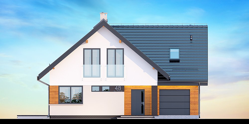 Noelia MODERN to najnowsza wersja z serii projektów Noelia, jednego z najpopularniejszych projektów domów w naszym kraju. Noelia MODERN to funkcjonalny i atrakcyjny wizualnie dom przeznaczony dla 3-6 osobowej rodziny o eleganckiej formie i współczesnej estetyce oraz prostej i taniej, dokładnie przemyślanej konstrukcji. Jest to dom parterowy z użytkowym poddaszem, niepodpiwniczony, z garażem jednostanowiskowym. Na parterze zlokalizowana jest obszerna strefa dzienna składająca się z kuchni (która w zależności od potrzeb może być zamykana lub otwarta) jadalni oraz salonu otwartego na taras i ogród. Dzięki doświetleniu strefy dziennej zarówno od strony ogrodu jak i z boku dom nadaje się na każdą działkę, zarówno z wjazdem od północy jak i od południa, wschodu bądź zachodu. Uzupełnieniem kuchni jest pojemna spiżarnia. Dodatkowo na parterze zaprojektowano pokój, który może służyć jako pokój gościnny bądź gabinet, łazienkę i garaż bezpośrednio połączony z wiatrołapem oraz kotłownię dostępną z garażu z wyjściem na ogród dzięki czemu może ona stanowić też miejsce składowania narzędzi ogrodowych. W wiatrołapie przewidziano miejsce na szafę wnękową. Na poddaszu znalazły się trzy pokoje, obszerna łazienka a także pralnia/suszarnia dostępna z łazienki oraz pojemna garderoba dostępna z sypialni rodziców. W projektowaniu domu szczególną uwagę zwrócono na atrakcyjny wygląd zewnętrzny, proporcjonalność bryły budynku, odpowiednie doświetlenie i funkcjonalne rozplanowanie pomieszczeń przy zachowaniu prostoty konstrukcji oraz zwartości bryły domu. Architektura domu to połączenie tradycji z nowoczesnością oraz elegancji z dbałością o proporcje, estetykę i funkcjonalność.