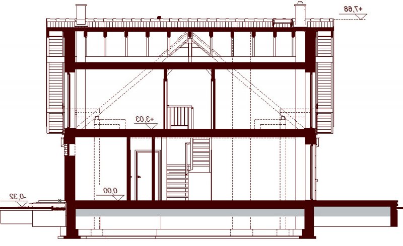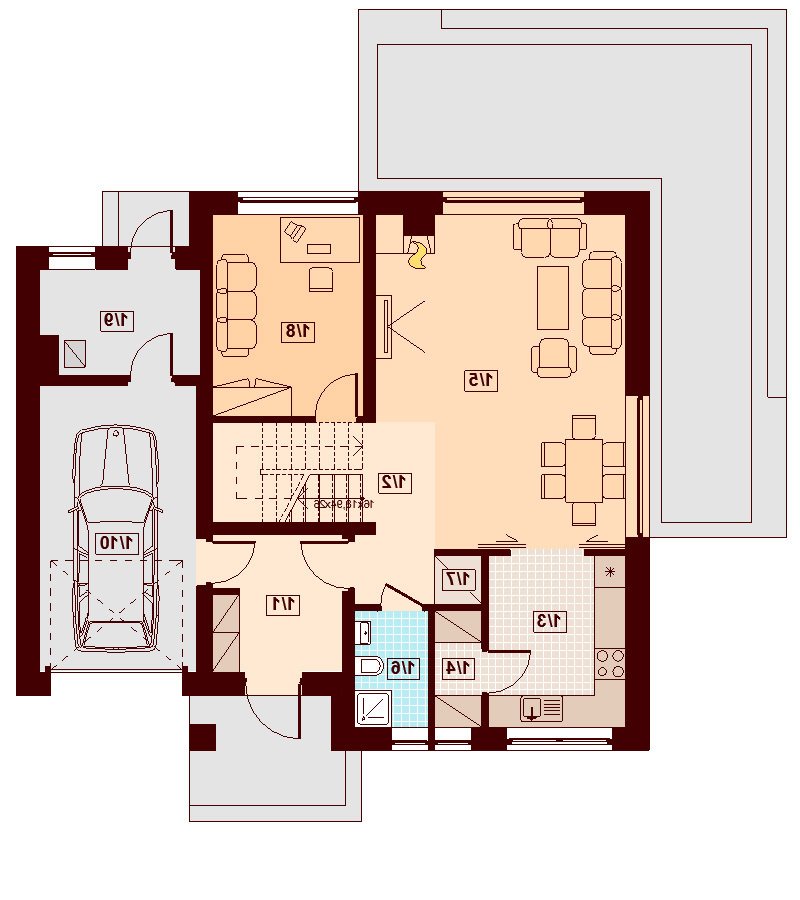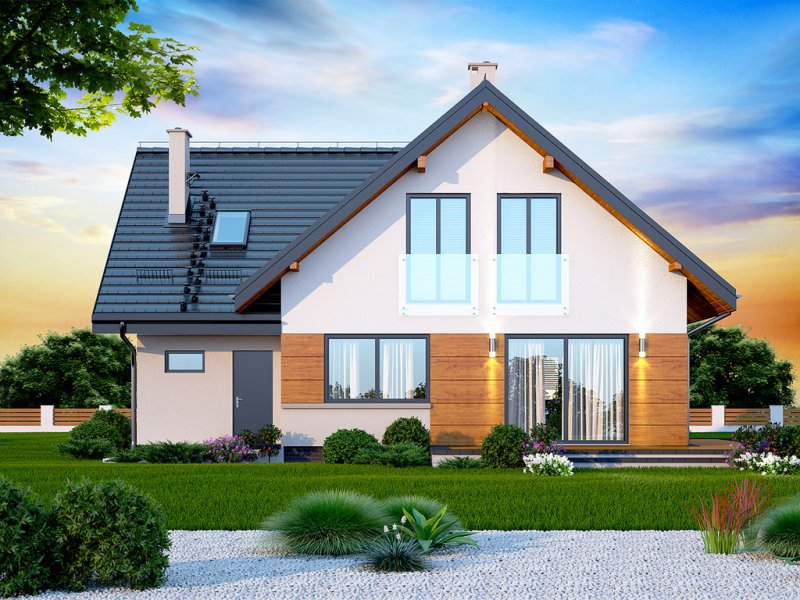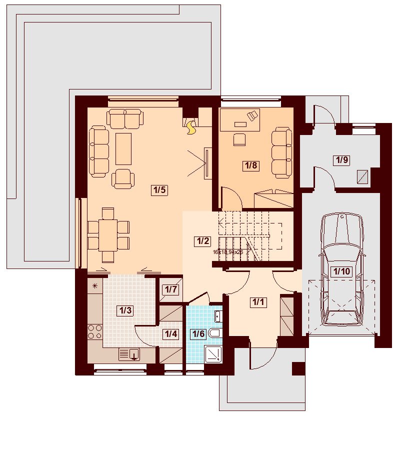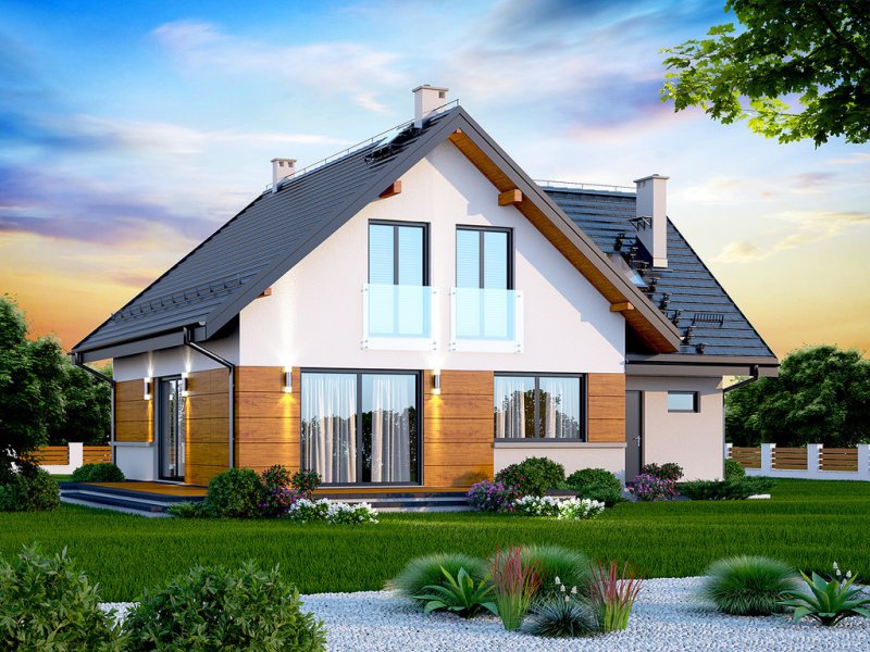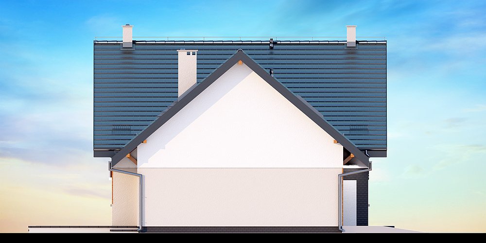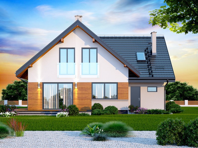Noelia MODERN to najnowsza wersja z serii projektów Noelia, jednego z najpopularniejszych projektów domów w naszym kraju. Noelia MODERN to funkcjonalny i atrakcyjny wizualnie dom przeznaczony dla 3-6 osobowej rodziny o eleganckiej formie i współczesnej estetyce oraz prostej i taniej, dokładnie przemyślanej konstrukcji. Jest to dom parterowy z użytkowym poddaszem, niepodpiwniczony, z garażem jednostanowiskowym. Na parterze zlokalizowana jest obszerna strefa dzienna składająca się z kuchni (która w zależności od potrzeb może być zamykana lub otwarta) jadalni oraz salonu otwartego na taras i ogród. Dzięki doświetleniu strefy dziennej zarówno od strony ogrodu jak i z boku dom nadaje się na każdą działkę, zarówno z wjazdem od północy jak i od południa, wschodu bądź zachodu. Uzupełnieniem kuchni jest pojemna spiżarnia. Dodatkowo na parterze zaprojektowano pokój, który może służyć jako pokój gościnny bądź gabinet, łazienkę i garaż bezpośrednio połączony z wiatrołapem oraz kotłownię dostępną z garażu z wyjściem na ogród dzięki czemu może ona stanowić też miejsce składowania narzędzi ogrodowych. W wiatrołapie przewidziano miejsce na szafę wnękową. Na poddaszu znalazły się trzy pokoje, obszerna łazienka a także pralnia/suszarnia dostępna z łazienki oraz pojemna garderoba dostępna z sypialni rodziców. W projektowaniu domu szczególną uwagę zwrócono na atrakcyjny wygląd zewnętrzny, proporcjonalność bryły budynku, odpowiednie doświetlenie i funkcjonalne rozplanowanie pomieszczeń przy zachowaniu prostoty konstrukcji oraz zwartości bryły domu. Architektura domu to połączenie tradycji z nowoczesnością oraz elegancji z dbałością o proporcje, estetykę i funkcjonalność.