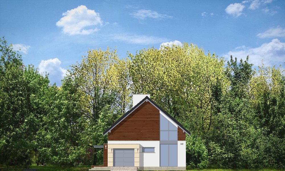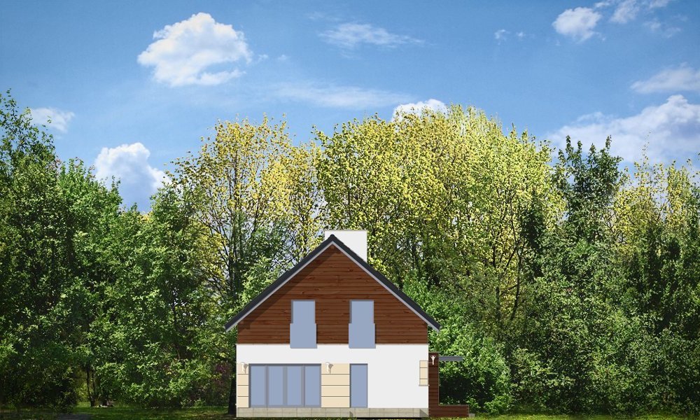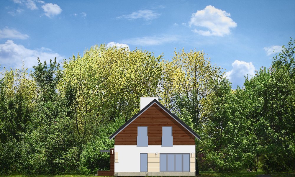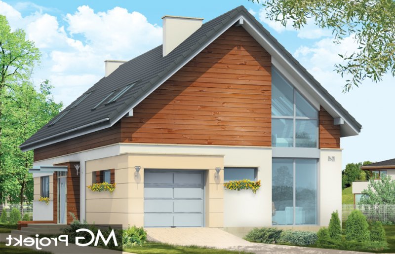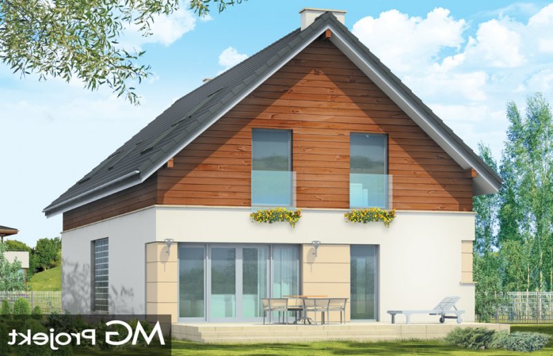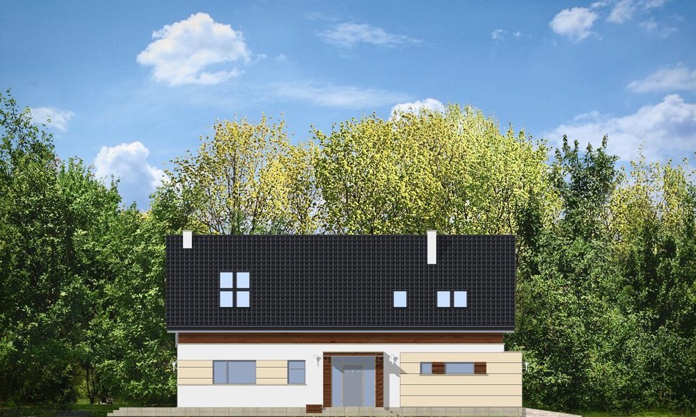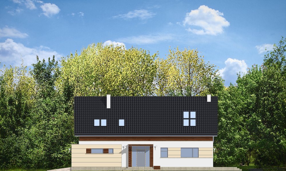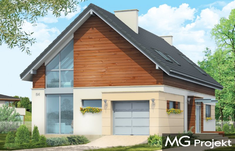 Nowoczesny stworzony został z myślą o Inwestorach ceniących współczesną architekturę i rozwiązania projektowe. Projekt powstał z myślą o Klientach ceniących proste, eleganckie rozwiązania. Prostokątny rzut parteru domu został przekryty symetrycznym dwuspadowym dachem nad poddaszem. Umiejscowienie okien, elementów okładzin elewacji - wszystkie te elementy skomponowano tak, aby dodać bryle dynamiki. W efekcie, prostymi środkami, uzyskano bardzo atrakcyjny wygląd. Wnętrze domu również nawiązuje do tego stylu: jasne, klarowne podziały środka tworzą jednocześnie bardzo ciekawe wnętrze. Jednoprzestrzenny salon z jadalnią połączony z kuchnią, łączy się z holem oddzielonym jednobiegowymi schodami na poddasze. Przejścia, przeszklone powierzchnie otwierające wnętrze na ogród, usytuowanie kominka - wszystko składa się na oryginalność wnętrza. Na parterze zaplanowano jeszcze gabinet i garaż z kotłownią. Na poddaszu natomiast miejsce znalazły: sypialnia rodziców z garderobą i łazienką, oraz sypialnie dzieci z łazienką. Dom pomimo oryginalnych detali architektonicznych ma tradycyjną formę budynku z dwuspadowym dachem - to zaowocuje łatwą i niedrogą budową, oraz brakiem problemów z zaakceptowaniem przez urząd wydający pozwolenie na budowę