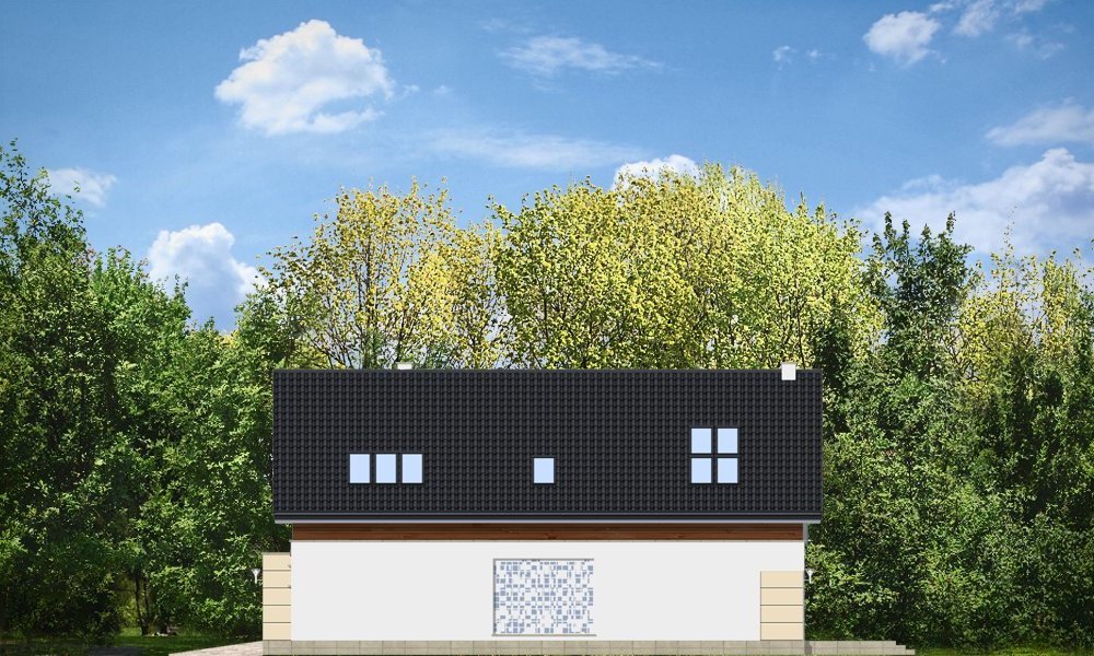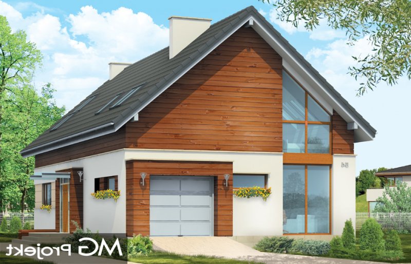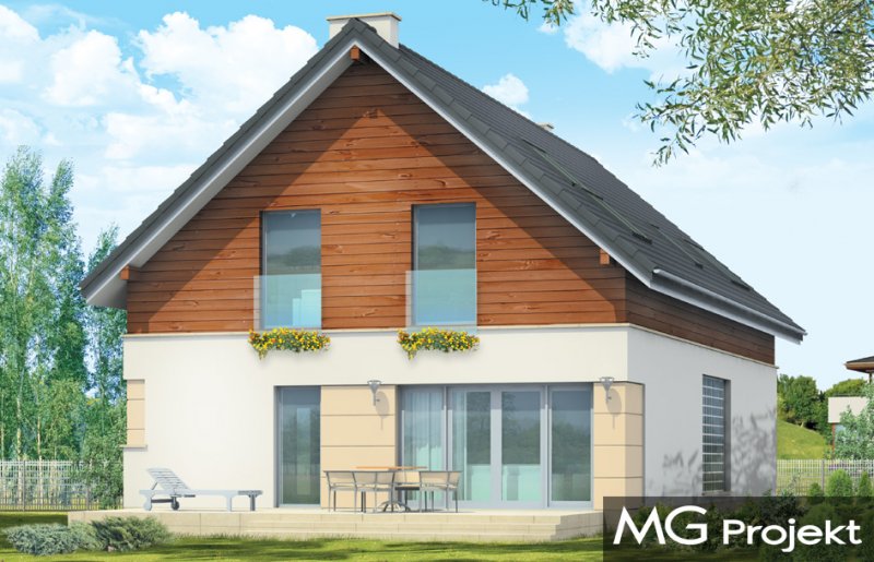 Nowoczesny 2 to propozycja dla Klientów lubiących nowoczesną architekturę i niebojących się wyróżnić z otoczenia. Projekt stworzony został z myślą o Inwestorach ceniących proste, eleganckie rozwiązania. Prostokątna bryła budynku została przekryta symetrycznym dwuspadowym dachem nad poddaszem. Umiejscowienie okien, elementów okładzin elewacji - wszystkie te elementy skomponowano tak, aby dodać domowi dynamiki. W efekcie prostymi środkami, uzyskano bardzo atrakcyjny wygląd. Wnętrze domu również nawiązuje do tego stylu: jasne, klarowne podziały środka tworzą jednocześnie bardzo ciekawe wnętrze. Jednoprzestrzenny salon z jadalnią połączony z kuchnią, łączy się z holem oddzielonym jednobiegowymi schodami na poddasze. Przejścia, przeszklone powierzchnie otwierające wnętrze na ogród, usytuowanie kominka - wszystko składa się na oryginalność wnętrza. Na parterze zaplanowano jeszcze gabinet i garaż z kotłownią. Na poddaszu natomiast miejsce znalazły: sypialnia rodziców z garderobą i łazienką, oraz sypialnie dzieci z łazienką. Dom pomimo nietypowych detali ma tradycyjną formę budynku z dwuspadowym dachem - to zaowocuje łatwą i niedrogą budową, oraz bezproblemowym zaakceptowaniem przez urząd wydający pozwolenie na budowę.
