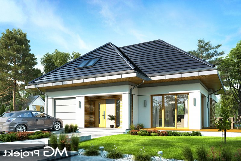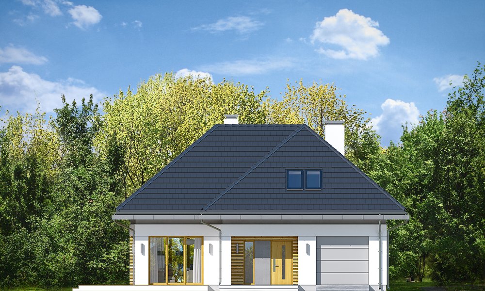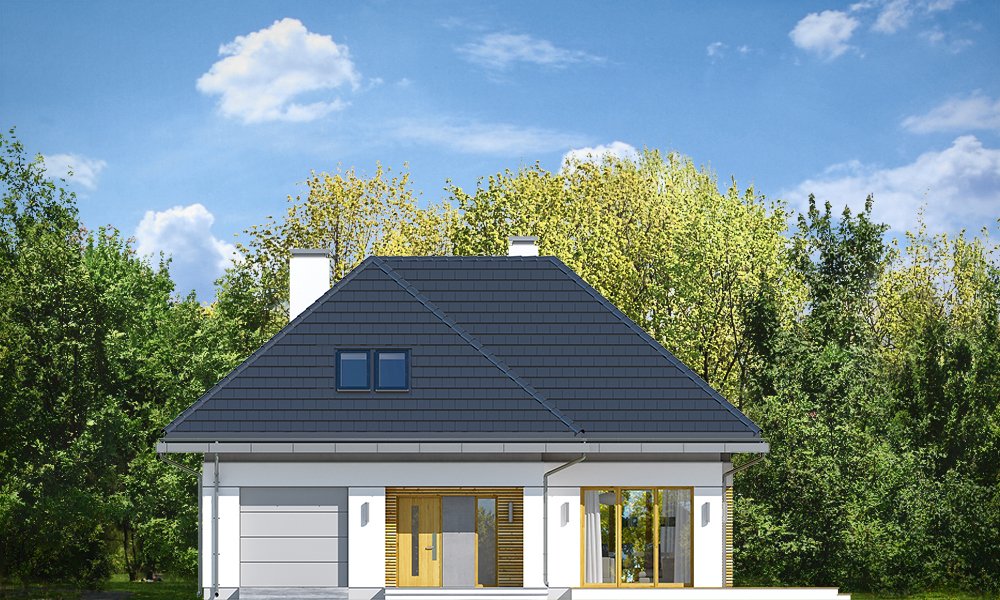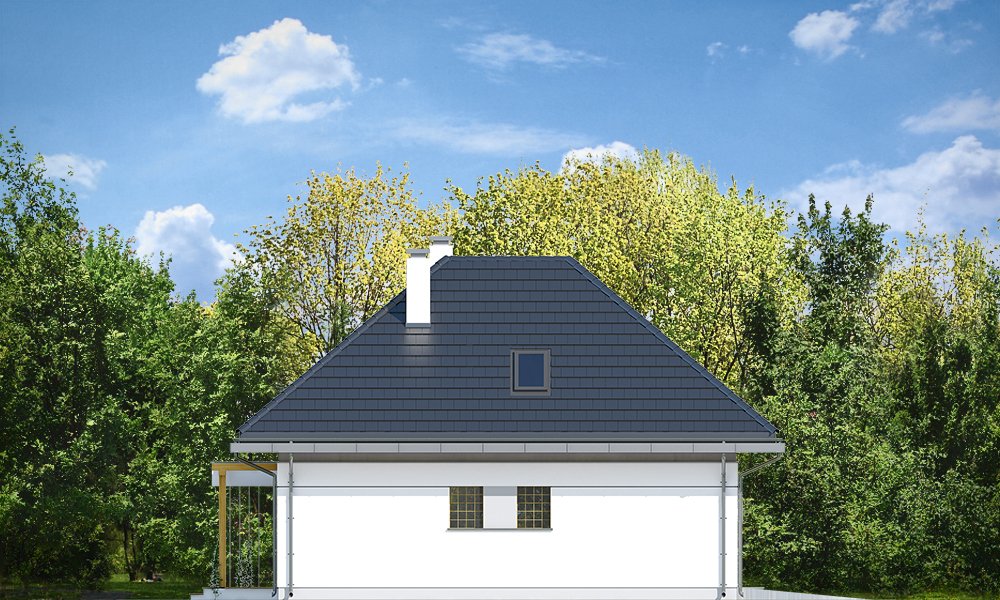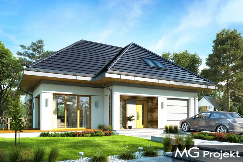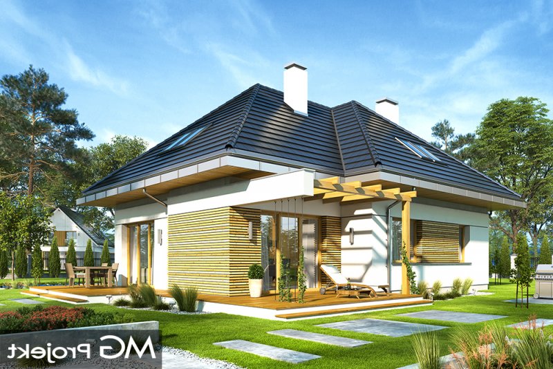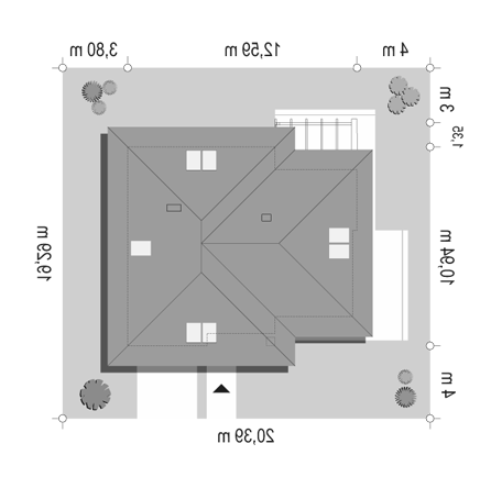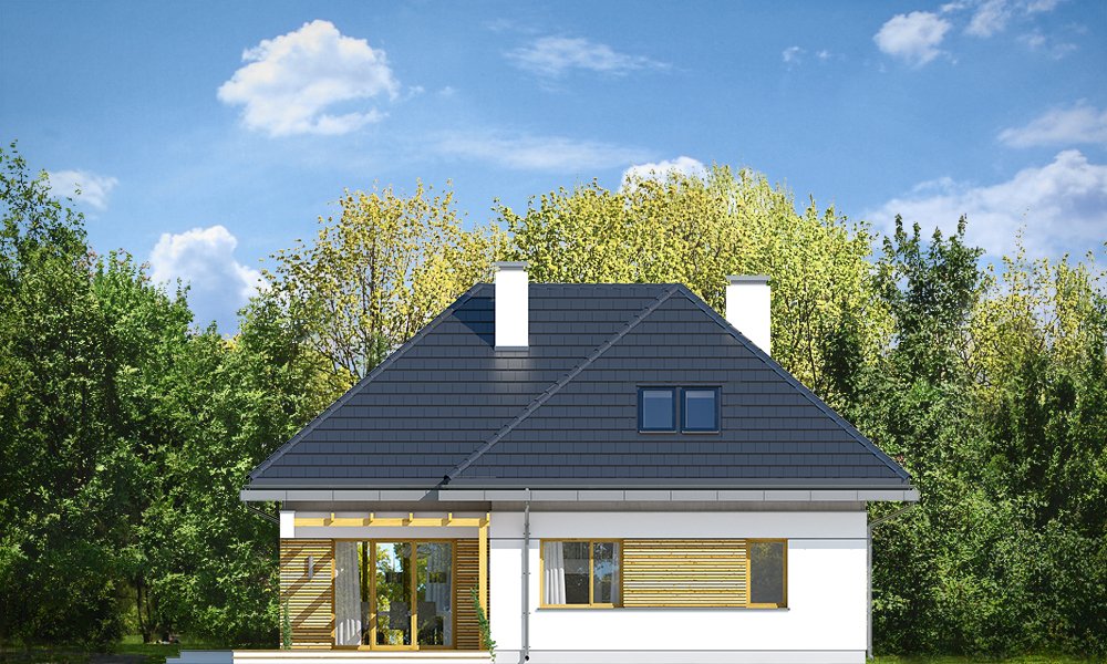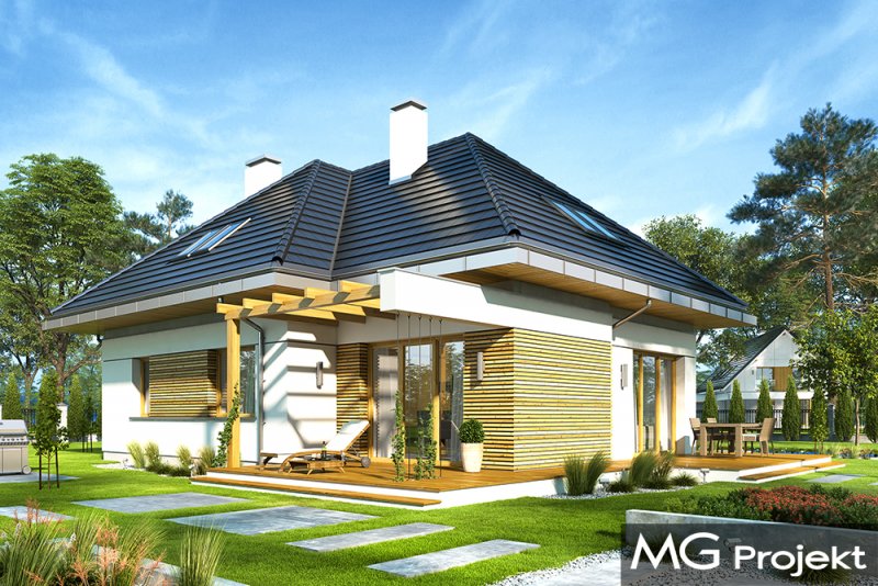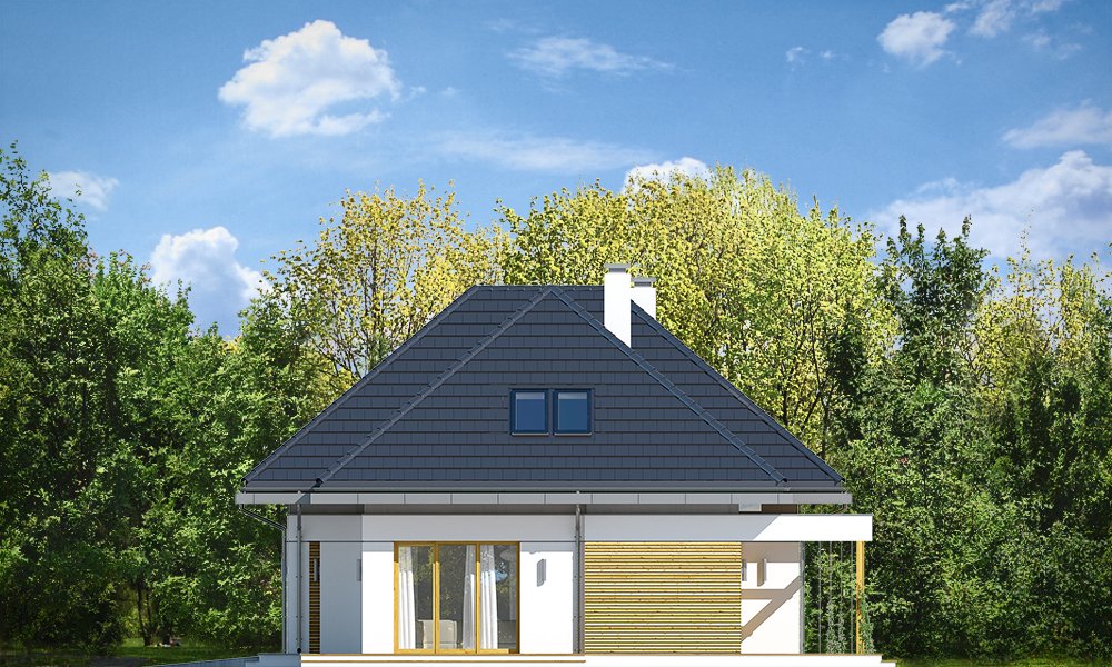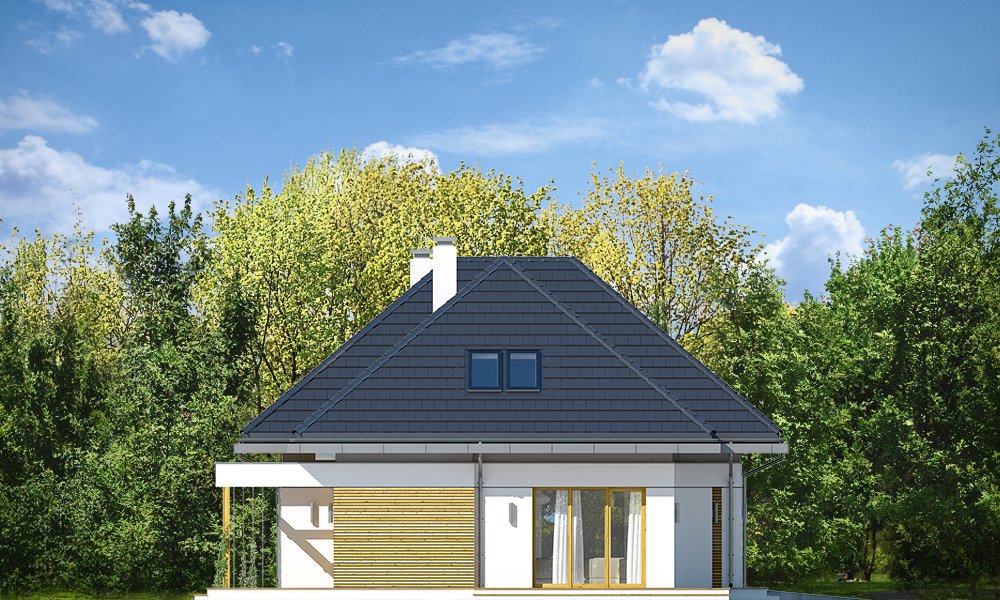 Odwrócony, to dom jednorodzinny przeznaczony dla czteroosobowej rodziny, parterowy z użytkowym poddaszem, na działkę w wjazdem od południa. Dom został zaprojektowany na planie zbliżonym do litery T. Parterowa bryła z poddaszem przykryta jest wielospadowym symetrycznym dachem. Dach domu ustawiony jest na wysokich ściankach kolankowych, dzięki czemu na poddaszu uzyskano zupełnie ładne pokoje. Nowoczesna architektura łączy w sobie urozmaiconą sylwetkę budynku, ciekawe detale i modne materiały i kolorystykę. Duże przeszklenia okien i drewniane okładziny ścian są niewątpliwą ozdobą elewacji. Projekt domu „Odwrócony”, jak sama nazwa wskazuje, został zaprojektowany tak, żeby nadawał się na działkę z niekorzystnym usytuowaniem względem stron świata - na przykład z drogą dojazdową od południa. Domek można wykorzystać na szerszej działce z ogródkiem z boku, lub na działce z ogrodem przed domem, albo posadowić go na działce z ogrodem z tyłu - tak jak zazwyczaj inwestorzy się decydują. Wówczas dzięki dużym przeszkleniom części dziennej od frontu i z boku, wnętrze domu i tak pozostanie dobrze oświetlone. Niekorzystna działa wcale nie musi być złym rozwiązaniem - wystarczy mieć dobry projekt, a „Odwrócony” jest doskonałą propozycją :). Tarasy można wykonać tak jak to pokazano w projekcie - z dwóch stron domu, można też zdecydować się na jeden taras. Wnętrze domu to otwarta przestrzeń salonu, holu, jadalni i bardzo ładnej kuchni ze spiżarnią. W centralnym miejscu planu mamy eleganckie schody na poddasze. Z przedsionka z szatnią przechodzimy z kolei w bok do garażu i pomieszczenia gospodarczego. Od tylnej ogrodowej strony zaprojektowano urocze patio z pergolą opartą na wystającej ze ściany belce. Na poddaszu znajdują się trzy ładne sypialnie i wspólna duża łazienka. Sypialnia rodziców ma oddzielną garderobę. Dom, choć o niewielkiej powierzchni, mieści w sobie wszystkie funkcje potrzebne do komfortowego życia dla pełnej rodziny. Nieskomplikowana bryła i prosta konstrukcja pozwolą na rozsądną kosztowo budowę, a ze względu na zastosowane dobre izolacje i energooszczędne instalacje koszty późniejszego utrzymania również nie będą wysokie. „Odwrócony” dobra propozycja dla inwestorów mających „odwrotną” działkę, z wjazdem od południa, chcących zbudować nieduży nowoczesny dom z poddaszem użytkowym. Zapraszamy !