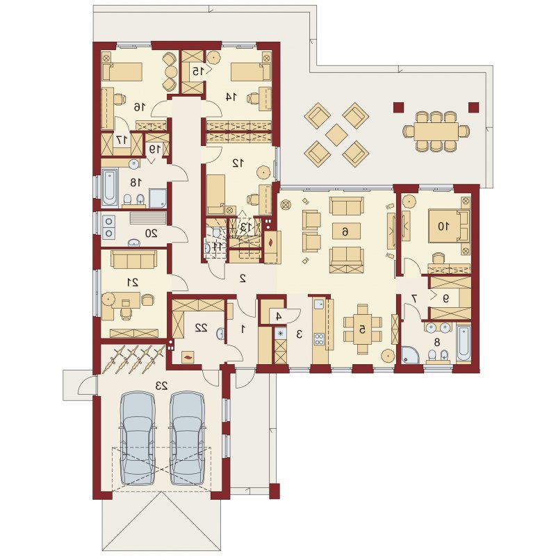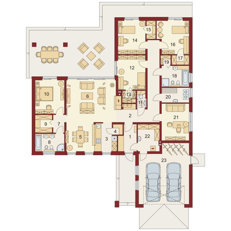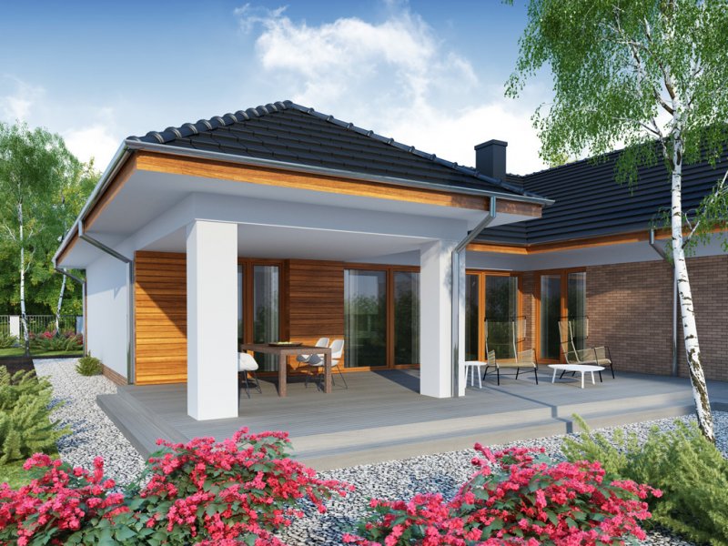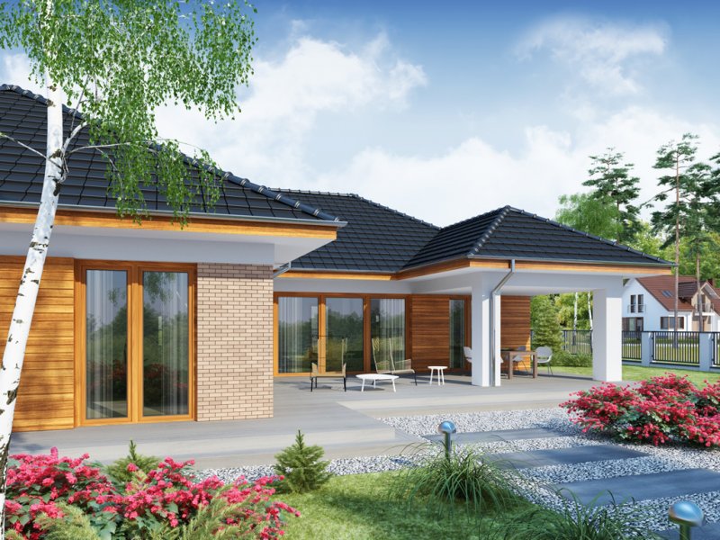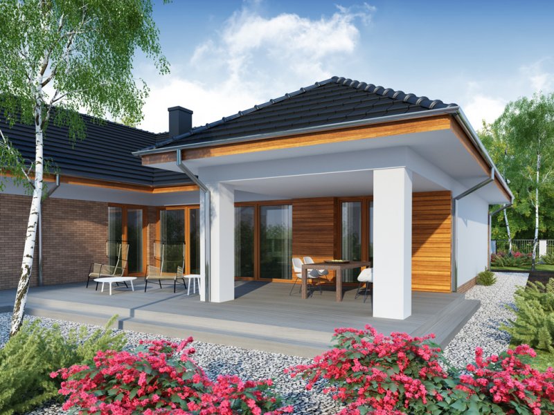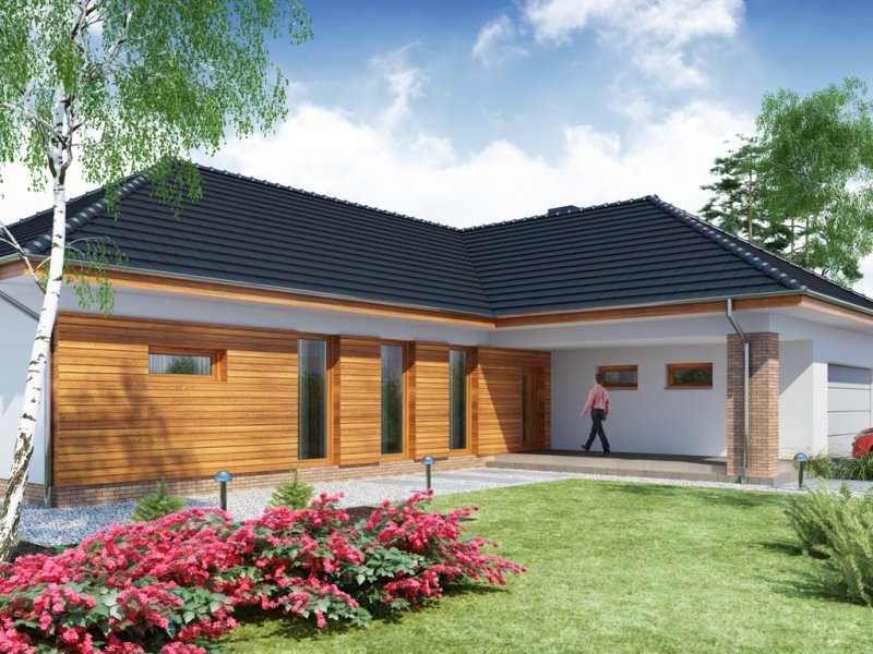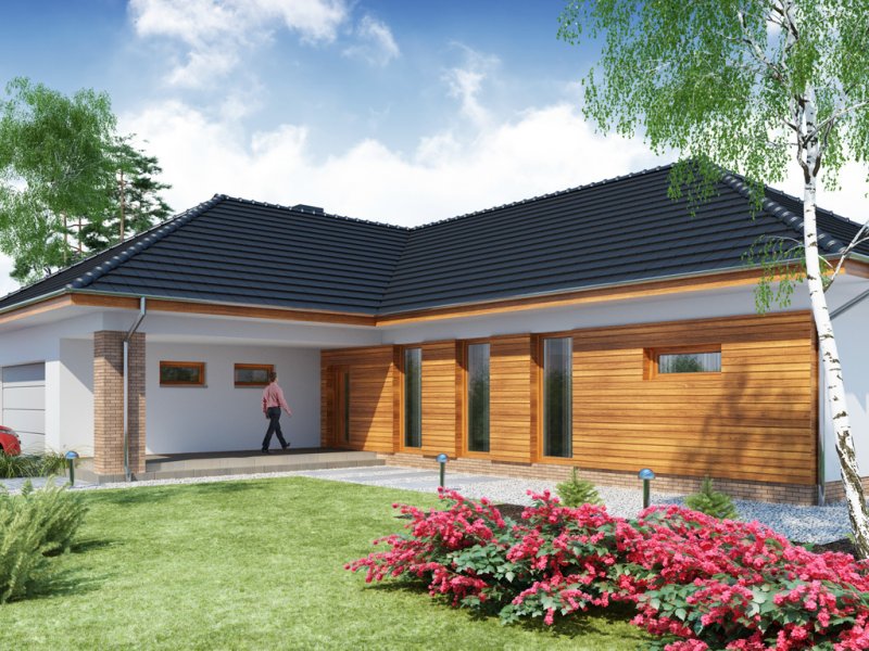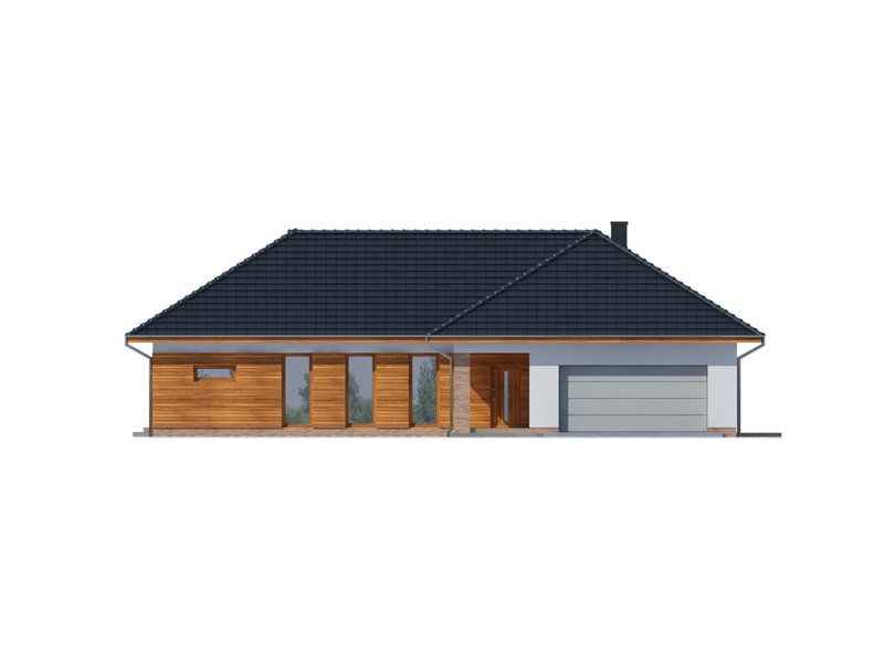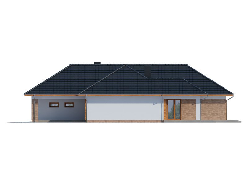 OTTO 2 PS to luksusowy dom parterowy, który zaspokoi wszelkie wymagania 5-6 osób. Przemyślne usytuowanie przedsionka zapewnia jednoczesny dostęp do garażu, części dziennej i nocnej budynku, a w razie potrzeby także poddasza zaadaptowanego na cele mieszkalne. Oddzieloną barkiem kuchnię i jadalnię oraz przestronny salon, można w razie potrzeby wydzielić jako osobne pomieszczenia ze względu na ich doskonałe doświetlenie. Ekskluzywne rozwiązanie w postaci wydzielenia strefy głównej sypialni z własną łazienką i garderobą, zapewnia bezpośredni dostęp do części dziennej oraz zadaszonego tarasu. Przy przejściu do zacisznej części nocnej znajduje się toaleta i podręczne schowki, za którymi usytuowane są trzy obszerne sypialnie z własnymi garderobami, przestronny gabinet, łazienka z wydzielonym pomieszczeniem pomocniczym oraz pralnia. Wzorową funkcjonalność domu dopełnia duże pomieszczenie gospodarcze z przejściem do wygodnego garażu z aneksem magazynowym i praktycznym wyjściem do ogrodu.