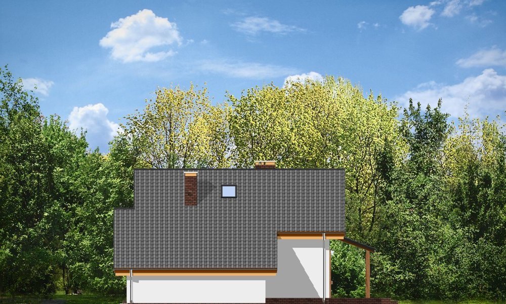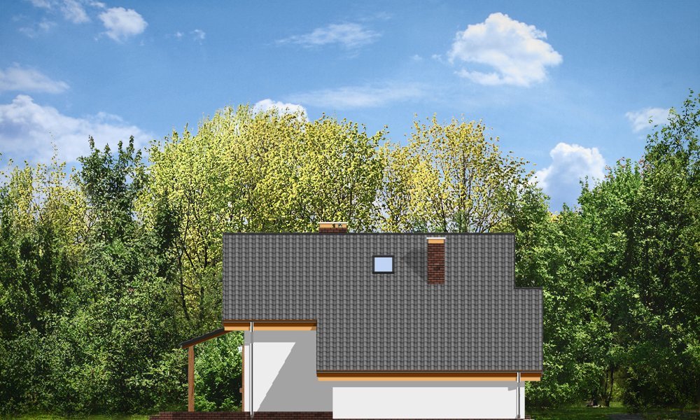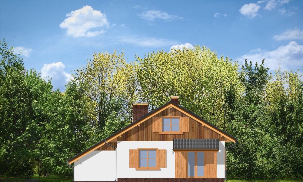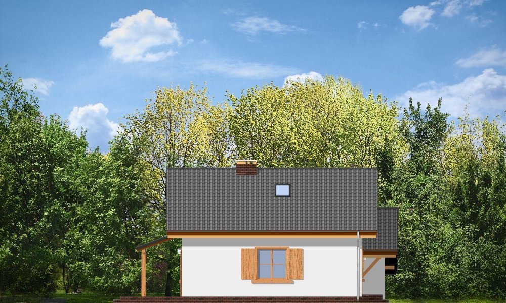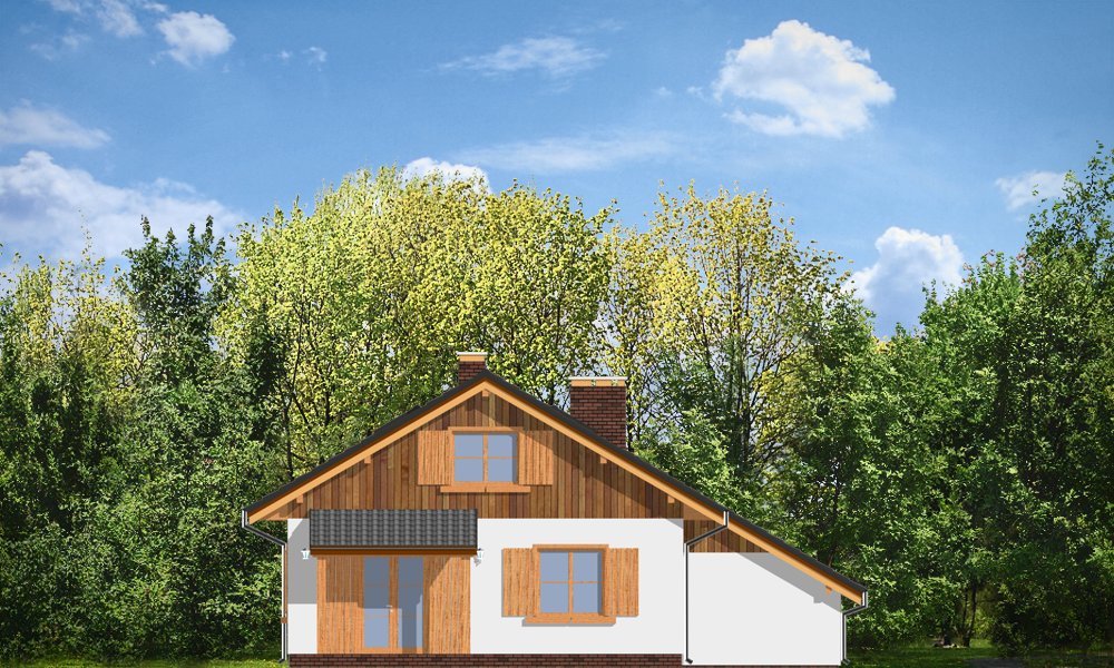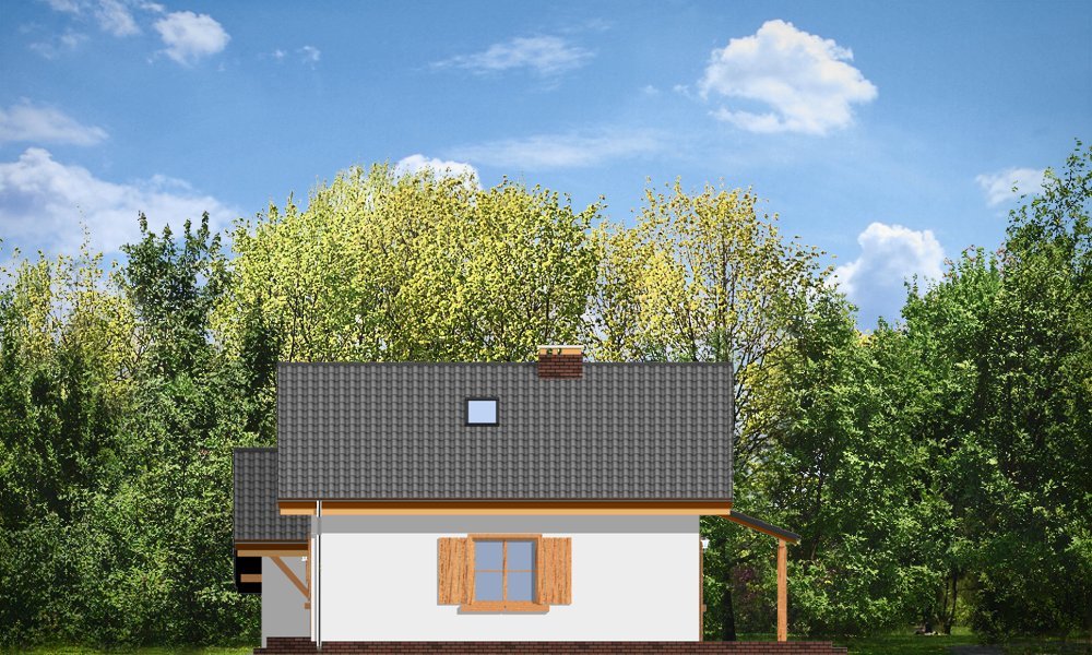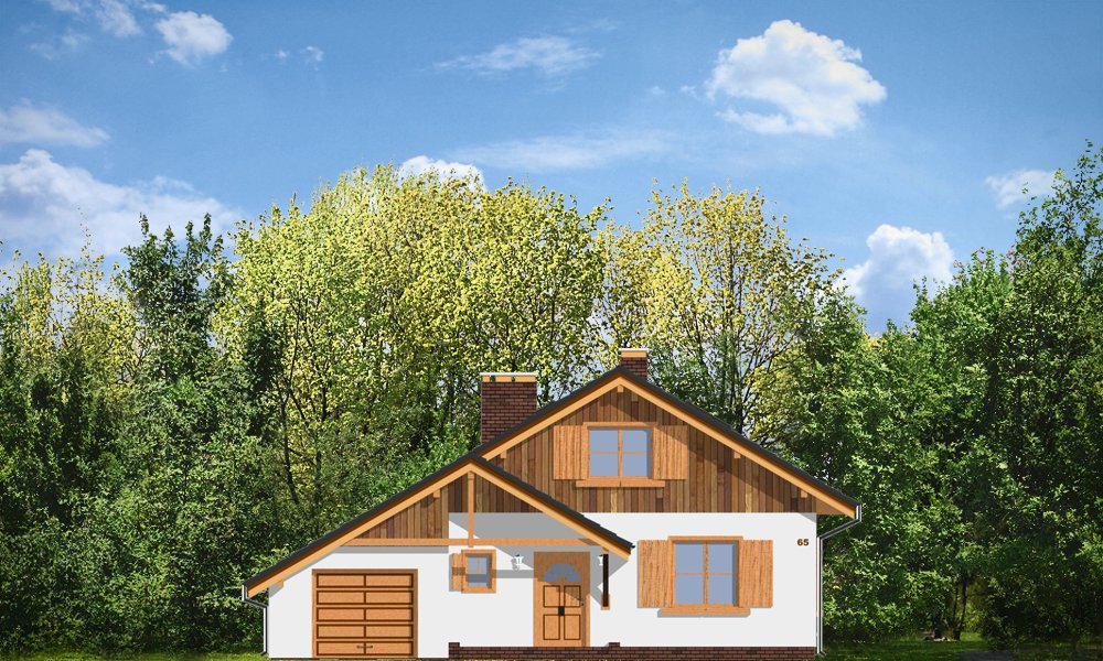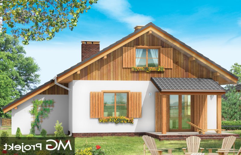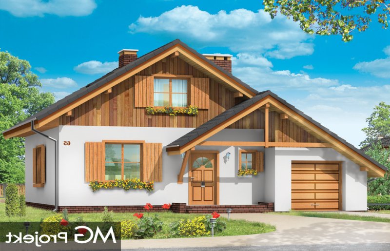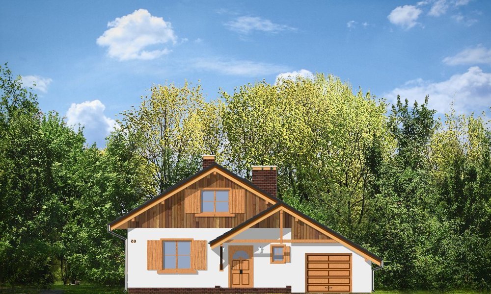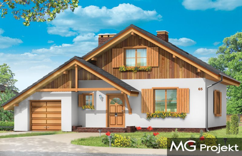 Pchełka z Garażem jest wariantową wersją projektu Pchełka, tym razem z dobudowanym garażem. Dom przeznaczony jest dla 4-5ciu osób, może być wykorzystany jako jednorodzinny całoroczny, lub jako letniskowy. Prosta bryła budynku, przekryta dwuspadowym dachem urozmaicona została daszkami z dużymi okapami - szczególnie fikuśnym dachem nad wejściem do domu. Wygodny garaż został dobudowany do jednego z boków i przekryty przedłużonym dachem domu. Domek jest bardzo zgrabny, ma dobrze dobrane proporcje i skalę. Ze względu na prosty układ konstrukcji budowa domu powinna być łatwa i niedroga. Wnętrze domu to, na parterze: salon z częścią jadalną połączony z kuchnią, pomieszczenie gospodarcze i garaż, łazienka i pokój - sypialnia rodziców. Na poddaszu zaplanowano dwie sypialnie dzieci i łazienkę. Dom został zaprojektowany tak, aby możliwe było wykończenie poddasza w drugim etapie.