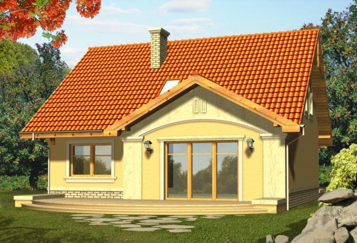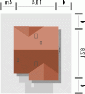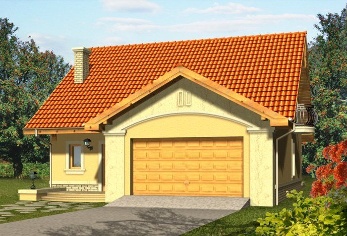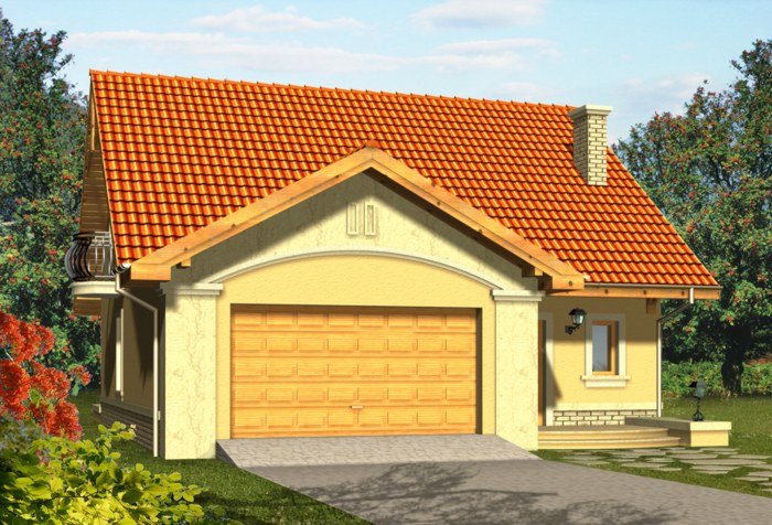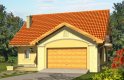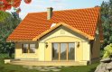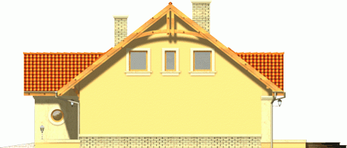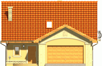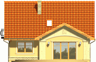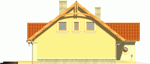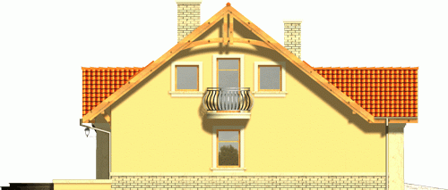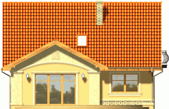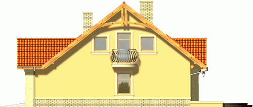 Dom średniej wielkości z garażem dwustanowiskowym lekko wysuniętym do przodu. Jego cechą charakterystyczną jest nieskomplikowana konstrukcja i prosta bryła przykryta dachem dwuspadowym. Urozmaiceniem elewacji ogrodowej jest bogato zdobiony szczyt podkreślający trójdzielne okno balkonowe łączące salon z tarasem.