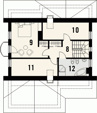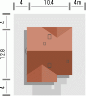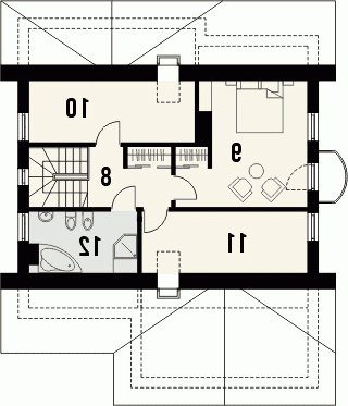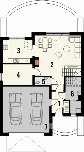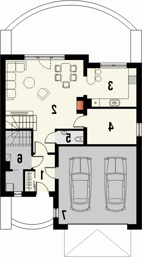 Budynek niepodpiwniczony, piętrowy z garażem dwustanowiskowym. Na parterze obok pokoju dziennego i kuchni znajduje się dodatkowy pokój, wc i pomieszczenie gospodarcze z pralnią. Na poddaszu pod dachem stromym zaprojektowano 3 sypialnie i łazienkę. Dokumentacja dostępna również w odbiciu lustrzanym.