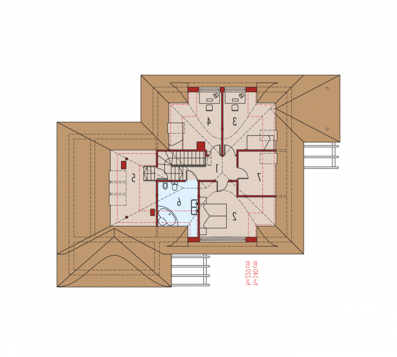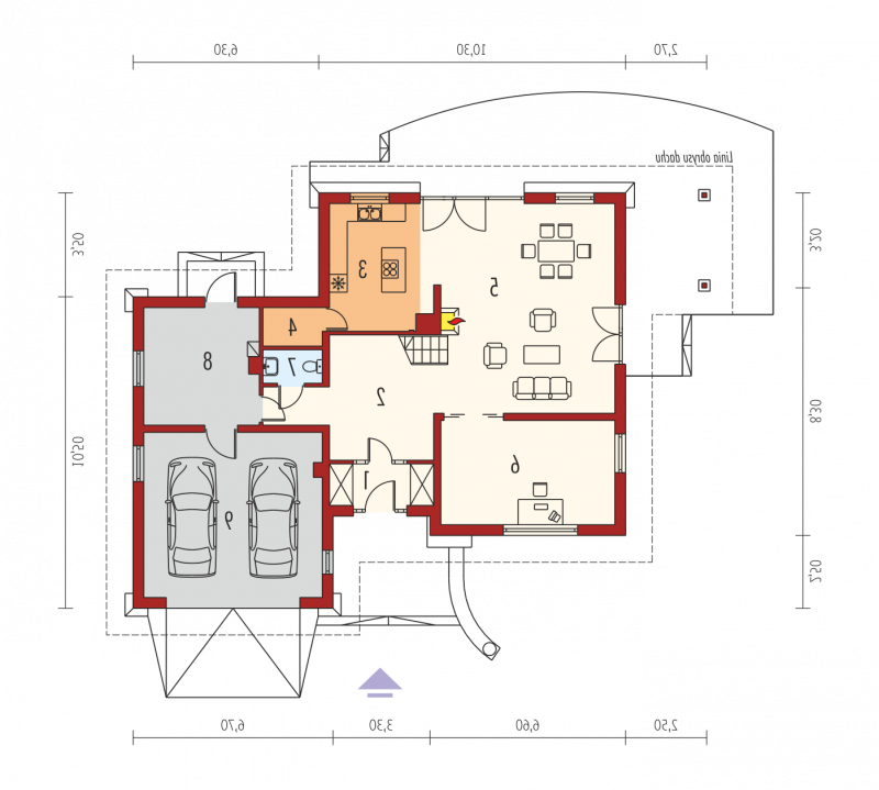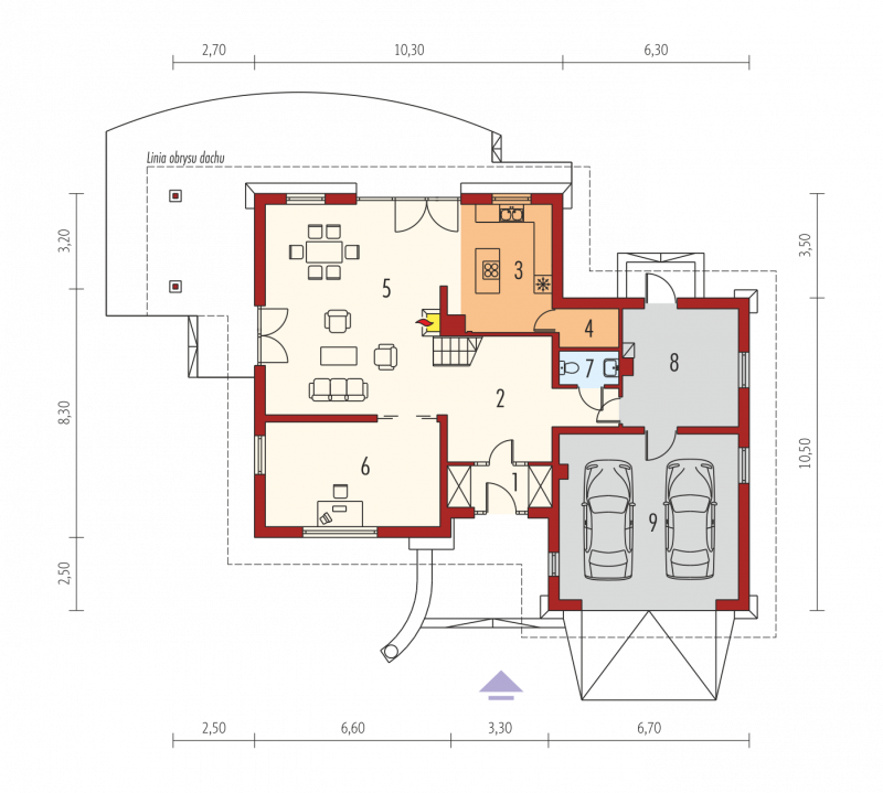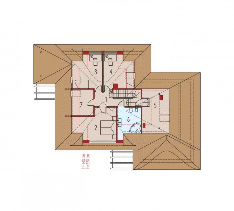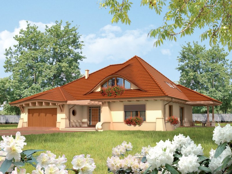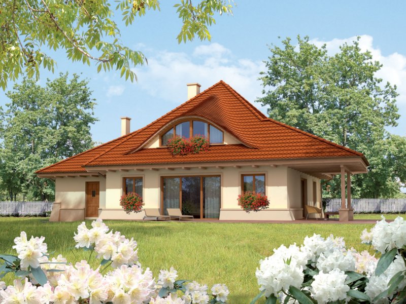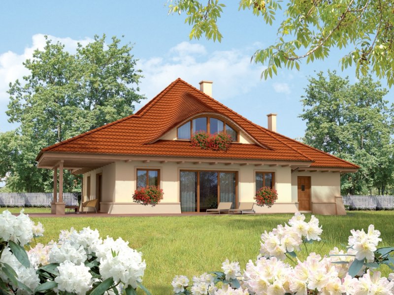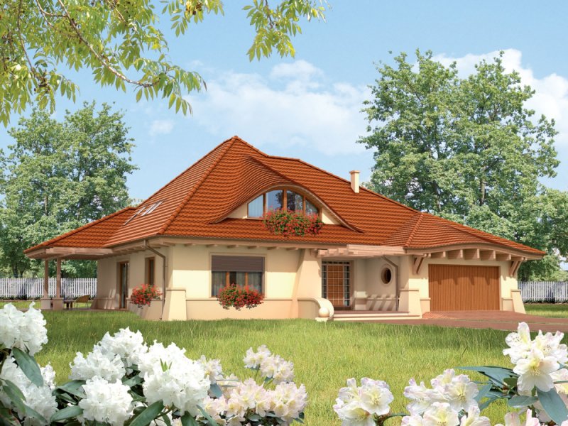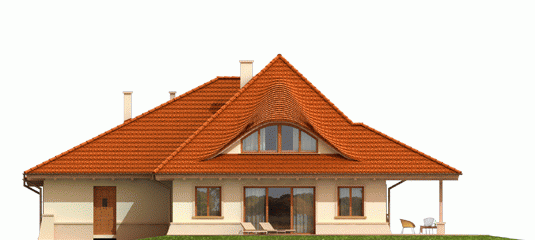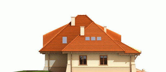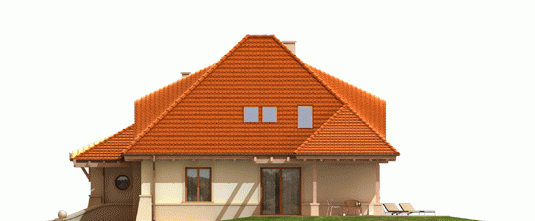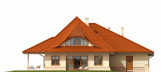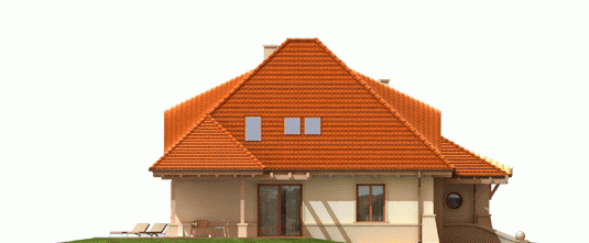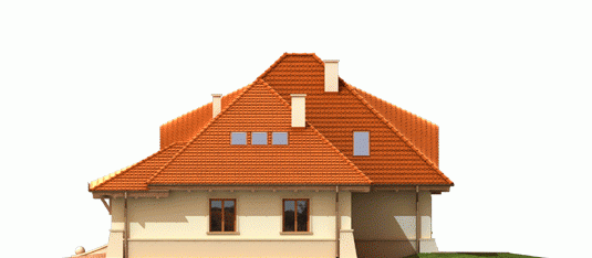 Dom parterowy z użytkowym poddaszem, niepodpiwniczony, z garażem dwustanowiskowym, przeznaczony dla 5-6-osobowej rodziny. Na parterze zaprojektowany został duży pokój dzienny z jadalnią i otwartą kuchnią , duży gabinet, oraz spora część gospodarcza połączona z dwustanowiskowym garażem. Znajdujące się w wygodnym holu schody prowadzą nas na poddasze gdzie zaprojektowano dwa pokoje, dużą sypialnię, łazienkę oraz garderobę. Dodatkowym atutem jest pomieszczenie nad garażem zagospodarowane na pomieszczenie fitness.