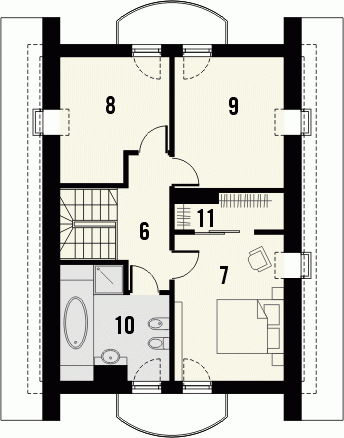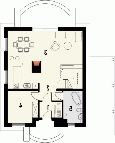 Budynek niepodpiwniczony, piętrowy, wariantowo z wiatą na samochód. Na parterze obok pokoju dziennego z otwartą kuchnią ze spiżarnią znajduje się dodatkowy pokój mogący pełnić też rolę gabinetu, a także łazienka z piecykiem c.o. Na poddaszu pod dachem dwuspadowym udało się zmieścić 3 sypialnie, w tym jedna z garderobą, oraz przestronną łazienkę. Dokumentacja dostępna również w odbiciu lustrzanym.