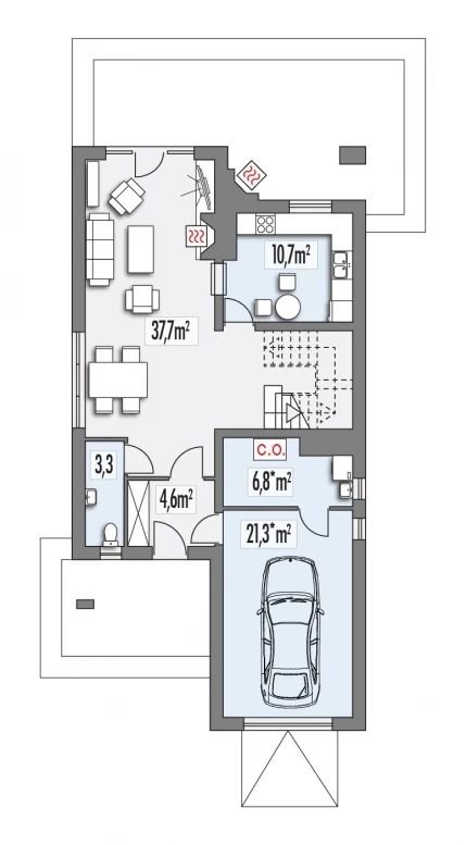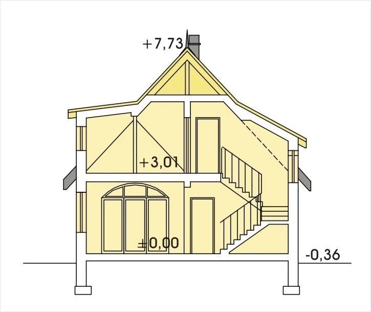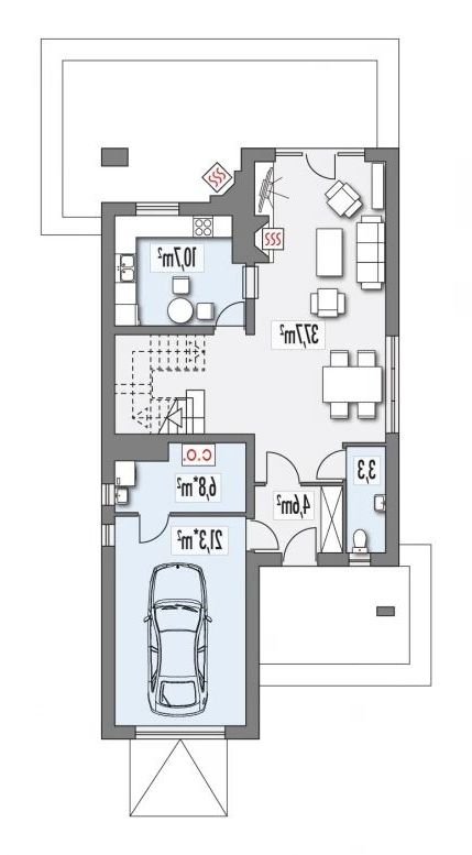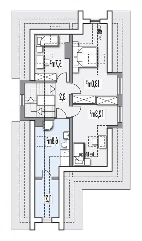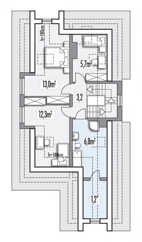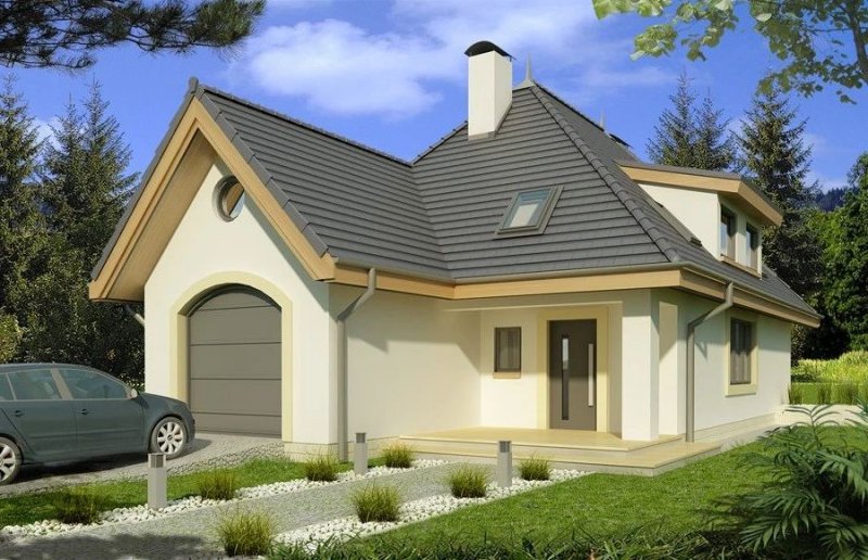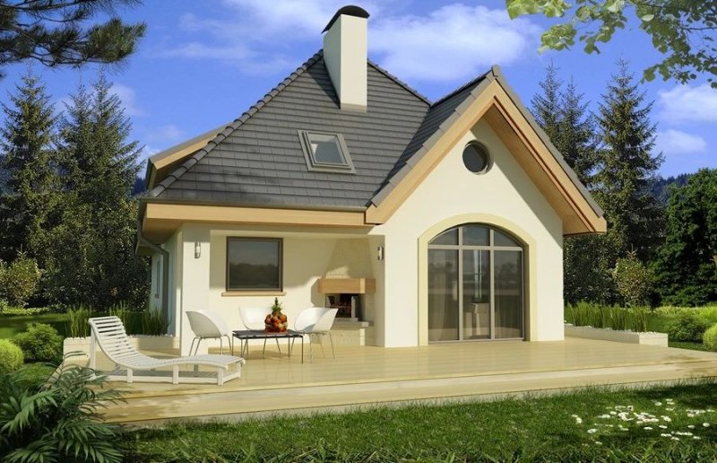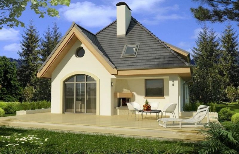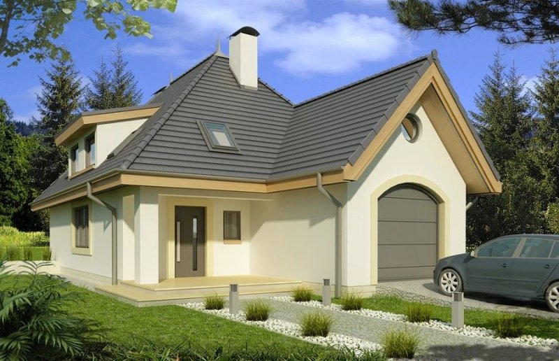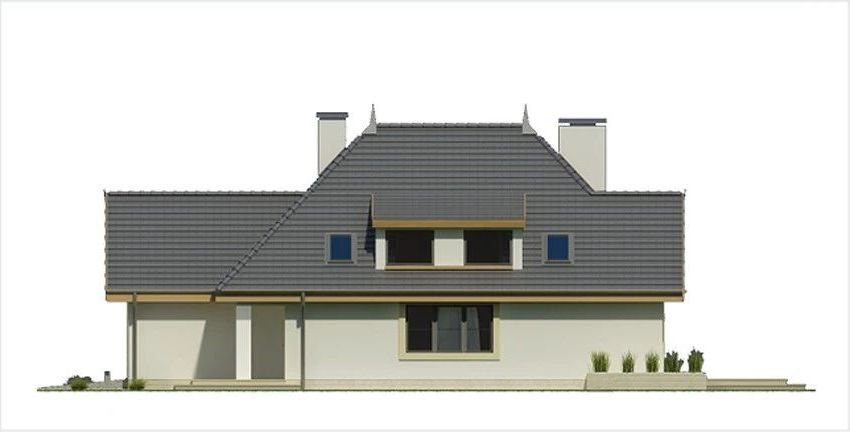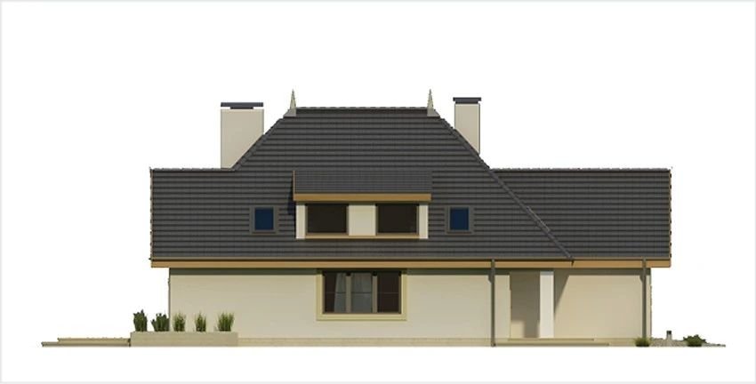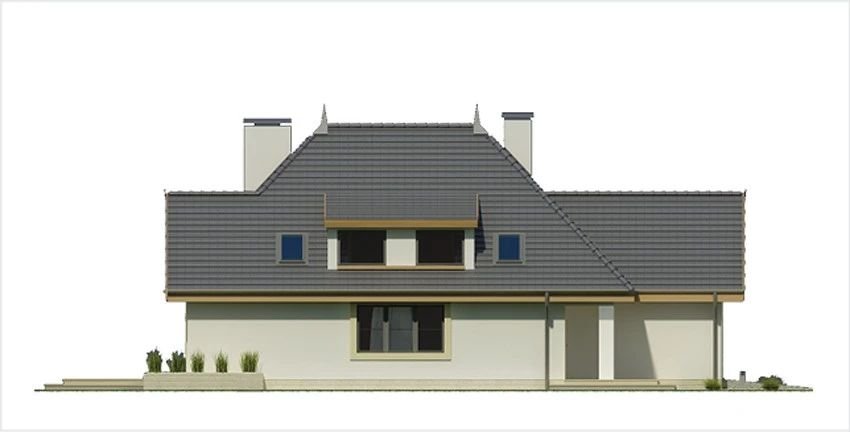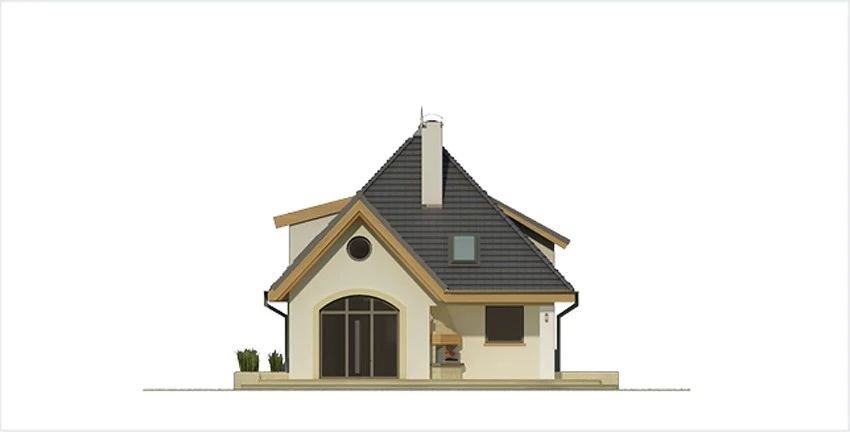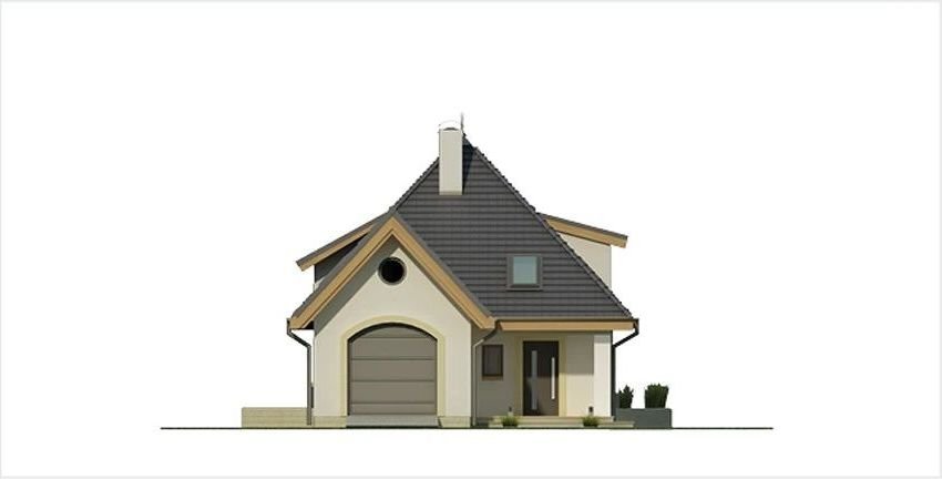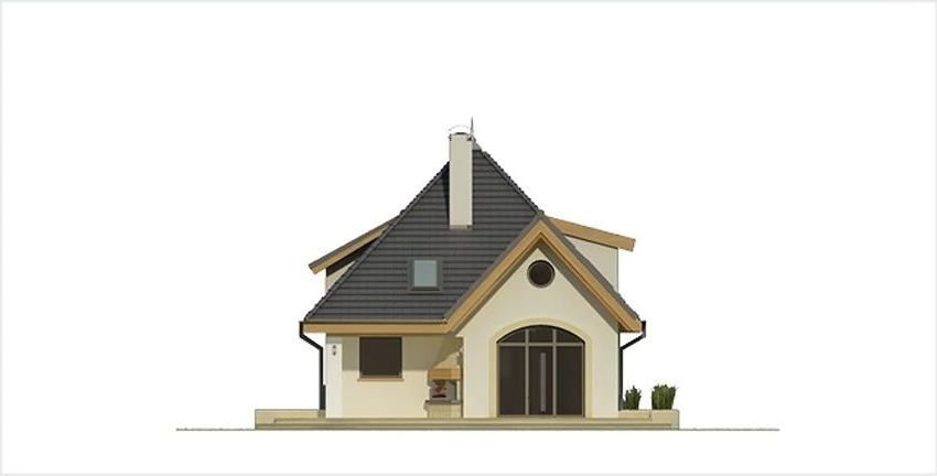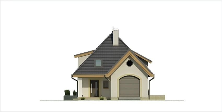 Nieduży, uroczy domek dla 4-osobowej rodziny. Mała szerokość pozwala umieścić dom na wąskiej działce. Parter to część dzienna i część gospodarcza. Poddasze to trzy sypialnie i łazienka z dostępem do stryszku.