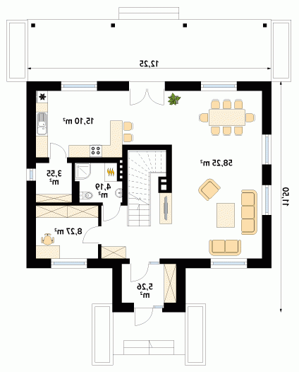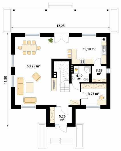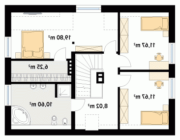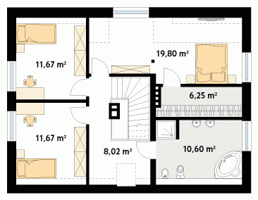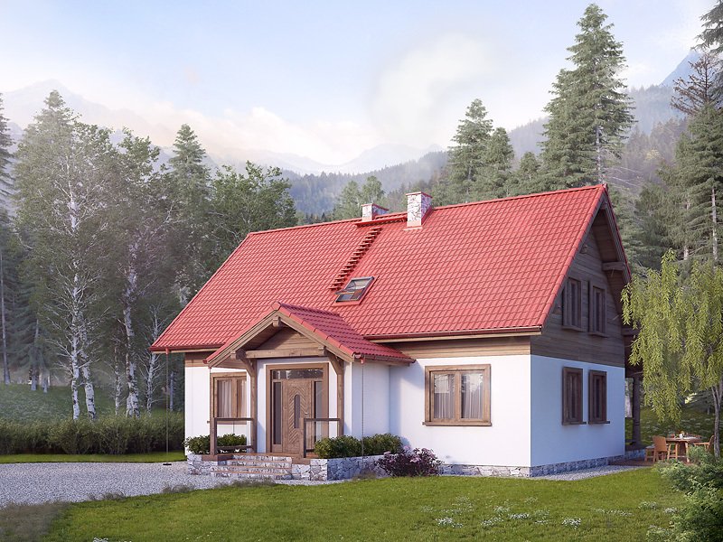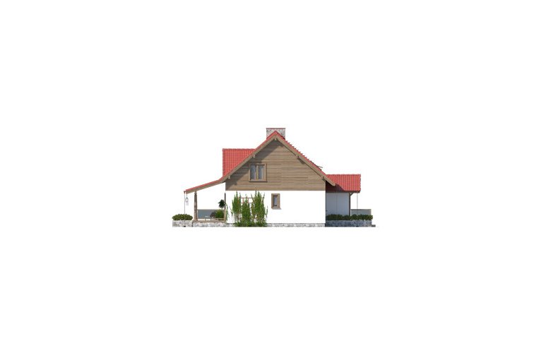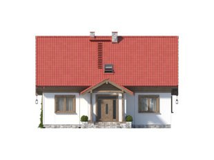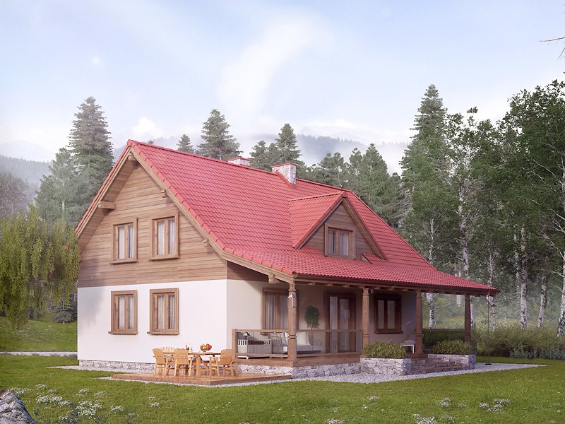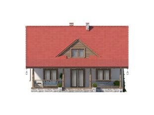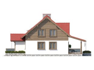 Poziomkowy to projekt tradycyjnego domu z użytkowym poddaszem, zaprojektowany jako budynek całoroczny, choć z powodzeniem może pełnić funkcję domu rekreacyjnego. Wykończenie elewacji drewnianymi elementami w połączeniu z czerwoną dachówką sprawia, iż dom idealnie wkomponuje się w podmiejskie otoczenie. Parter stanowi część dzienną, na którą składa się salon z jadalnią oraz wydzielona przestrzeń kuchenna ze spiżarnią. Dodatkowo na parterze znajduje się również pokój gościnny (gabinet) oraz łazienka, w której przewidziano miejsce na piec gazowy. Poddasze stanowi część nocną, na którą składają się trzy sypialnie, garderoba oraz łazienka. Niewątpliwym atutem projektu jest zadaszony taras biegnący wzdłuż całej elewacji ogrodowej, dzięki któremu można spędzać czas na świeżym powietrzu niezależnie od pogody.