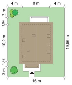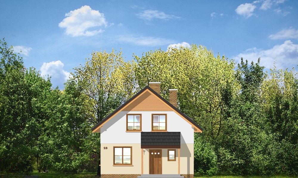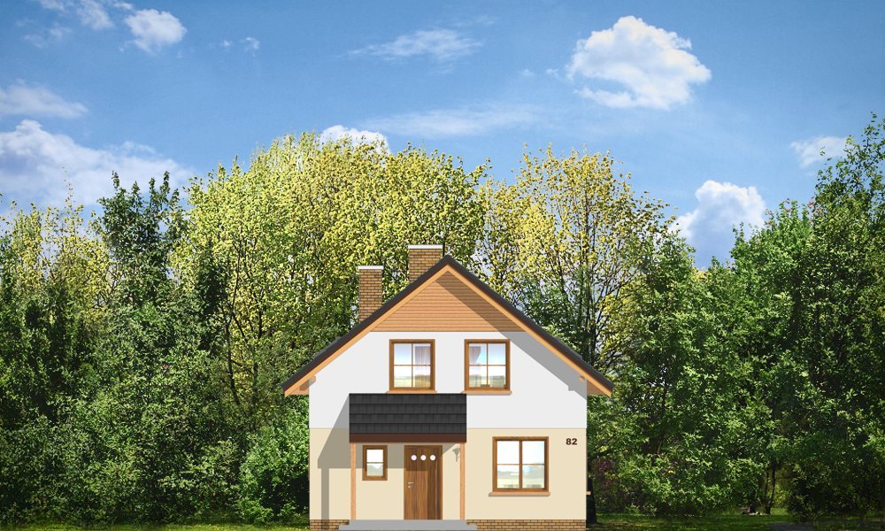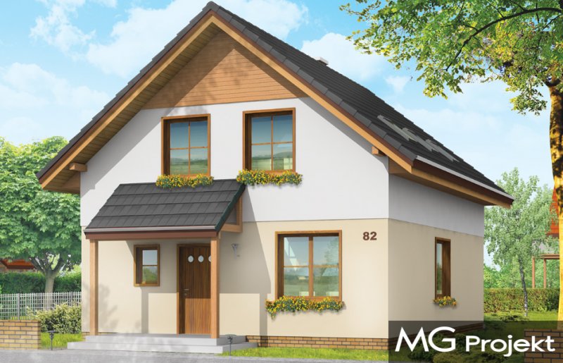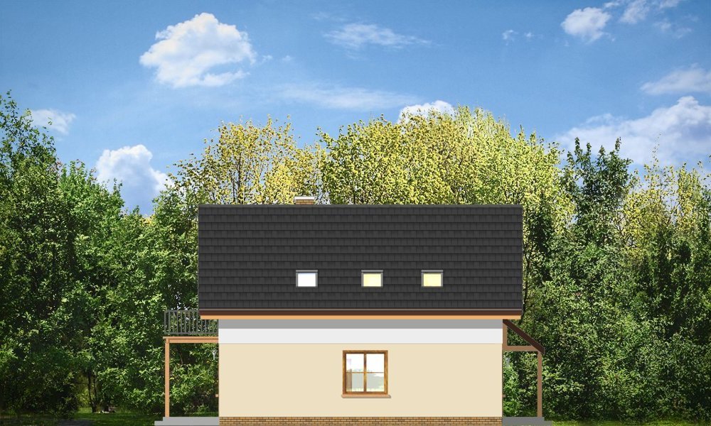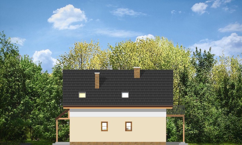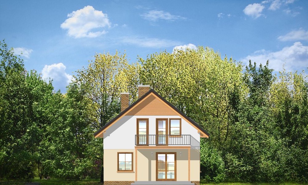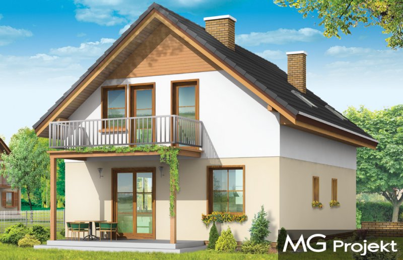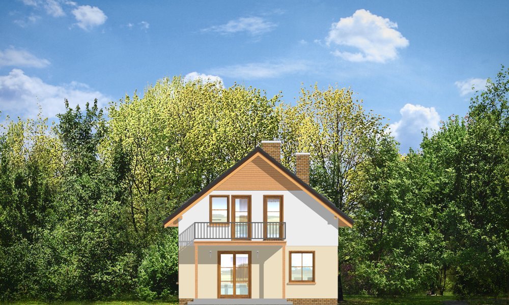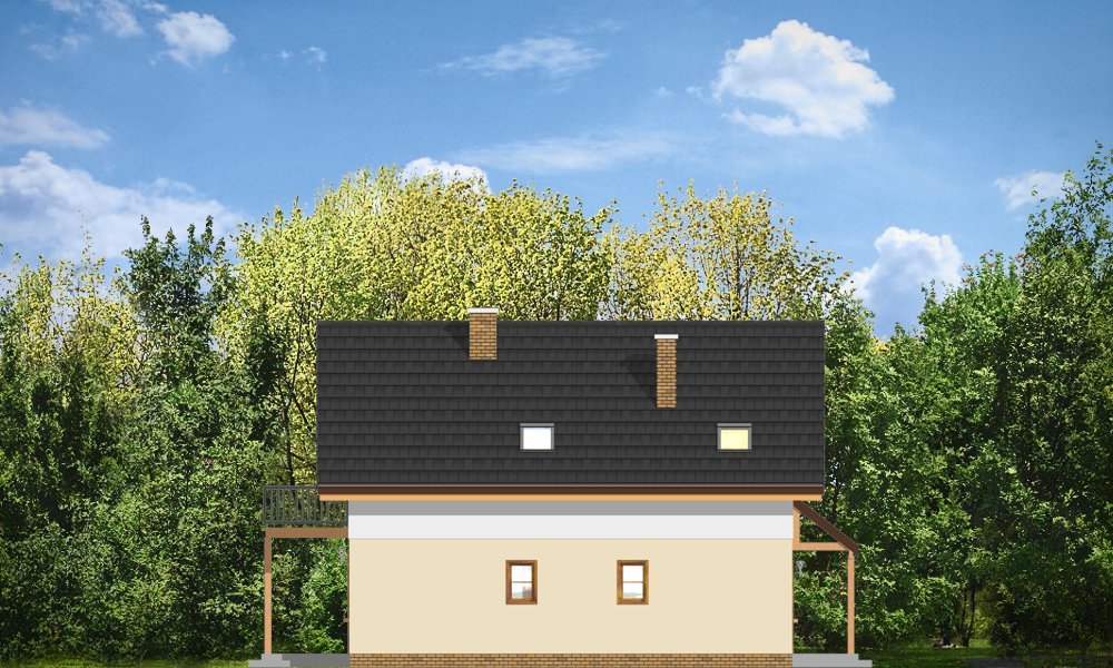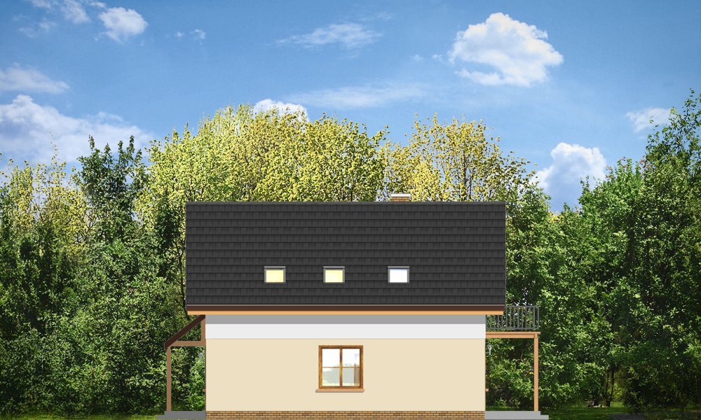 Praktyczny A to niewielki domek jednorodzinny dla czteroosobowej rodziny. Budynek parterowy z poddaszem użytkowym. Ten sam projekt przedstawiamy w dwóch wersjach wariantowych - jako dom jednorodzinny dla jednej rodziny, oraz jako dom dwulokalowy - z wydzielonymi dwoma mieszkaniami na parterze i na poddaszu. Prezentowana wersja projektu to budynek jednorodzinny. Bryła budynku jest bardzo prosta, na pewno nie będzie trudna w budowie. Dobrze dobrane proporcje domu i detale architektoniczne powodują, że wygląd zewnętrzny budynku jest bardzo atrakcyjny. Wewnątrz na parterze zaprojektowano pokój dzienny połączony przestrzennie z holem ze schodami i z kuchnią, oraz pomieszczenie gospodarcze i dodatkowy pokój - gabinet lub sypialnię gościnną. Na piętrze zaplanowano trzy sypialnie, w tym jedna jako apartament rodziców z własną łazienką i garderobą, oraz ogrodowym tarasem. Dom pomimno niedużej powierzchni mieści w sobie wiele pomieszczeń i rozwiązania funkcjonalne spotykane w dużych domach. Siłą projektu jest jego prostota i maksymalnie klarowny układ funkcjonalny.