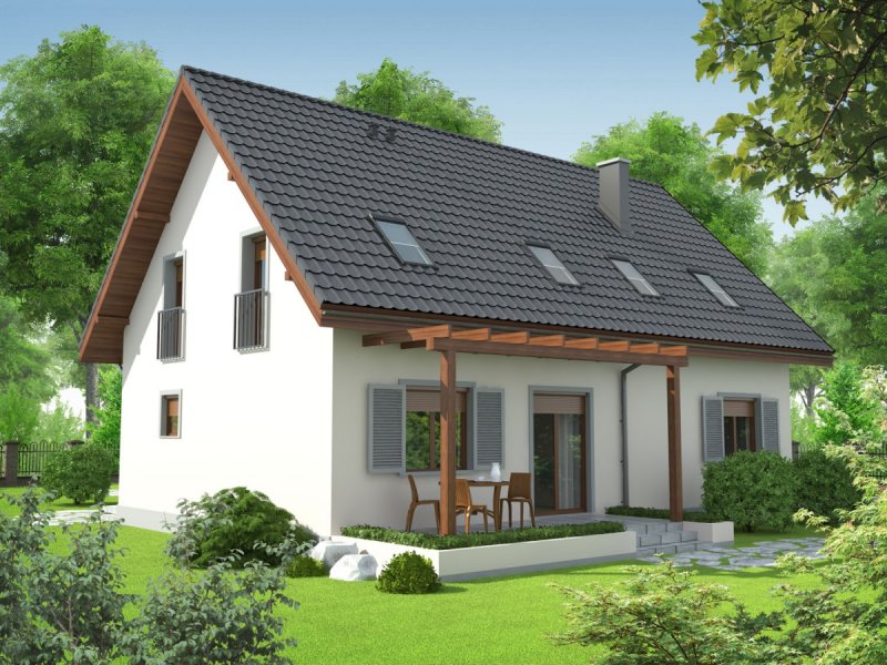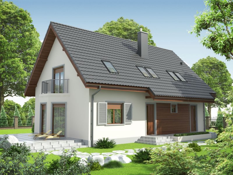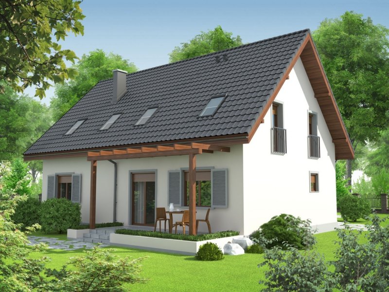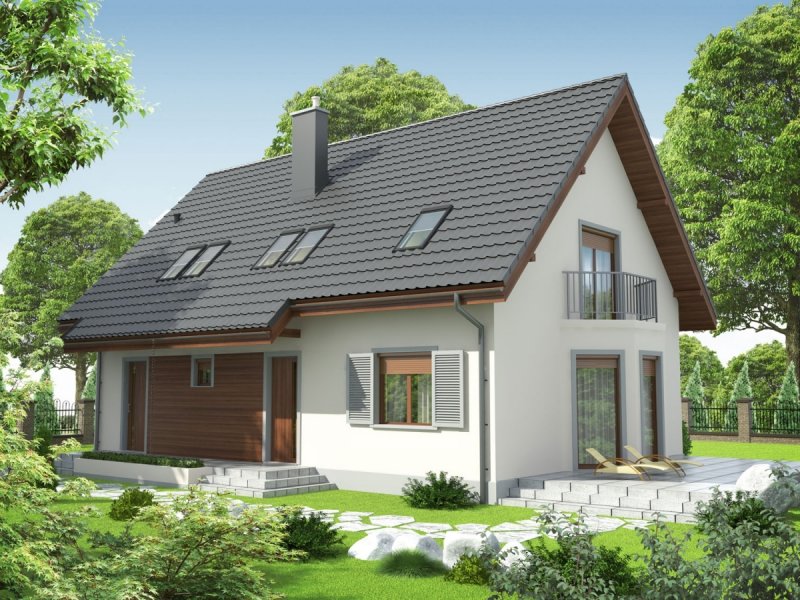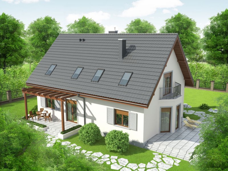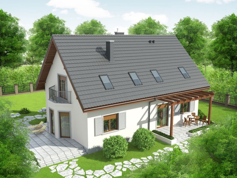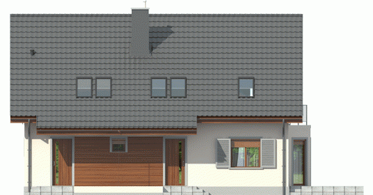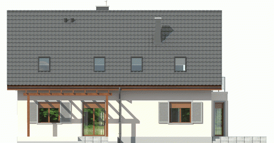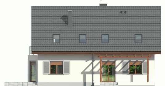 Dom zaprojektowany w technologii murowej ze stropem gęstożebrowym. Dach o konstrukcji drewnianej pokryty dachówką cementową IBF. Elewacje wykończono tynkiem mineralnym i okładziną drewnianą, ceramiczną lub kamienną, cokół – akrylowy. Stolarka okienna drewniana lub PCV. Rolety zewnętrzne naokienne w systemie CleverBox firmy BeClever.