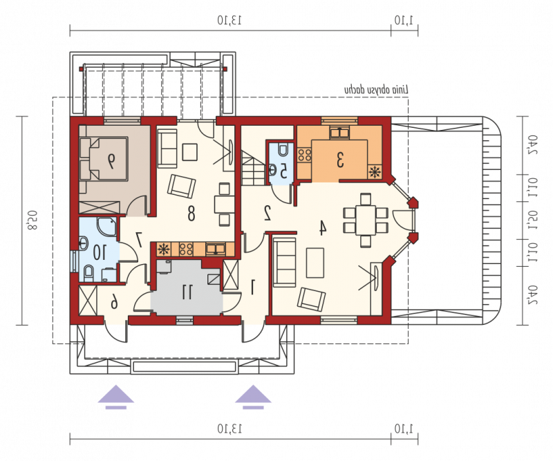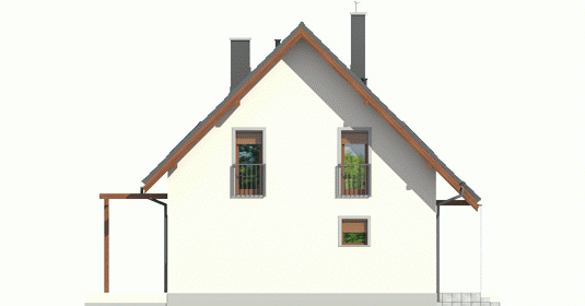 Dom dwulokalowy, parterowy, z poddaszem użytkowym, niepodpiwniczony. Większy lokal przeznaczony jest dla 3-4-osobowej rodziny, mniejszy dla 2-osobowej. Istnieje możliwość zachowania komunikacji pomiędzy lokalami, poprzez wspólne pomieszczenie gospodarcze. Układ funkcjonalny większego lokalu został zaplanowany na dwóch kondygnacjach. Na parterze mieści się strefa dzienna z salonem, aneksem jadalnym oraz kuchnią. Dodatkowo, zaprojektowano tu również toaletę. Schody prowadzą z holu na poddasze, gdzie znajduje się komfortowa strefa nocna, którą tworzą trzy sypialnie (w tym jedna z dostępem do praktycznej garderoby) oraz łazienka. Osobna toaleta oraz dodatkowa garderoba są dostępne z korytarza. Mniejszy lokal mieści się na parterze, gdzie zaplanowano salon połączony z jadalnią i kuchnią, sypialnię oraz łazienkę. Raul oferuje możliwość zamieszkania pod jednym dachem dwóm rodzinom, przy jednoczesnym zachowaniu prywatności i wygody. Starannie dopracowany układ funkcjonalny domu, gwarantuje mieszkańcom najwyższy komfort użytkowy. Oba lokale posiadają atrakcyjne strefy dzienne, wyposażone w salony z dostępem do czarujących atmosferą tarasów. Z zewnątrz Raul prezentuje się równie imponująco – biel tynku doskonale kontrastuje z ciemnym kolorem stolarki i dachu, dzięki czemu dom nabiera szykownego wdzięku. Istnieje możliwość podpiwniczenia budynku.