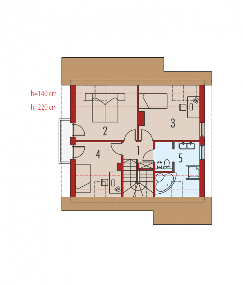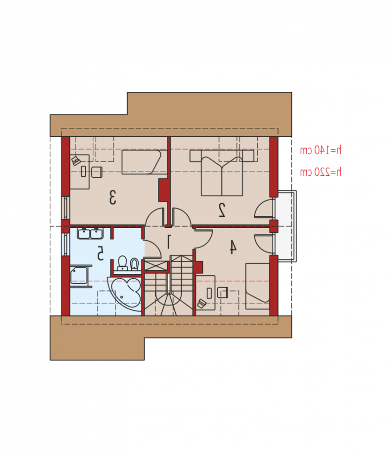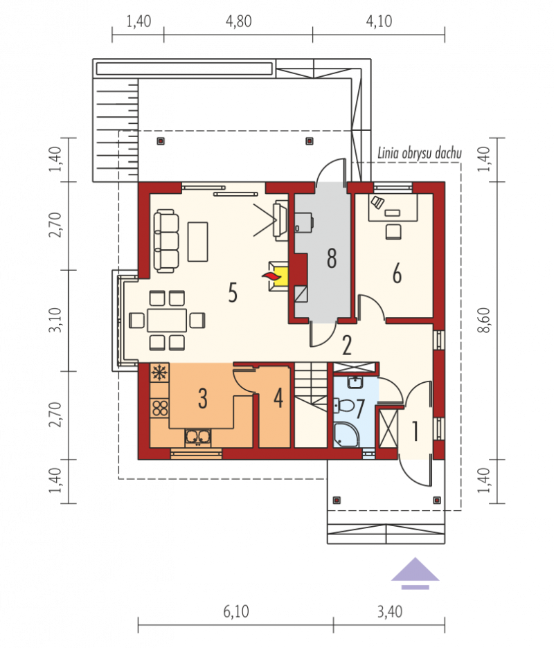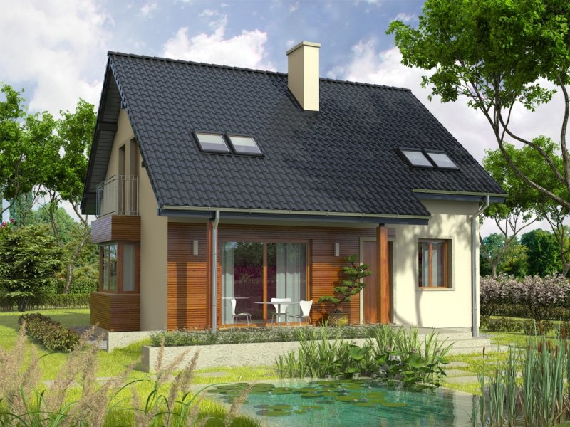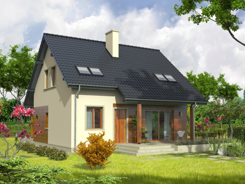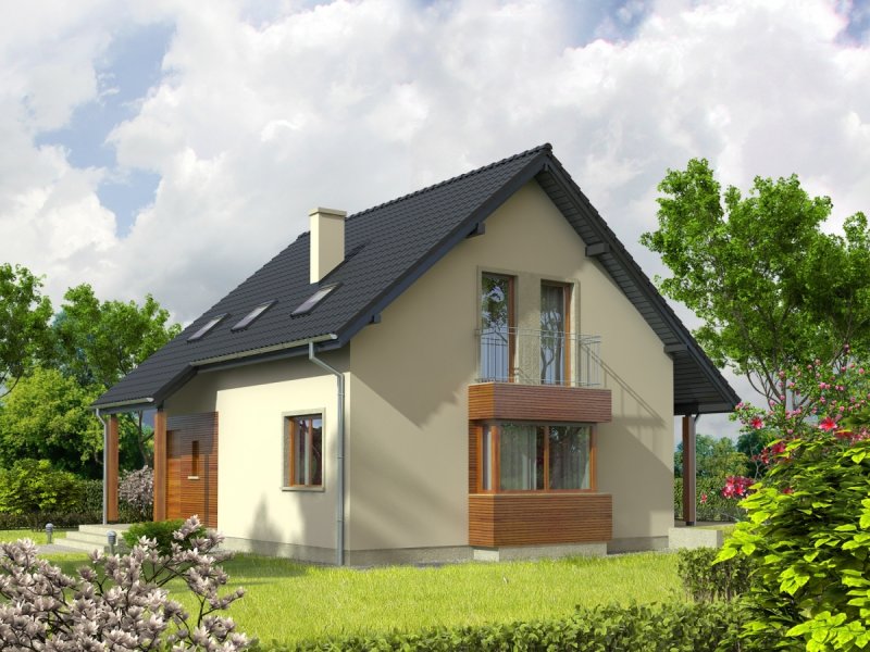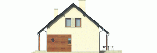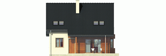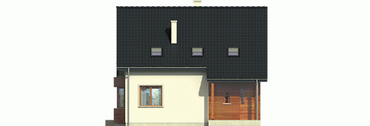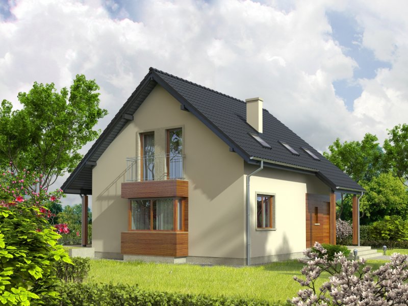 Dom parterowy z poddaszem użytkowym, niepodpiwniczony. Przeznaczony dla 3-4-osobowej rodziny. Strefę dzienną zaprojektowaną na parterze wyróżnia otwarty, przestronny układ pomieszczeń. Tworzą ją salon, doświetlona jadalnia, kuchnia ze spiżarnią, toaleta oraz pomieszczenie gospodarcze. Dla preferujących pracę w domowym zaciszu wydzielono wygodny, funkcjonalny gabinet. Strefa nocna została zlokalizowana na poddaszu, w jej skład wchodzą dwa pokoje, sypialnia oraz łazienka. Atrakcyjnym elementem domu jest także balkon dostępny z dwóch pokoi na poddaszu. Imponującą częścią domu jest rozłożysty taras, na którym można zażywać słonecznych kąpieli, relaksować się z przyjaciółmi lub zmrużyć oczy i zatopić się w zapachu ogrodowych kwiatów. Dom dostępny także w wersji z garażem jednostanowiskowym.