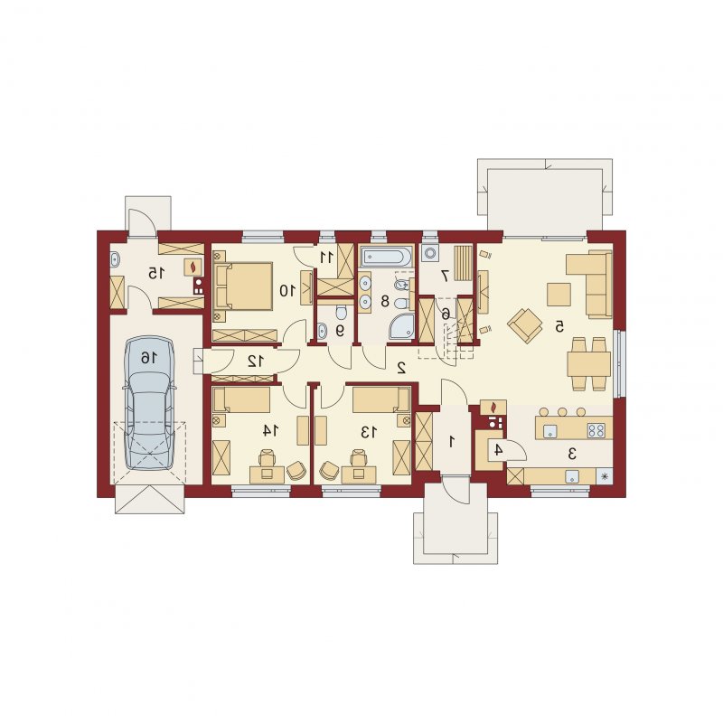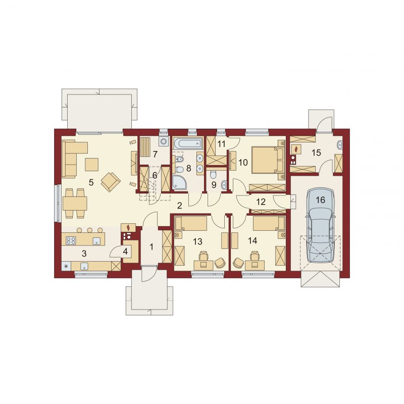 Strefa dzienna składa się z przestronnego salonu połączonego z jadalnią i otwartą kuchnią (którą można z łatwością zamknąć) uzupełnioną o spiżarnię. Strefa nocna obejmuje trzy sypialne (główną z własną garderobą) oraz podręcznego pomieszczenia gospodarczego zapewniającego wygodny dostęp do garażu i pojemnej kotłowni. Część dzienną i nocną oddziela pasmo pomieszczeń pomocniczych z garderobą, pralnią, bogato wyposażoną łazienką i praktyczną dodatkową toaletą.