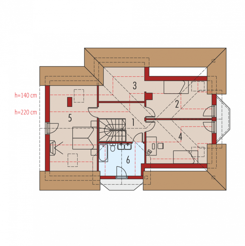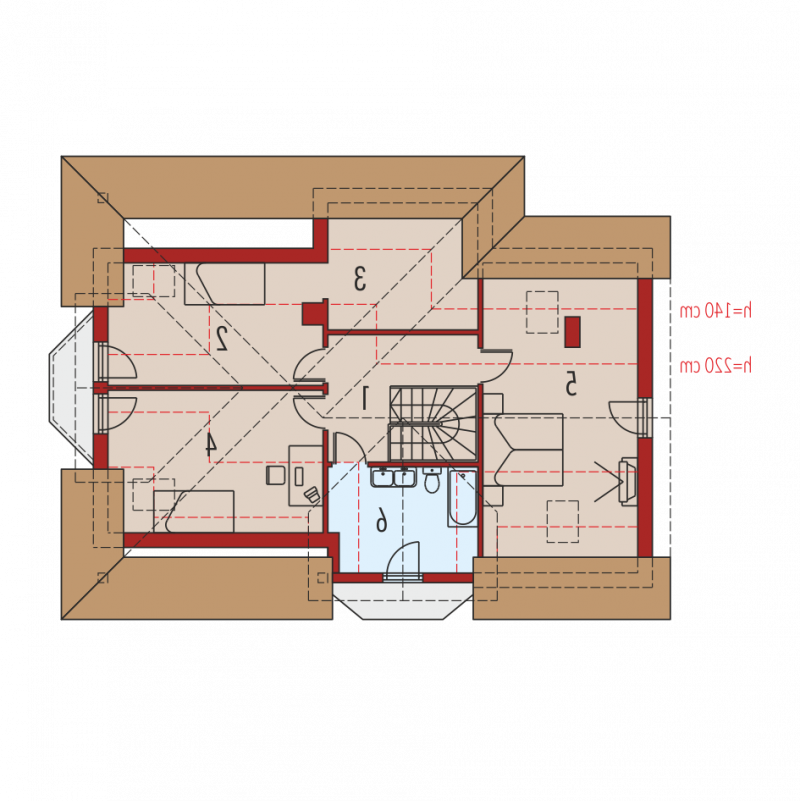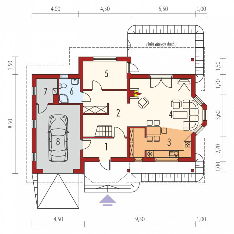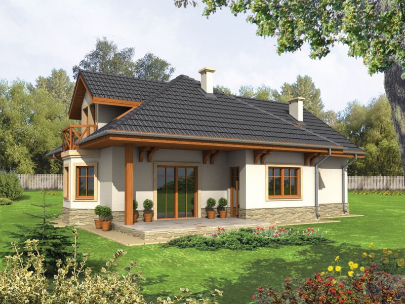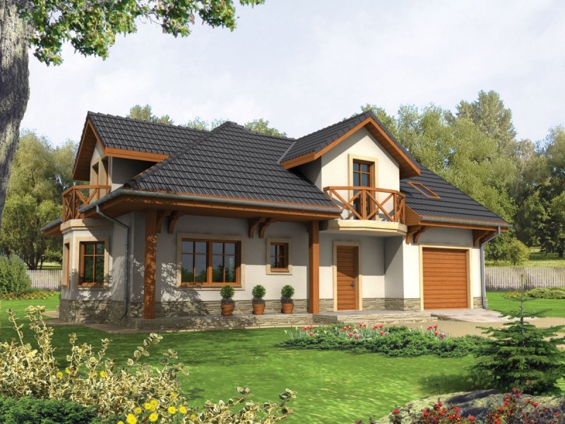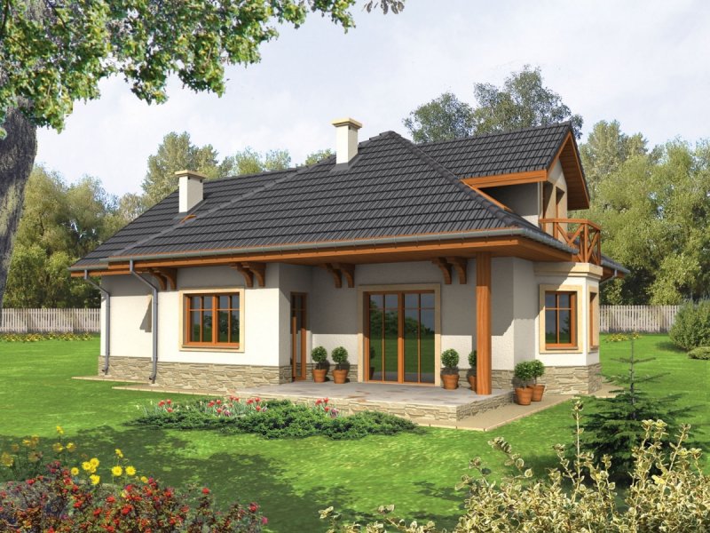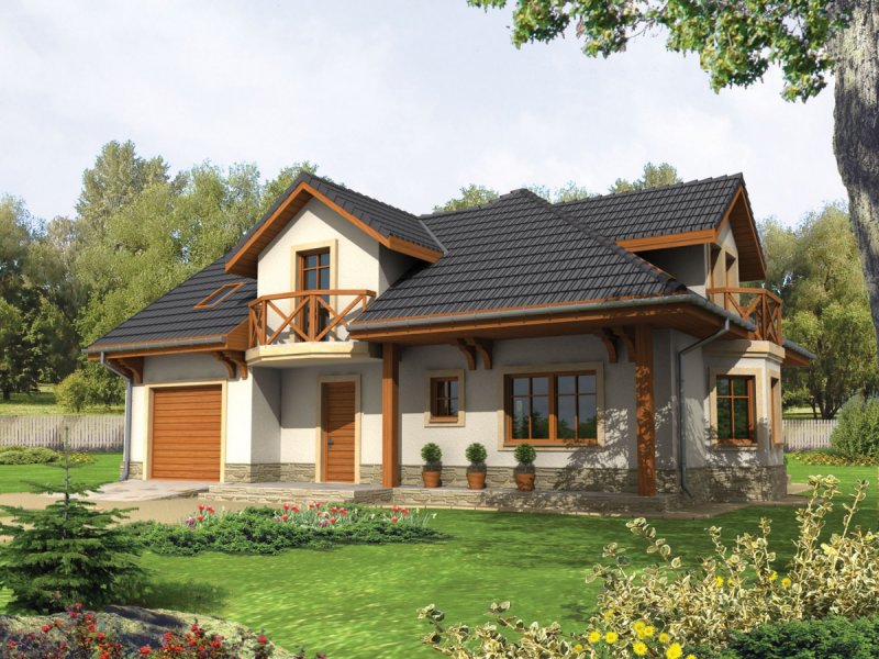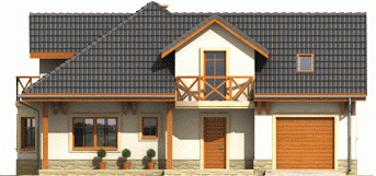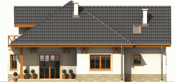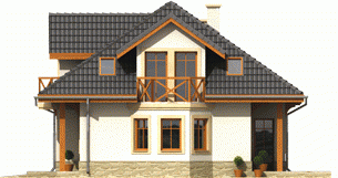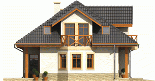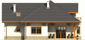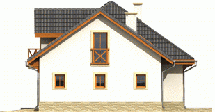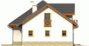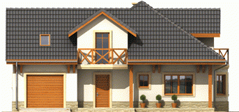 Dom parterowy z poddaszem użytkowym, niepodpiwniczony, z garażem jednostanowiskowym, przeznaczony dla 3-5-osobowej rodziny. Zastosowane podcienie oraz lukarna pozwoliły na ciekawe wyeksponowanie strefy wejściowej. Parter to przede wszystkim wyraźnie zarysowana komunikacja oraz część wypoczynkowa. Wygodny salon z kominkiem połączony jest z kuchnią i jadalnią. Zaproponowany w projekcie wykusz podnosi walory użytkowe i estetyczne budynku. Na poddaszu znajdują się trzy sypialnie oraz wygodna łazienka.