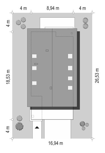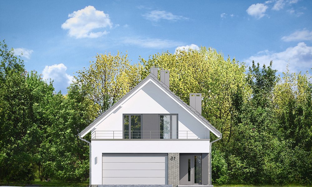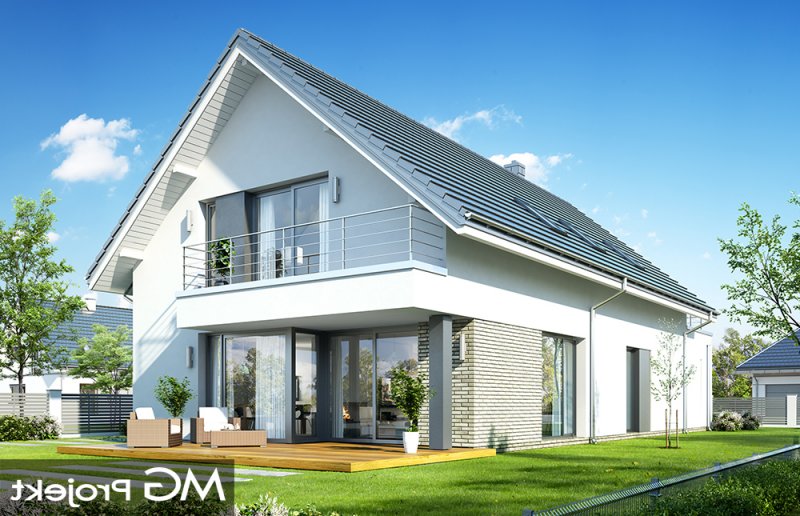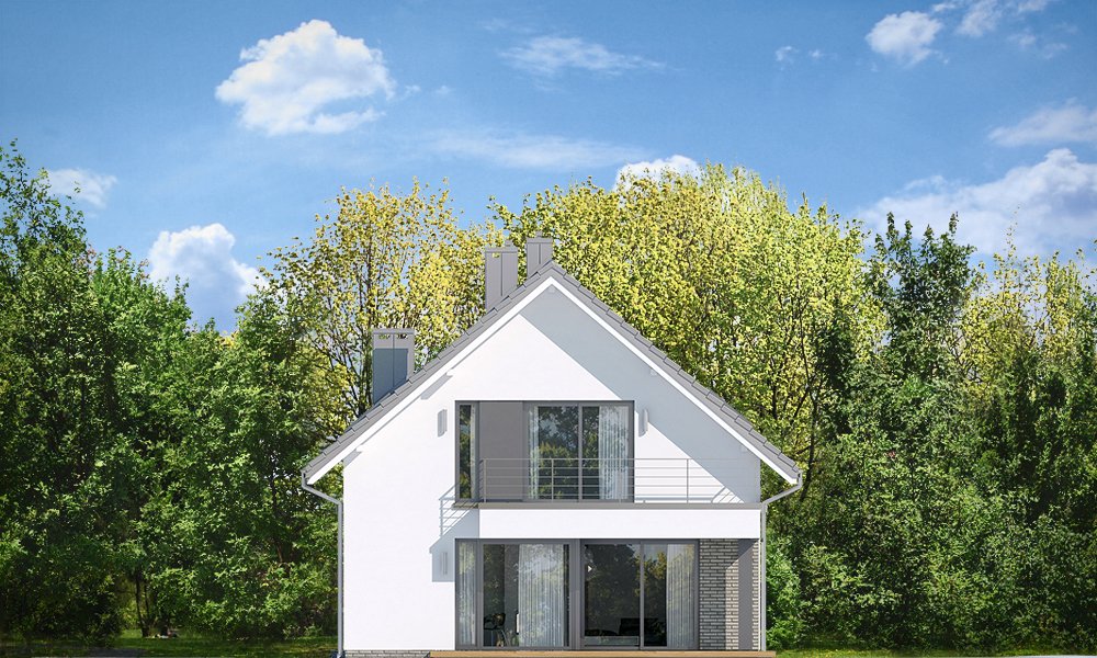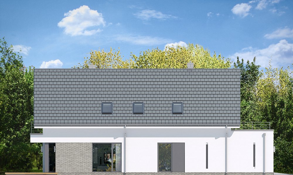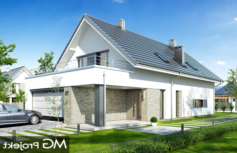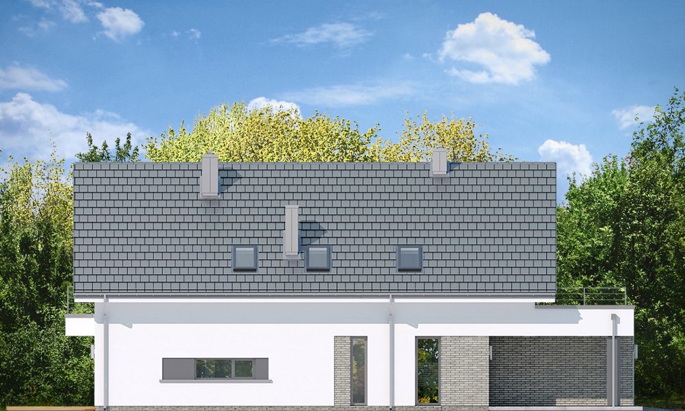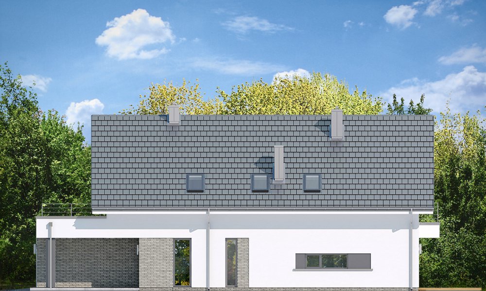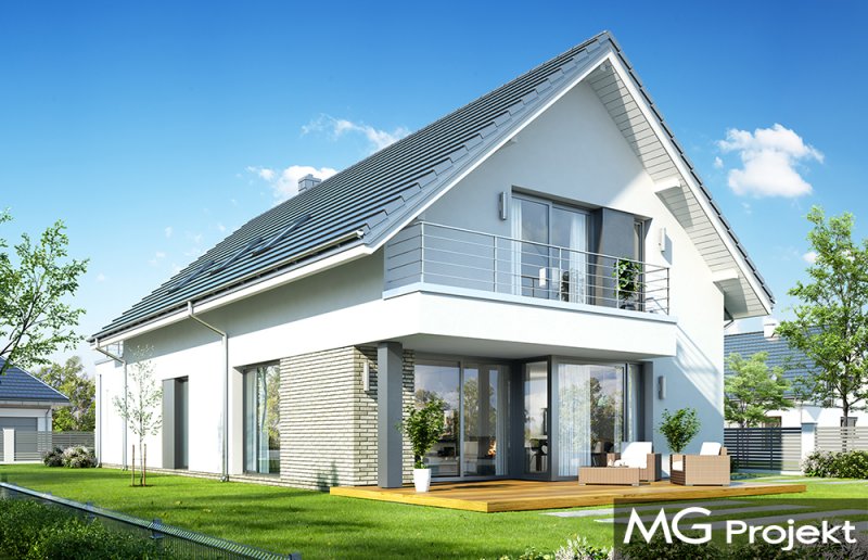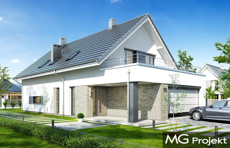 Salsa to jeden z projektów z serii domów wywodzących się z projektu „Party” (Party, Party 2, Rumba, Biba, Fokstrot, Samba, Tango). Salsa to dom jednorodzinny przeznaczony dla cztero-sześcioosobowej rodziny. Dom parterowy z poddaszem użytkowym, o prostej bryle przykrytej dwuspadowym dachem, z wystającą nieco poza główną bryłę parterową częścią garażu. Projekt przeznaczony jest na wąską działkę, która nie pozwala na budowę budynku o szerokiej elewacji frontowej. Minimalna szerokość działki to 16,9 metrów, ale zamieniając w jednej z bocznych elewacji okna na luksfery możemy posadowić dom na działce o szerokości poniżej 16-tu metrów (nawet na działce o szerokości 14,6 m - jeśli jest zgoda na zbliżenie się ścianą bez okien na 1,5 m od granicy). Prosta spokojna bryła domu połączona z nowoczesną formą i zastosowanymi materiałami daje atrakcyjną sylwetkę „Salsy”. Front domu ozdabia duży podcień wejściowy, z reprezentacyjnymi drzwiami. Od strony ogrodu mamy z kolei częściowo zadaszony taras, piękne przeszklone otwarcie przestrzeni dziennej na ogród, oraz taras –balkon poddasza. Nowoczesna stonowana kolorystyka domu pozwoli „Salsie” właściwie wkomponować się w dowolne sąsiedztwo. Wnętrze domu zaprojektowano sytuując garaż obok wejścia, od frontu. Z sieni przechodzimy szerokimi szklanymi drzwiami do holu. Hol ma bardzo poręczną wnękę z dużą szafą przy przedsionku. Z holu otwiera się nam piękny widok na salon z pustką nad częścią jego powierzchni i nad schodami będącymi ozdobą wnętrza. Obok mamy bardzo praktyczną kuchnią typu „wagon”, oraz przestronny aneks jadalny. Salon i jadalnia łączą się przeszklonymi drzwiami z tarasem i ogrodem. Z holu możemy dostać się jeszcze do dodatkowego pokoju (np. gabinet), oraz wc. Na poddaszu mamy piękny holl- antresolę, widoczną z salonu na dole. Antresola stanowi most łączący apartament rodziców (z sypialnią, bardzo ładną garderoba, łazienką i balkonem-tarasem ogrodowym), z częścią poddasza przeznaczoną na dwie sypialnie dzieci, łazienkę i pralnię. Sypialnie dziecięce również mają wyjście na drugi balkon-taras. Dom ma prostą bryłę, nowoczesną architekturę, piękne wnętrze z pustką nad salonem - no i przede wszystkim jest to doskonały projekt na wąską działkę. Do tego dom ma prostą konstrukcję - będzie niedrogi w budowie i późniejszym utrzymaniu. Wąska działka nie musi być wcale wadą - wystarczy zdecydować się na właściwy projekt - oczywiście najlepsza jest Salsa :) ! Zapraszamy !