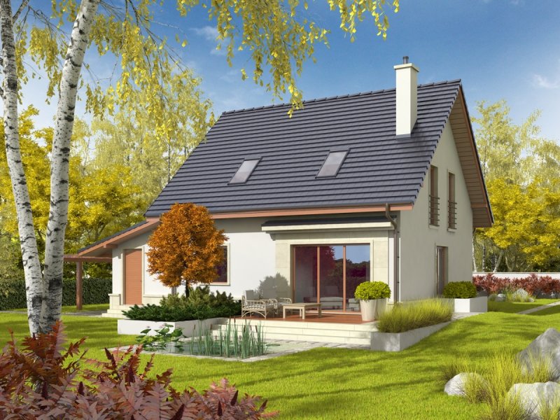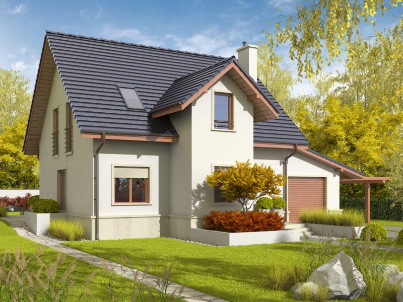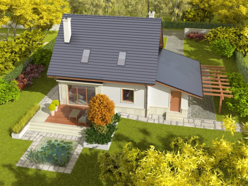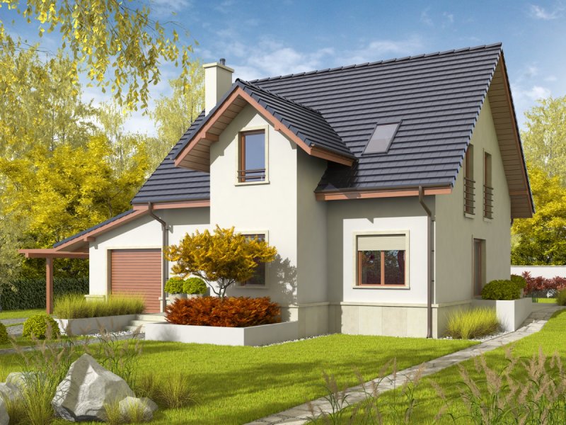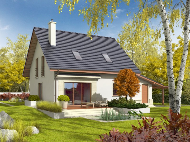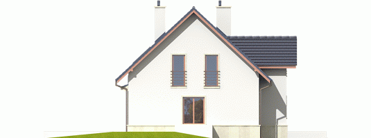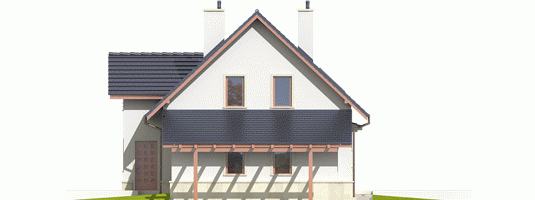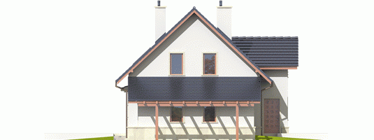 Dom zaprojektowany w technologii murowej ze stropem gęstożebrowym. Schody wewnętrzne drewniane. Dach o konstrukcji drewnianej pokryty dachówką ceramiczną Röben. Elewacje wykończono tynkiem mineralnym, cokół - kamienny. Stolarka okienna drewniana lub PCV. Rolety zewnętrzne naokienne w systemie CleverBox firmy BeClever.