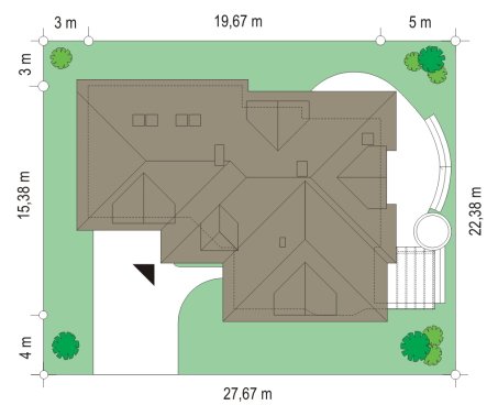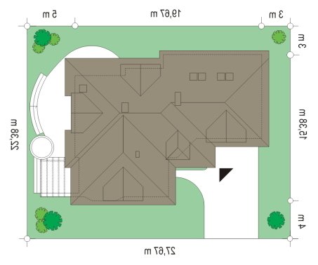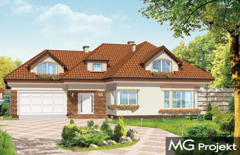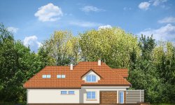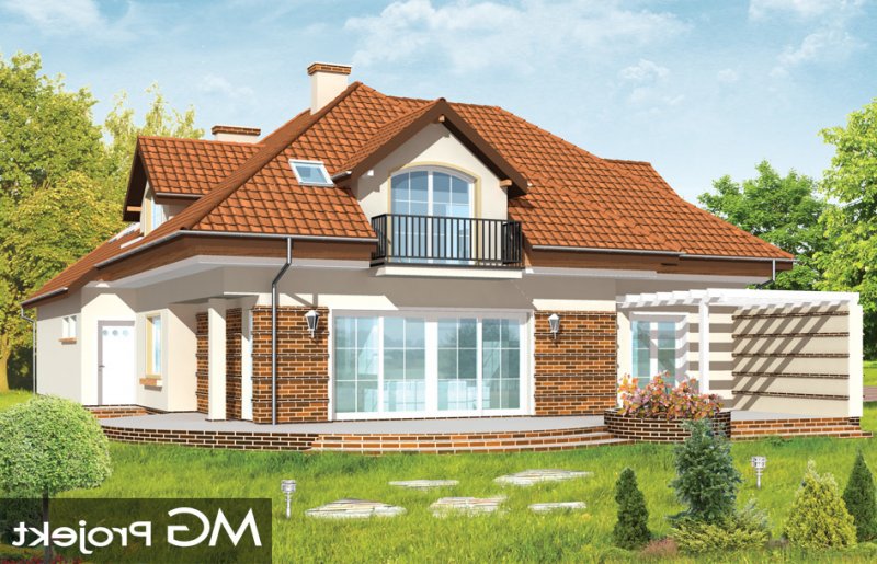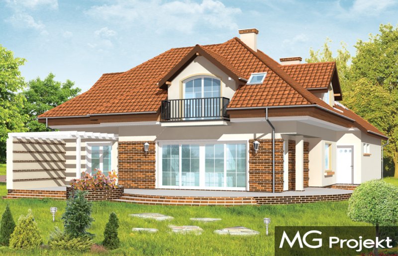 Siedziba, to komfortowy dom dla 4-5 cioosobowej rodziny. Łączy w sobie elementy tradycyjnej architektury z nowoczesnością. Atrakcyjna, rozbudowana bryła domu z lukarnami, z wykuszowym oknem jadalni, tarasem z pergolą, czy podcieniem wejściowym połączone są w harmonijną całość. Daje ona wrażenie stabilizacji i spokoju. Wnętrze domku z wygodną sienią wejściową, ładnym holem z zabiegowymi schodami, dużym otwartym na ogród salonem - jest funkcjonalne i ciekawe. Dodatkowo zaprojektowane pomieszczenia na parterze i wygodne sypialnie na poddaszu - z osobnym apartamentem rodziców - dopełniają całość. Budynek jest duży, lecz jego wnętrza są logicznie zaprojektowane i przemyślane - bez niepotrzebnej straty powierzchni. Pracownia posiada odbicie lustrzane projektu.