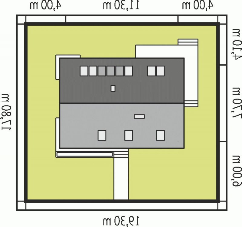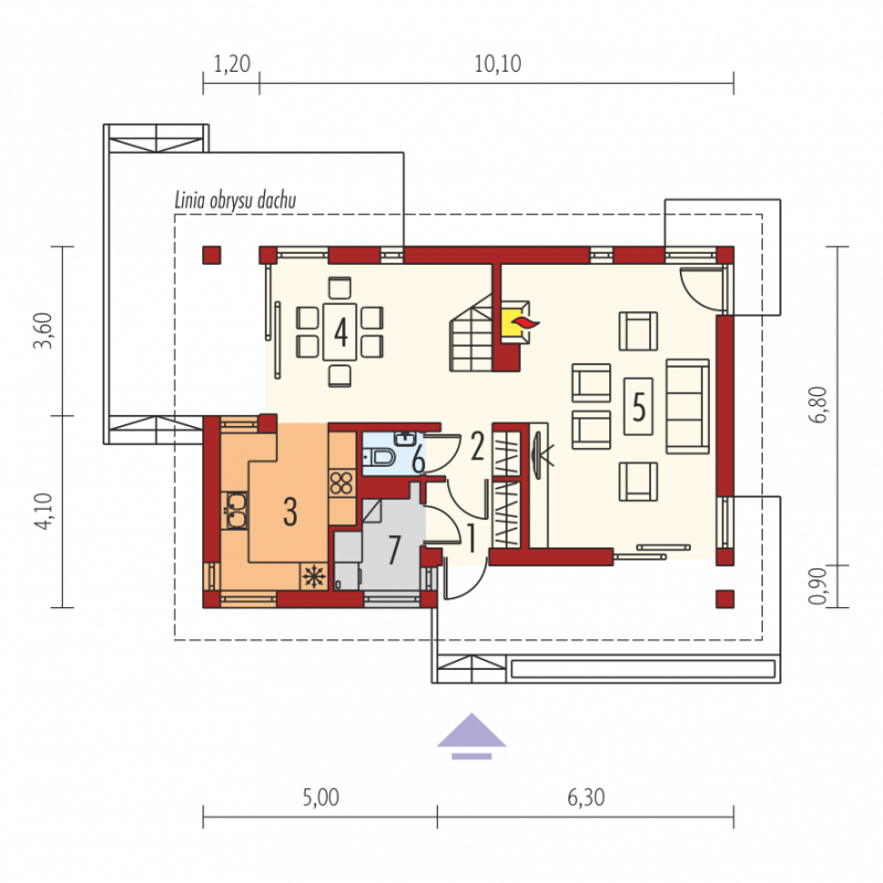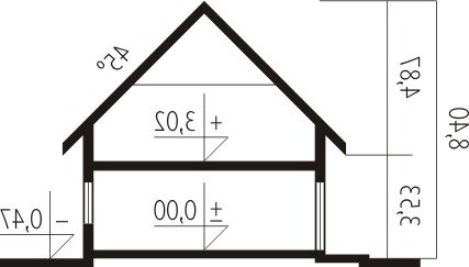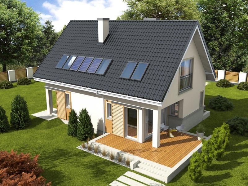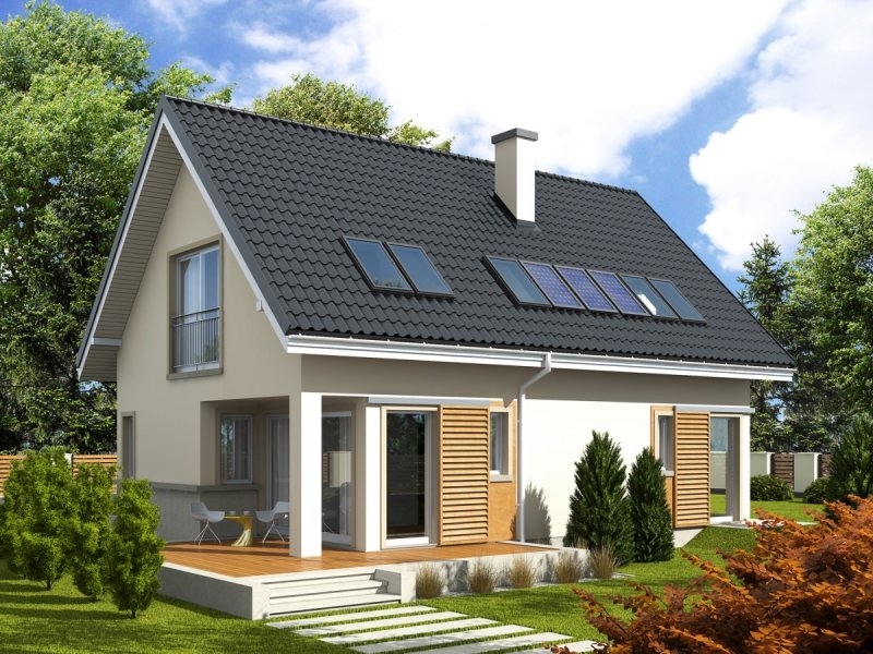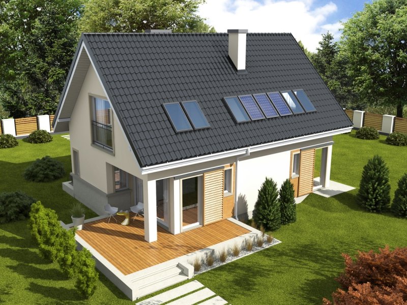 Dom zaprojektowany w technologii murowej ze stropem gęstożebrowym. Schody wewnętrzne drewniane. Dach o konstrukcji drewnianej pokryty dachówką ceramiczną Röben. Elewacje wykończono tynkiem mineralnym i okładziną drewnianą. Stolarka okienna drewniana lub PCV.