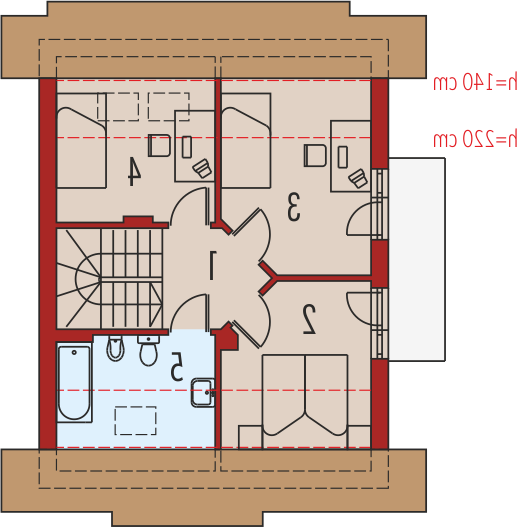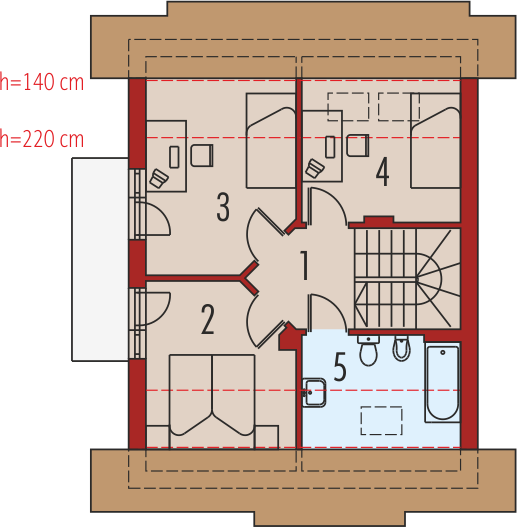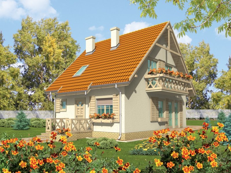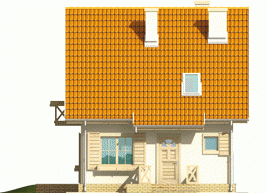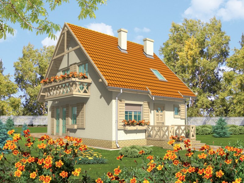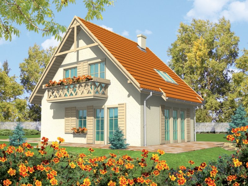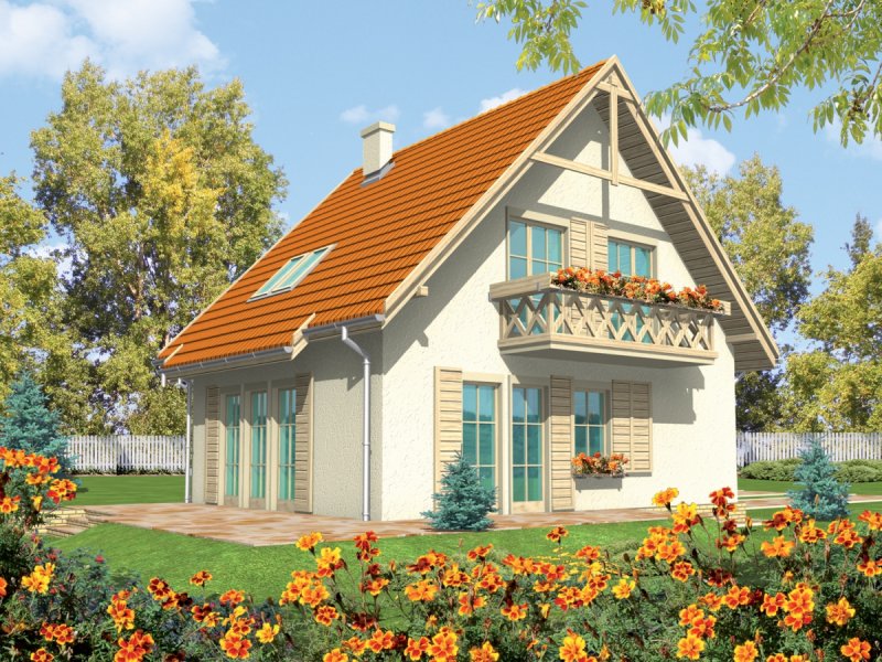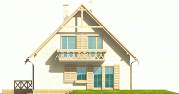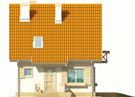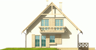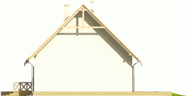 Dom parterowy z poddaszem użytkowym, niepodpiwniczony, przeznaczony dla 3-4-osobowej rodziny. Cechuje go prosta konstrukcja i przejrzysty układ funkcjonalny, wyróżnia ciekawa elewacja. Strefa dzienna na parterze to salon połą-czony z kuchnią i jadalnią, gabinet, toaleta i pomieszczenie gospodarcze. Strefę nocną na poddaszu tworzą trzy sypialnie i łazienka. Projekt występuje również w wersji z garażem jednostanowiskowym, nad którym zaprojektowano strych.
