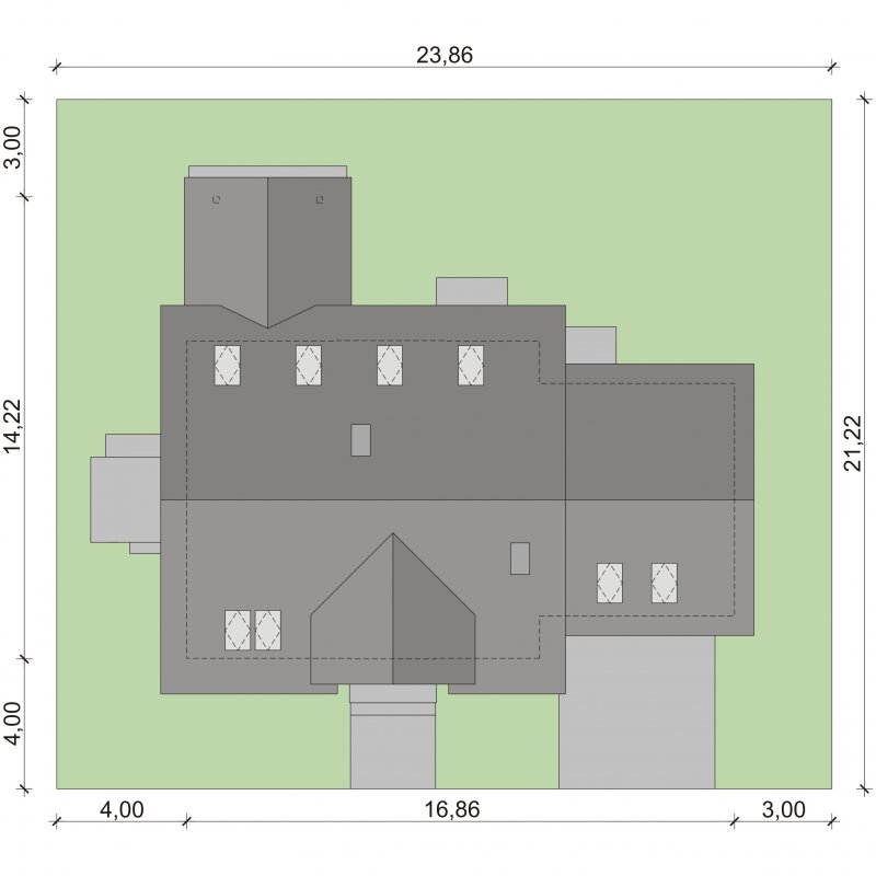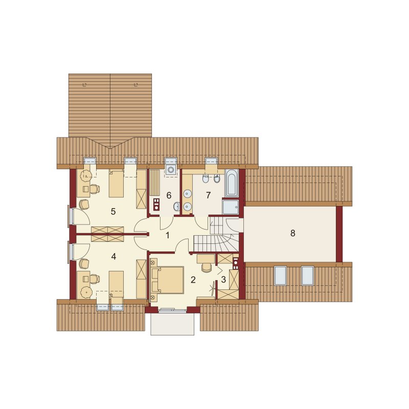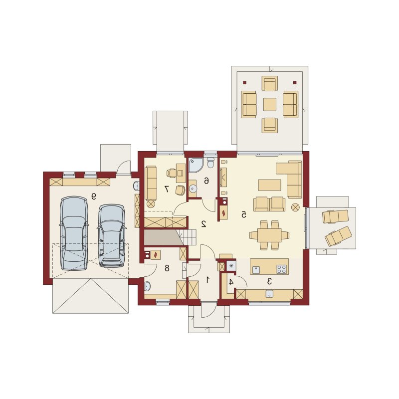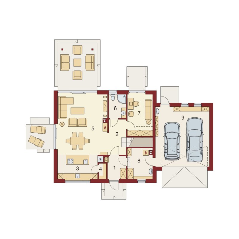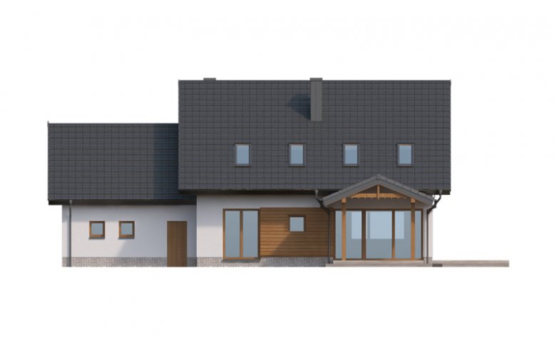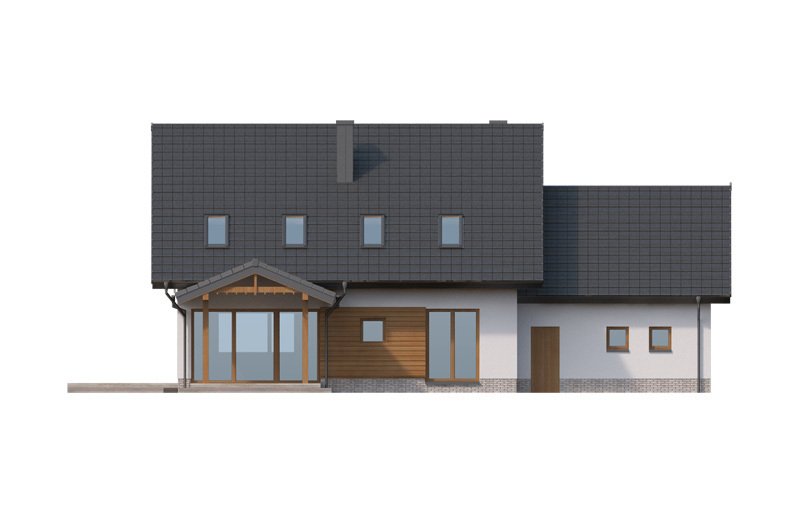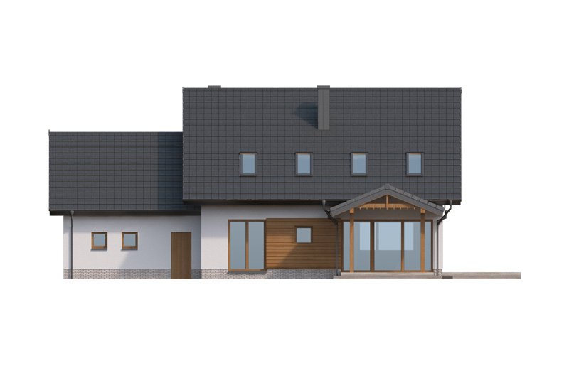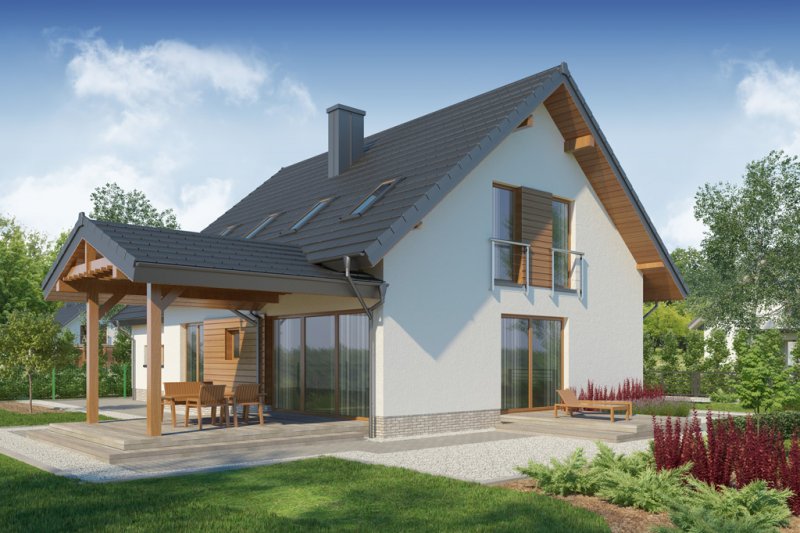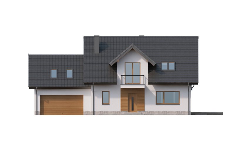 SOFOKLES 2 PS to dom parterowy z poddaszem użytkowym, zaprojektowany dla 4-5-osobowej rodziny. Na parterze znajduje się przestronny salon z jadalnią, centralnie zlokalizowanym kominkiem i wyjściem na zadaszony taras, łatwa do wydzielenia w ramach adaptacji kuchnia ze spiżarnią oraz gabinet, który wraz ze położoną przy nim łazienką doskonale sprawdzi się także jako pokój gościnny lub dodatkowa sypialnia. Dopełnieniem całości jest obszerne pomieszczenie gospodarcze z przejściem do dwustanowiskowego garażu, uzupełnianego z kolei o podręczne pomieszczenie gospodarcze pod schodami. Na poddaszu znajdziemy trzy przestronne pokoje (w tym jeden z własną garderobą i balkonem) oraz łazienkę, osobną pralnię i strych, który można zaadaptować na pokój hobby.