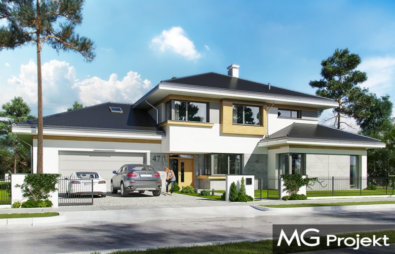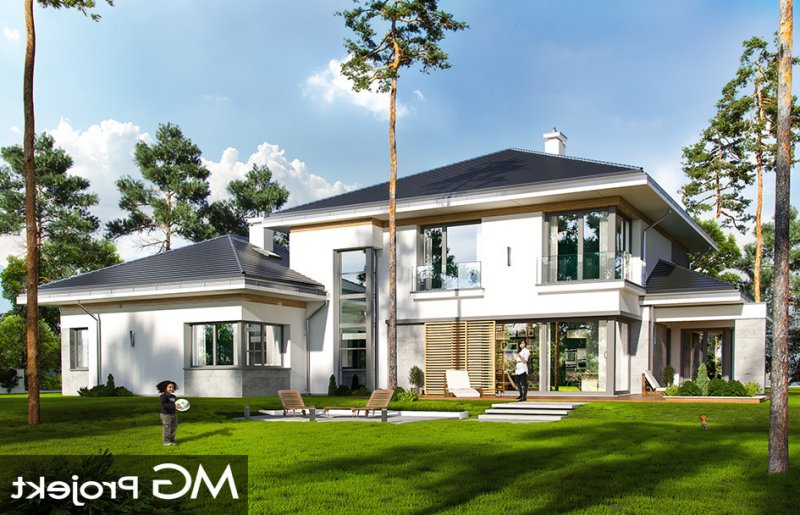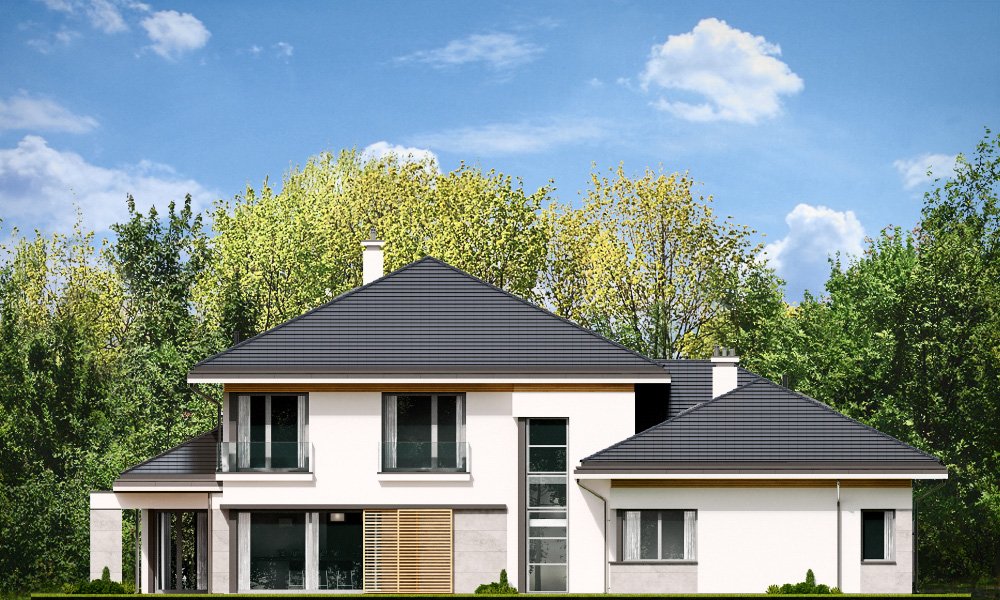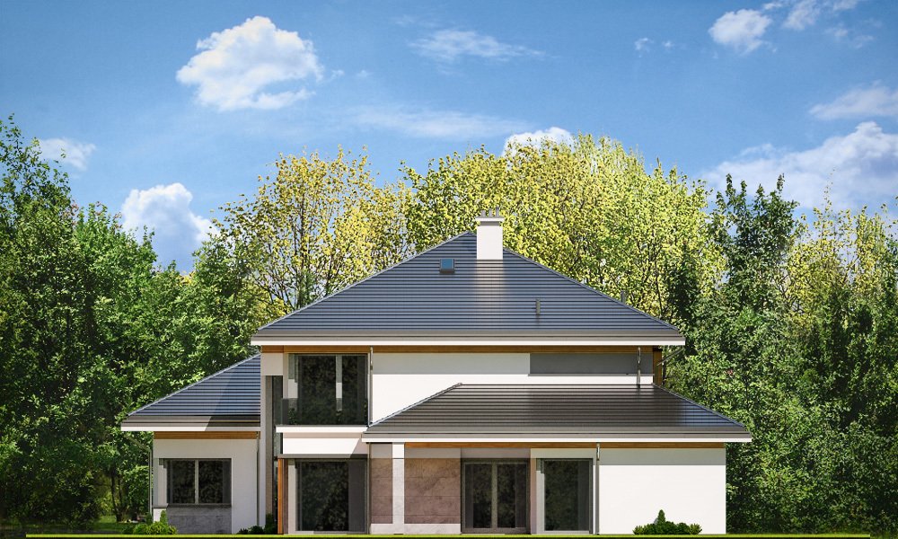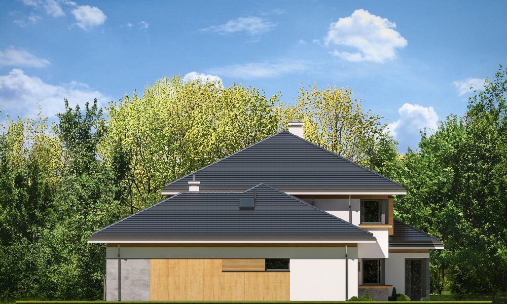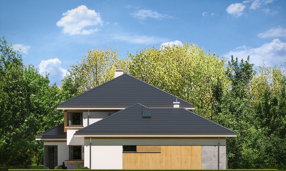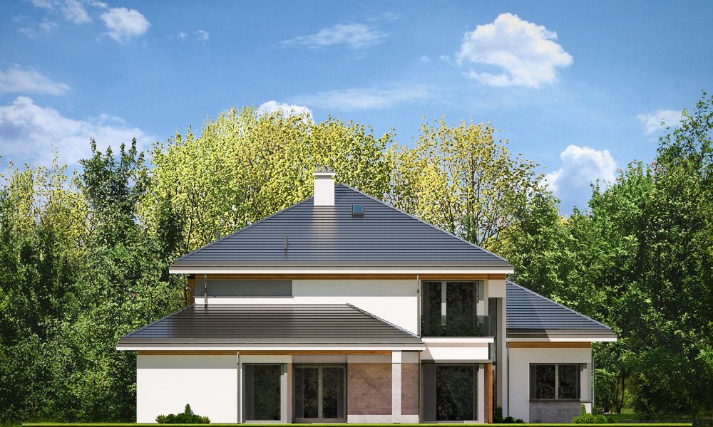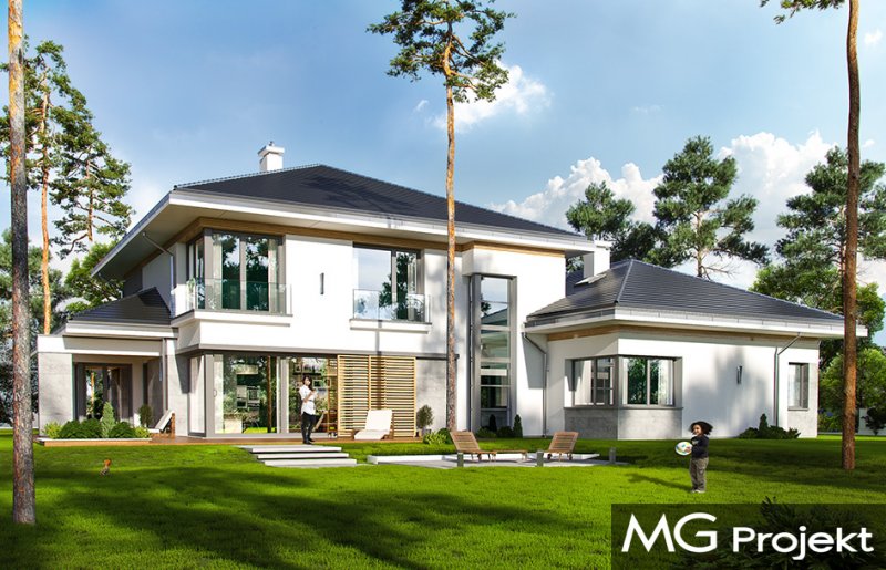 Spokojny zakątek to projekt piętrowej luksusowej willi miejskiej, przeznaczonej dla 4-6cioosobowej rodziny. Jest to projekt bardzo komfortowego, nowoczesnej rezydencji, dla wymagających inwestorów, ceniących dobrą architekturę i luksus w funkcjonalnym przestronnym wnętrzu. Dom składa się z zasadniczej prostopadłościennej bryły na planie kwadratu, przykrytej kopertowym dachem, oraz dodatkowych dwóch niższych brył - garażowej i drugiej przekrywającej pokój rekreacyjny i zadaszony taras. Z zewnątrz dom prezentuje się dostojnie - reprezentacyjnie i trochę surowo od frontu, aby od strony ogrodowej emanować spokojem. Duże przeszklone powierzchnie okien zdobią elewacje i otwierają wnętrze na ogród. Na parterze zaprojektowaliśmy piękną przestrzeń dzienną, z salonem, wielką kuchnią z wyspą, bardzo efektownymi schodami naprzeciwko wejścia, jadalnią i dodatkowym pokojem rekreacyjnym - takim drugim zamkniętym salonem, gdzie można zainstalować sobie na przykład dobre kino domowe, albo urządzić pokój fitness. Na parterze mamy też wielki garaż, dodatkowy pokój z łazienką, oraz duże pomieszczenie gospodarcze. Narożne przeszklenia z salonu, czy piękny zadaszony taras- weranda z jadalni otwierają dom na ogród. Na piętrze mamy aż cztery wygodne sypialnie z garderobami i dwiema łazienkami ( właściwie salonami kąpielowymi ). Sypialnie rodziców to osobny apartament z własną łazienką i garderobą. Na piętrze mamy dodatkowo pralnię – suszarnię, oraz strych dostępny z części garażowo-gospodarczej domu. Dom, choć duży, mieści w sobie bardzo racjonalnie zakomponowaną przestrzeń. Nie ma tutaj żadnego marnotrawstwa, a jednocześnie uzyskano efekt luksusu dużej przestrzeni. Dom jest energooszczędny. Mimo swojej wielkości nie powinien być bardzo drogi w budowie, ani bardzo kosztowny w późniejszym utrzymaniu.