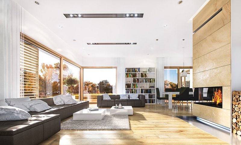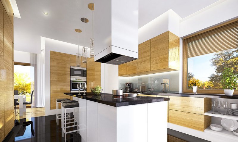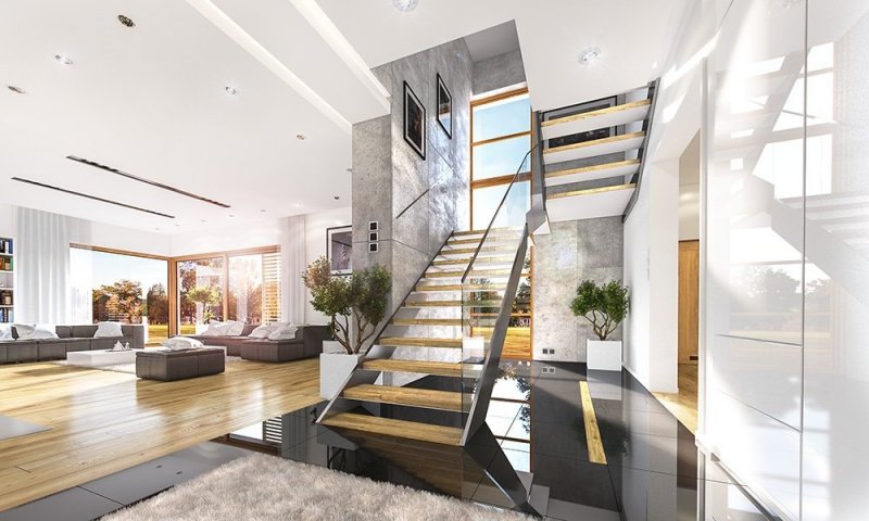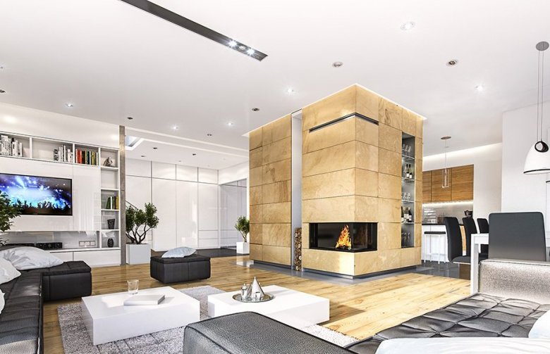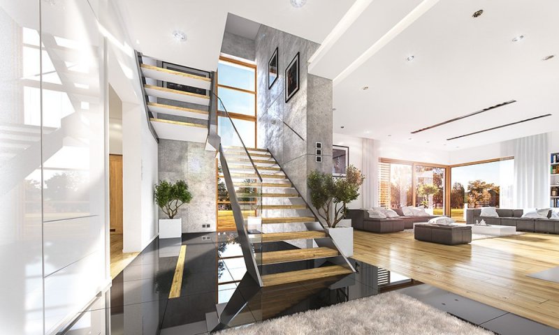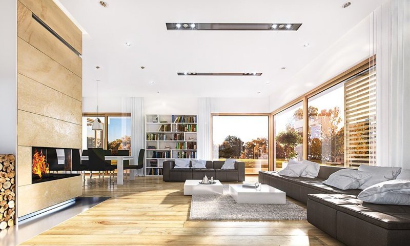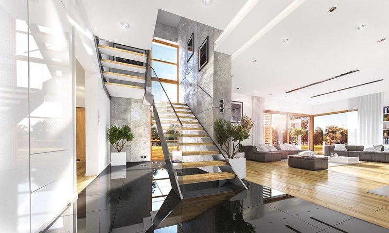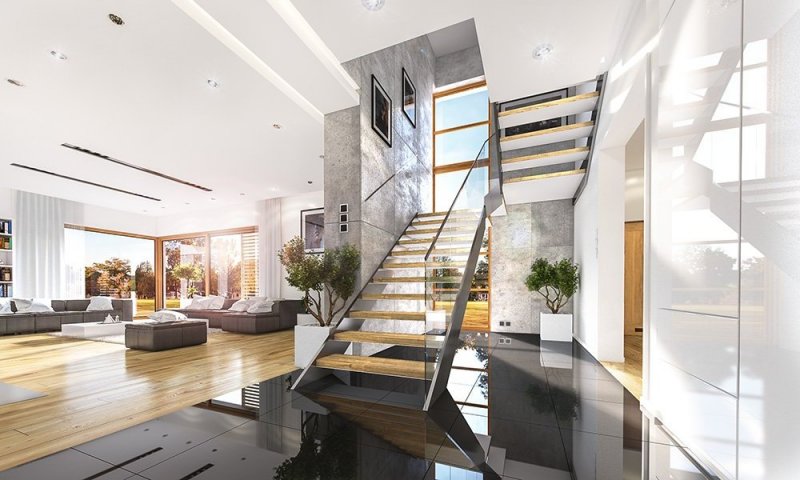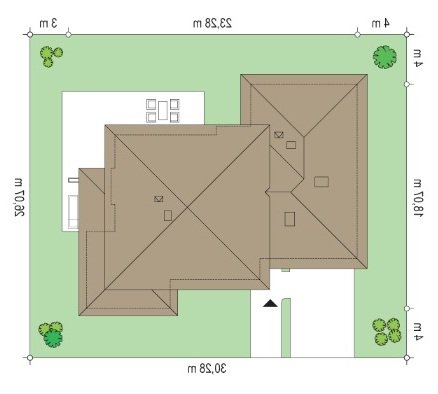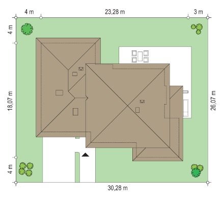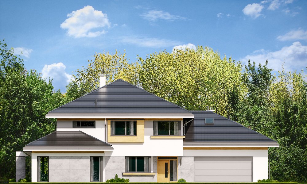 Spokojny zakątek to projekt piętrowej luksusowej willi miejskiej, przeznaczonej dla 4-6cioosobowej rodziny. Jest to projekt bardzo komfortowego, nowoczesnej rezydencji, dla wymagających inwestorów, ceniących dobrą architekturę i luksus w funkcjonalnym przestronnym wnętrzu. Dom składa się z zasadniczej prostopadłościennej bryły na planie kwadratu, przykrytej kopertowym dachem, oraz dodatkowych dwóch niższych brył - garażowej i drugiej przekrywającej pokój rekreacyjny i zadaszony taras. Z zewnątrz dom prezentuje się dostojnie - reprezentacyjnie i trochę surowo od frontu, aby od strony ogrodowej emanować spokojem. Duże przeszklone powierzchnie okien zdobią elewacje i otwierają wnętrze na ogród. Na parterze zaprojektowaliśmy piękną przestrzeń dzienną, z salonem, wielką kuchnią z wyspą, bardzo efektownymi schodami naprzeciwko wejścia, jadalnią i dodatkowym pokojem rekreacyjnym - takim drugim zamkniętym salonem, gdzie można zainstalować sobie na przykład dobre kino domowe, albo urządzić pokój fitness. Na parterze mamy też wielki garaż, dodatkowy pokój z łazienką, oraz duże pomieszczenie gospodarcze. Narożne przeszklenia z salonu, czy piękny zadaszony taras- weranda z jadalni otwierają dom na ogród. Na piętrze mamy aż cztery wygodne sypialnie z garderobami i dwiema łazienkami ( właściwie salonami kąpielowymi ). Sypialnie rodziców to osobny apartament z własną łazienką i garderobą. Na piętrze mamy dodatkowo pralnię – suszarnię, oraz strych dostępny z części garażowo-gospodarczej domu. Dom, choć duży, mieści w sobie bardzo racjonalnie zakomponowaną przestrzeń. Nie ma tutaj żadnego marnotrawstwa, a jednocześnie uzyskano efekt luksusu dużej przestrzeni. Dom jest energooszczędny. Mimo swojej wielkości nie powinien być bardzo drogi w budowie, ani bardzo kosztowny w późniejszym utrzymaniu.