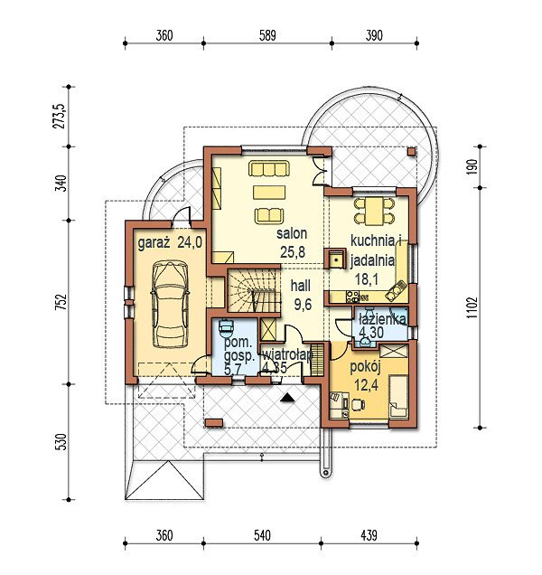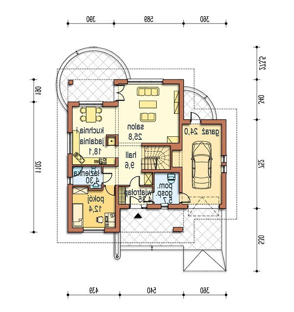 Część dzienna na parterze składa się z przedsionka, hallu, gabinetu od strony wejściowej, kuchni z jadalnią otwartej na salon kominkowy. Od frontu zlokalizowano wygodny jednostanowiskowy garaż i kotłownię.