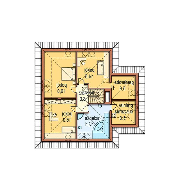 Część nocną na poddaszu tworzą: trzy bardzo wygodne sypialnie, w tym jedna z garderobą, duża łazienka oraz pomieszczenie pralni-suszarni, doświetlone oknami połaciowymi.